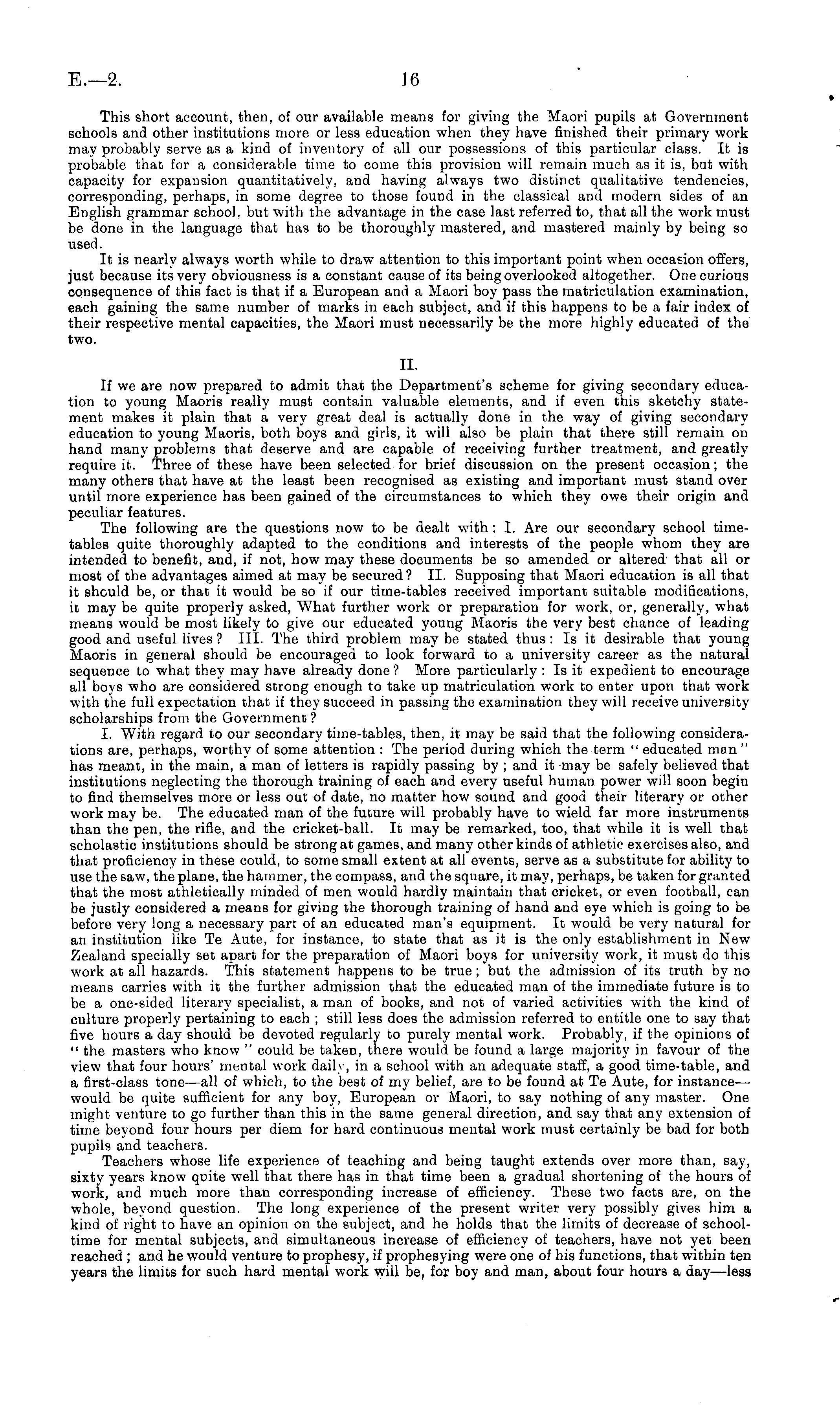 This short account, then, of our available means for giving the Maori pupils at Government schools and other institutions more or less education when they have finished their primary work may probably serve as a kind of inventory of all our possessions of this particular class. It is probable that for a considerable time to come this provision will remain much as it is, but with capacity for expansion quantitatively, and having always two distinct qualitative tendencies, corresponding, perhaps, in some degree to those found in the classical and modern sides of an English grammar school, but with the advantage in the case last referred to, that all the work must be done in the language that has to be thoroughly mastered, and mastered mainly by being so used. It is nearly always worth while to draw attention to this important point when occasion offers, just because its very obviousness is a constant cause of its being overlooked altogether. One curious consequence of this fact is that if a European and a Maori boy pass the matriculation examination, each gaining the same number of marks in each subject, and if this happens to be a fair index of their respective mental capacities, the Maori must necessarily be the more highly educated of the two. 11. If we are now prepared to admit that the Department's scheme for giving secondary education to young Maoris really must contain valuable elements, and if even this sketchy statement makes it plain that a very great deal is actually done in the way of giving secondary education to young Maoris, both boys and girls, it will also be plain that there still remain on hand many problems that deserve and are capable of receiving further treatment, and greatly require it. Three of these have been selected for brief discussion on the present occasion; the many others that have at the least been recognised as existing and important must stand over until more experience has been gained of the circumstances to which they owe their origin and peculiar features. The following are the questions now to be dealt with : I. Are our secondary school timetables quite thoroughly adapted to the conditions and interests of the people whom they are intended to benefit, and, if not, how may these documents be so amended or altered that all or most of the advantages aimed at may be secured? 11. Supposing that Maori education is all that it should be, or that it would be so if our time-tables received important suitable modifications, it may be quite properly asked, What further work or preparation for work, or, generally, what means would be most likely to give our educated young Maoris the very best chance of leading good and useful lives ? 111. The third problem may be stated thus :Is it desirable that young Maoris in general should be encouraged to look forward to a university career as the natural sequence to what they may have already done? More particularly : Is it expedient to encourage all boys who are considered strong enough to take up matriculation work to enter upon that work with the full expectation that if they succeed in passing the examination they will receive university scholarships from the Government ? I. With regard to our secondary time-tables, then, it may be said that the following considerations are, perhaps, worthy of some attention : The period during which the term " educated man " has meant, in the main, a man of letters is rapidly passing by ; and it may be safely believed that institutions neglecting the thorough training of each and every useful human power will soon begin to find themselves more or less out of date, no matter how sound and good their literary or other work may be. The educated man of the future will probably have to wield far more instruments than the pen, the rifle, and the cricket-ball. It may be remarked, too, that while it is well that scholastic institutions should be strong at games, and many other kinds of athletic exercises also, and that proficiency in these could, to some small extent at all events, serve as a substitute for ability to use the saw, the plane, the hammer, the compass, and the square, it may, perhaps, be taken for granted that the most athletically minded of men would hardly maintain that cricket, or even football, can be justly considered a means for giving the thorough training of hand and eye which is going to be before very long a necessary part of an educated man's equipment. It would be very natural for an institution like Te Aute, for instance, to state that as it is the only establishment in New Zealand specially set apart for the preparation of Maori boys for university work, it must do this work at all hazards. This statement happens to be true ; but the admission of its truth by no means carries with it the further admission that the educated man of the immediate future is to be a one-sided literary specialist, a man of books, and not of varied activities with the kind of culture properly pertaining to each ; still less does the admission referred to entitle one to say that five hours a day should be devoted regularly to purely mental work. Probably, if the opinions of " the masters who know " could be taken, there would be found a large majority in favour of the view that four hours' mental work daily, in a school with an adequate staff, a good time-table, and a first-class tone—all of which, to the best of my belief, are to be found at Te Aute, for instance— would be quite sufficient for any boy, European or Maori, to say nothing of any master. One might venture to go further than this in the same general direction, and say that any extension of time beyond four hours per diem for hard continuous mental work must certainly be bad for both pupils and teachers. Teachers whose life experience of teaching and being taught extends over more than, say, sixty years know quite well that there has in that time been a gradual shortening of the hours of work, and much more than correspondi