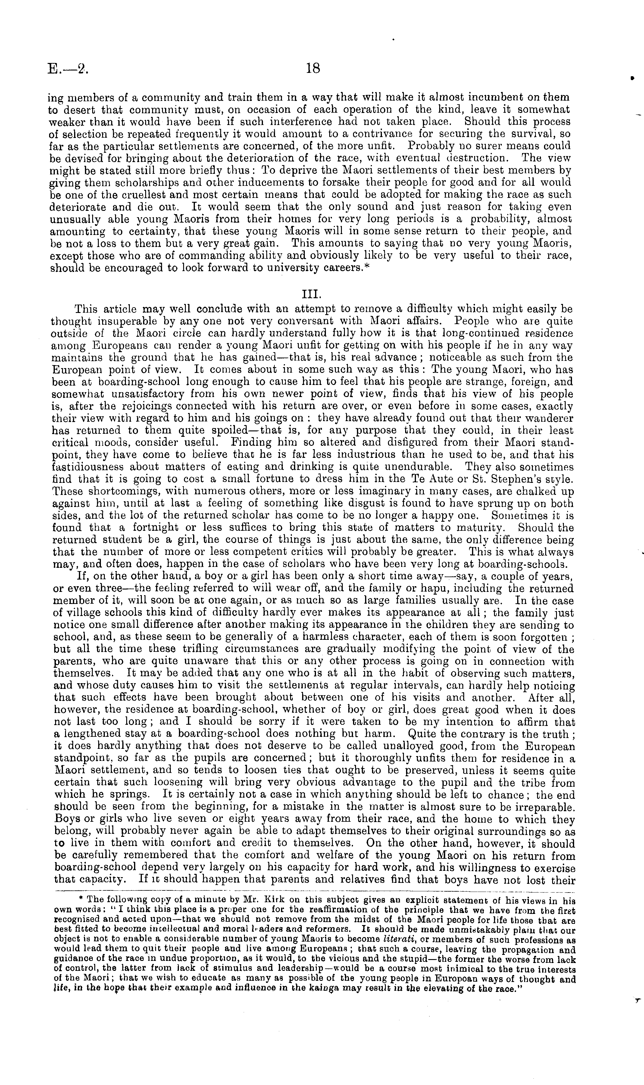 ing members of a community and train them in a way that will make it almost incumbent on them to desert that community must, on occasion of each operation of the kind, leave it somewhat weaker than it would have been if such interference had not taken place. Should this process of selection be repeated frequently it would amount to a contrivance for securing the survival, so far as the particular settlements are concerned, of the more unfit. Probably no surer means could be devised for bringing about the deterioration of the race, with eventual destruction. The view might be stated still more briefly thus: To deprive the Maori settlements of their best members by giving them scholarships and other inducements to forsake their people for good and for all would be one of the cruellest and most certain means that could be adopted for making the race as such deteriorate and die out. It would seem that the only sound and just reason for taking even unusually able young Maoris from their homes for very long periods is a probability, almost amounting to certainty, that these young Maoris will in some sense return to their people, and be not a loss to them but a very great gain. This amounts to saying that no very young Maoris, except those who are of commanding ability and obviously likely to be very useful to their race, should be encouraged to look forward to university careers.* 111. This article may well conclude with an attempt to remove a difficulty which might easily be thought insuperable by any one not very conversant with Maori affairs. People who are quite outside of the Maori circle can hardly understand fully how it is that long-continued residence among Europeans can render a young Maori unfit for getting on with his people if he in any way maintains the ground that he has gained—that is, his real advance ; noticeable as such from the European point of view. It conies about in some such way as this : The young Maori, who has been at boarding-school long enough to cause him to feel that his people are strange, foreign, and somewhat unsatisfactory from his own newer point of view, finds that his view of his people is, after the rejoicings connected with his return are over, or even before in some cases, exactly their view with regard to him and his goings on : they have already found out that their wanderer has returned to them quite spoiled—that is, for any purpose that they could, in their least critical moods, consider useful. Finding him so altered and disfigured from their Maori standpoint, they have come to believe that he is far less industrious than he used to be, and that his fastidiousness about matters of eating and drinking is quite unendurable. They also sometimes find that it is going to cost a small fortune to dress him in the Te Aute or St. Stephen's style. These shortcomings, with numerous others, more or less imaginary in many cases, are chalked up against him, until at last a feeling of something like disgust is found to have sprung up on both sides, and the lot of the returned scholar has come to be no longer a happy one. Sometimes it is found that a fortnight or less suffices to bring this state of matters to maturity. Should the returned student be a girl, the course of things is just about the same, the only difference being that the number of more or less competent critics will probably be greater. This is what always may, and often does, happen in the case of scholars who have been very long at boarding-schools. If, on the other hand, a boy or a girl has been only a short time away—say, a couple of years, or even three —the feeling referred to will wear off, and the family or hapu, including the returned member of it, will soon be at one again, or as much so as large families usually are. In the case of village schools this kind of difficulty hardly ever makes its appearance at all; the family just notice one small difference after another making its appearance in the children they are sending to school, and, as these seem to be generally of a harmless character, each of them is soon forgotten ; but all the time these trifling circumstances are gradually modifying the point of view of the parents, who are quite unaware that this or any other process is going on in connection with themselves. It may be added that any one who is at all in the habit of observing such matters, and whose duty causes him to visit the settlements at regular intervals, can hardly help noticing that such effects have been brought about between one of his visits and another. After all, however, the residence at boarding-school, whether of boy or girl, does great good when it does not last too long ; and I should be sorry if it were taken to be my intention to affirm that a lengthened stay at a boarding-school does nothing but harm. Quite the contrary is the truth ; it does hardly anything that does not deserve to be called unalloyed good, from the European standpoint, so far as the pupils are concerned; but it thoroughly unfits them for residence in a Maori settlement, and so tends to loosen ties that ought to be preserved, unless it seems quite certain that such loosening will bring very obvious advantage to the pupil and the tribe from which he springs. It is certainly not a case in which anything should be left to chance ; the end should be seen from the beginning, for a mistake in the matter is almost sure to be irreparable. Boys or girls who live seven or eight years away from their race, and the home to which they belong, will probably never again be able to adapt themselves to their original surroundings so as to live in them with comfort and credit to themselves. On the other hand, however, it should be carefully remembered that the comfort and welfare of the young Maori on his return from boarding-school depend very largely on his capacity for hard work, and his willingness to exercise that capacity. If it should happen that parents and relatives find that boys have n