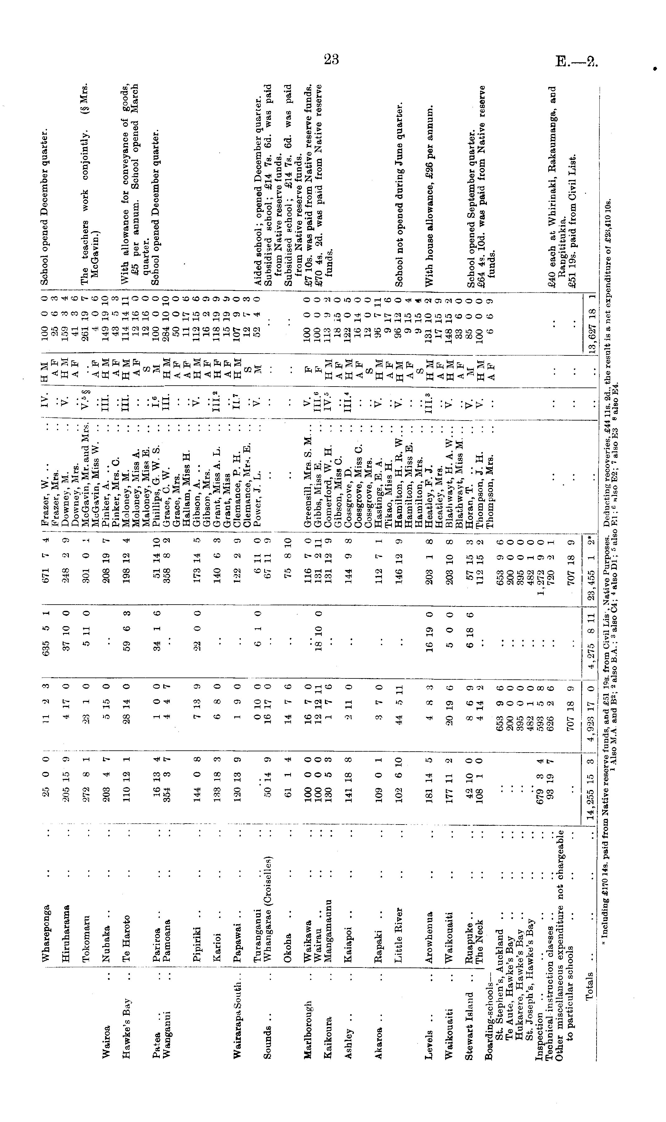 Whareponga 25 0 0 I 11 2 3 635 5 1 671 7 4 Frazer, W. .. Frazer, Mrs. Downey, M. Downey, Mrs. McGavin, Mr. and Mrs. McGavin, Miss W. .. Pinker, A. .. Pinker, Mrs. C. Moloney, M. Moloney, Miss A. Maloney, Miss E. Phillips, G. W. S. .. Grace, C. W. Grace, Mrs. Hallam, Miss H. Gibson, A. .. Gibson, Mrs. Grant, Miss A. L. Grant, Miss Clemance, P. H. Clemance, Mrs. E. .. Power, J. L. IV. V. H M A F H M A F 100 0 0 25 6 3 159 3 4 41 3 6 261 19 7 4 0 6 149 19 10 43 5 3 114 14 11 12 16 0 12 16 0 100 0 0 284 10 10 50 0 0 11 17 6 112 15 6 16 2 9 118 19 9 15 19 9 107 9 0 12 7 3 52 4 0 School opened December quarter. Hiruharama 205 15 9 4 17 0 37 10 0 248 2 9 The teachers work conjointly. (§ Mrs. McGavin.) Tokomaru 272 8 1 23 1 0 5 11 0 301 0 1 v.' 5 § AF HM A F HM AF S M HM A F A F H M AF H F AF H M S M Wairoa .. Nuhaka 203 4 7 5 15 0 208 19 7 iii. Hawke's Bay .. 1 Te Haroto Patea .. .. I Pariroa Wanganui .. Pamoana Pipiriki 110 12 1 16 13 4 354 3 7 144 0 8 28 14 0 1 0 0 4 4 7 59 6 3 198 12 4 51 14 10 358 8 2 iii. With allowance for conveyance of goods, £5 per annum. School opened March quarter. School opened December quarter. 34 1 6 in. 7 13 9 22 0 0 173 14 5 v. Karioi 133 18 3 6 8 0 140 6 3 III.2 Wairarapa South. . j Papawai .. 120 13 9 1 9 0 122 2 9 ii.' I | Turanganui .. .. | Sounds .. .. Whangarae (Croiselles) .. j Okoha .. .. .. i Marlborough .. Waikawa Wairau Kaikoura .. Mangamaunu 50 14 9 61 1 4 100 0 0 100 0 0 130 5 3 I 0 10 0 16 17 0 14 7 6 16 7 0 12 12 11 1 7 6 6 10 6 11 0 67 11 9 75 8 10 116 7 0 131 2 11 131 12 9 Greensill, Mrs. S. M... Gibbs, Miss E. Comerford, W. H. .. Gibson, Miss C. Cossgrove, D. Cossgrove, Miss C. Cossgrove, Mrs. Hastings, E. A. Tikao, Miss H. Hamilton, H. R. W... Hamilton, Miss E. .. Hamilton, Mrs. Heatley, F. J. Heatley, Mrs. Blathwayt, H. A. W... Blathwavt, Miss M. .. Horan.T. .. Thompson, J. H. Thompson, Mrs. v. v. hi." IV." F F H M A F H M A F S H M AF HM AF S HM A F H M A F M H M AF 100 0 0 100 0 0 113 9 2 18 15 0 122 0 5 16 14 0 12 0 0 96 7 11 9 17 6 96 12 0 9 15 4 9 15 4 131 10 2 17 15 9 148 15 2 33 6 0 85 0 0 100 0 0 6 6 9 Aided school; opened December quarter. Subsidised school; £14 7s. 6d. was paid from Native reserve funds. Subsidised school; £14 7s. 6d. was paid from Native reserve funds. £7 10s. was paid from Native reserve funds. £70 4s. 2d. was paid from Native reserve funds. 1810 0 Ashley .. .. Kaiapoi .. 141 18 8 2 11 0 144 9 8 iii.' _ .. Akaroa .. .. Rapaki 109 0 1 3 7 0 112 7 1 v. School not opened during June quarter. Little River .. .. 102 6 10 44 5 11 146 12 9 v. Levels .. .. Arowhenua 181 14 5 4 8 3 16 19 0 203 1 8 iii." With house allowance, £26 per annum. Waikouaiti .. Waikouaiti .. .. j 177 11 2 20 19 6 5 0 0 203 10 8 v. Stewart Island .. Ruapuke .. .. .. ■ The Neck .. .. I Boarding-schools — St. Stephen's, Auckland Te Aute, Hawke's Bay Hukarere, Hawke's Bay St. Joseph's, Hawke's Bay Inspection Technical instruction classes .. Other miscellaneous expenditure not chargeable to particular schools 42 10 0 108 1 0 679' 3 4 93 19 7 8 6 9 4 14 2 6 18 6 57 15 3 '. 112 15 2 v. v. School opened September quarter. £64 4s. lOd. was paid from Native reserve funds. 653 9 6 200 0 0 395 0 0 482 1 0 593 5 8 626 2 6 653 9 6 200 0 0 395 0 0 482 1 0 1,272 9 0 720 2 1 £40 each at Whirinaki, Rakaumanga, and Rangititukia. £51 19s. paid from Civil List. 707 18 9 707 18 9 Totals .. .. .. ..14 14,255 15 3 4,255 15 3 23,455 1 2*| 13,627 18 ll 4,923 17 0 4,275 8 11 ' Including £170 14s. paid from Native reserve funds, and £51 ISs 1 Also M.A. andB2; 2 a s. from Civil Lis-, Native Purposes. Deducting recoveries, .£44 lis. 2d., the rei also B.A.; 3 also C4; J also Dl; 5 also El; 6 „l s o E2; 1 also E3 8 also E4. lit is a net expenditure of .£2:1,410 10s.
