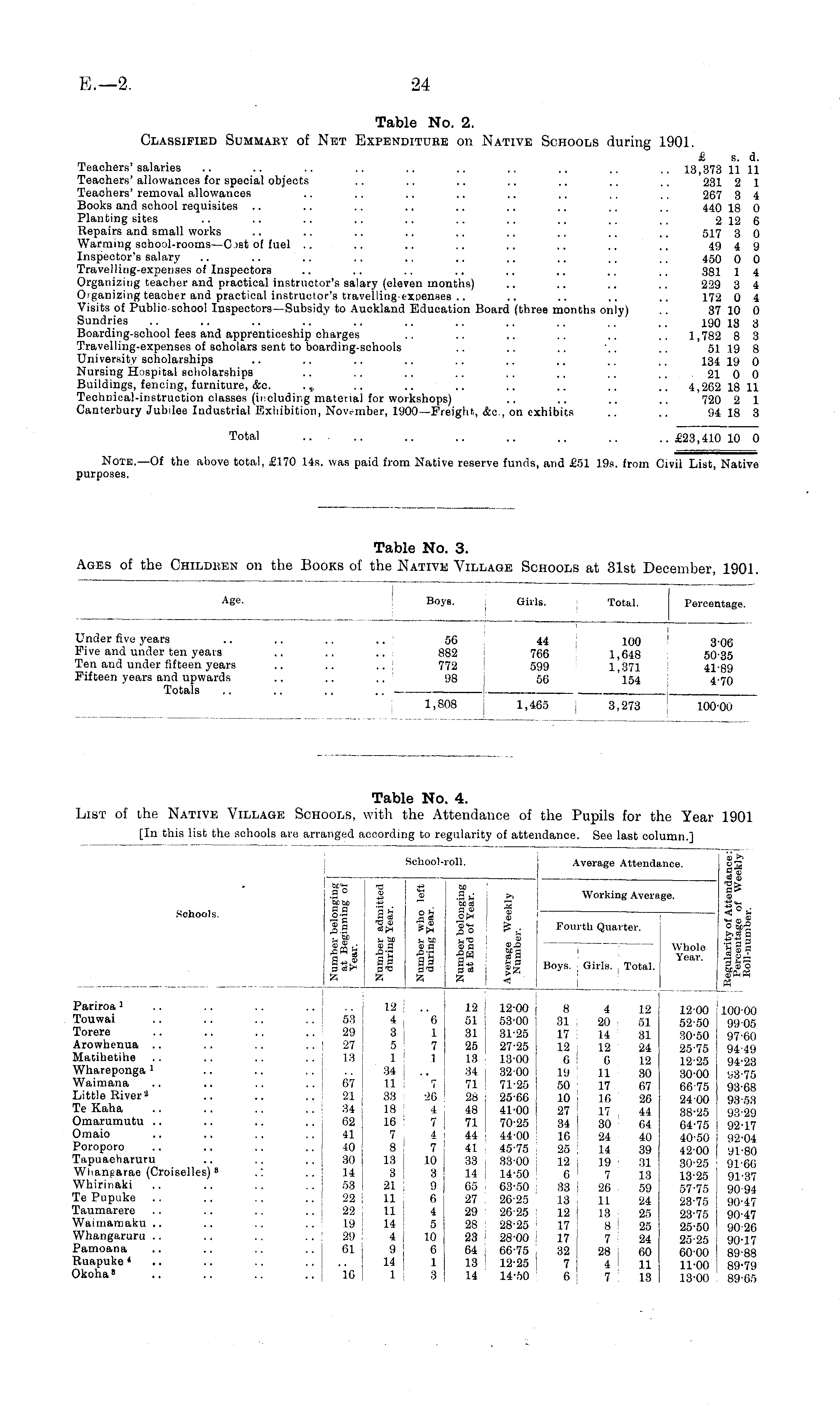 Table No. 4. List of the Native Village Schools, with the Attendance of the Pupils for the Year 1901