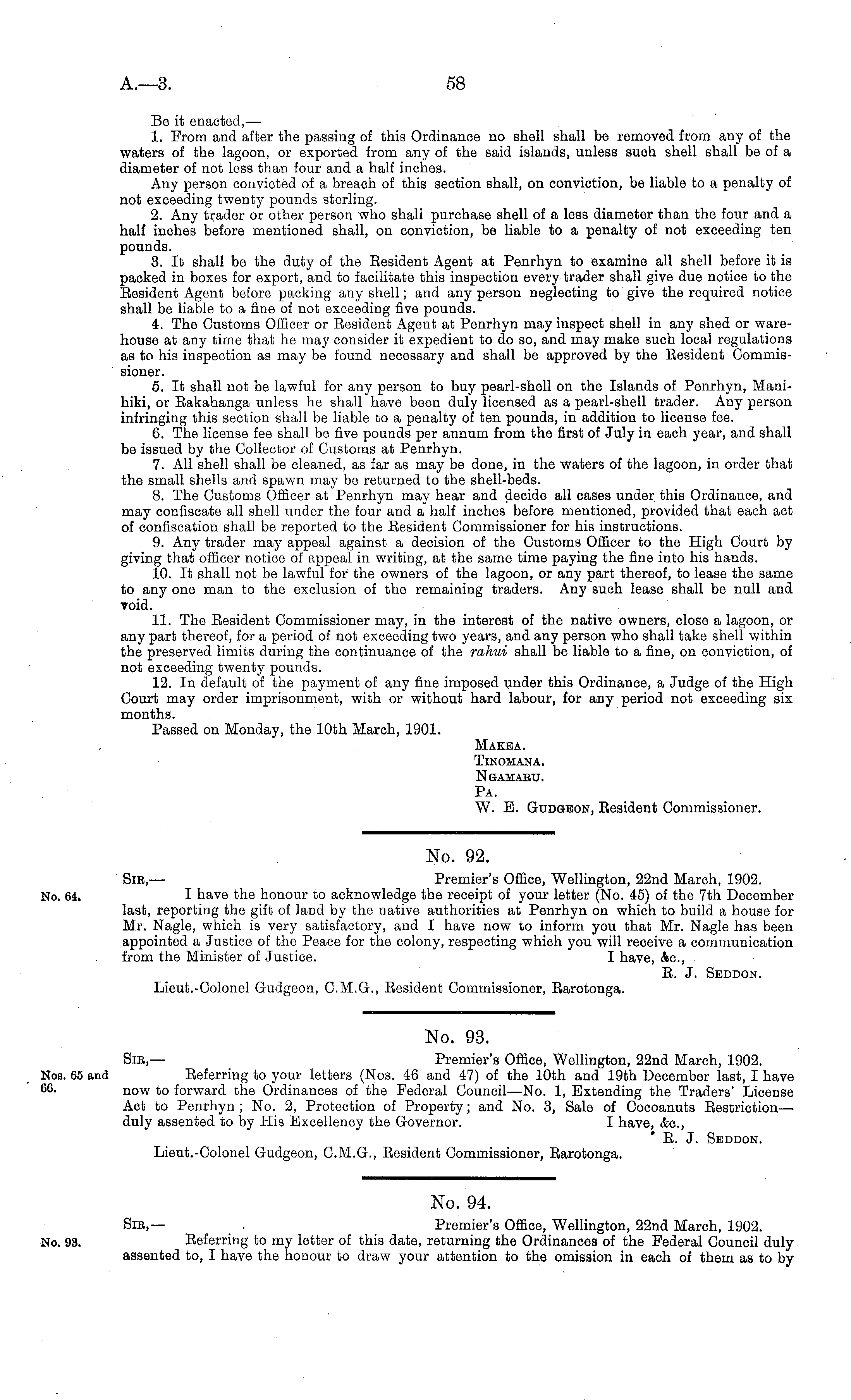 No. 93. Sic,— Premier's Office, Wellington, 22nd March, 1902. Beferring to your letters (Nos. 46 and 47) of the 10th and 19th December last, I have now to forward the Ordinances of the Federal Council—No. 1, Extending the Traders' License Act to Penrhyn; No. 2, Protection of Property; and No. 3, Sale of Cocoanuts Eestriction— duly assented to by His Excellency the Governor. I have, &c, E. J. Seddon. Lieut.-Colonel Gudgeon, C.M.G., Eesident Commissioner, Barotonga.