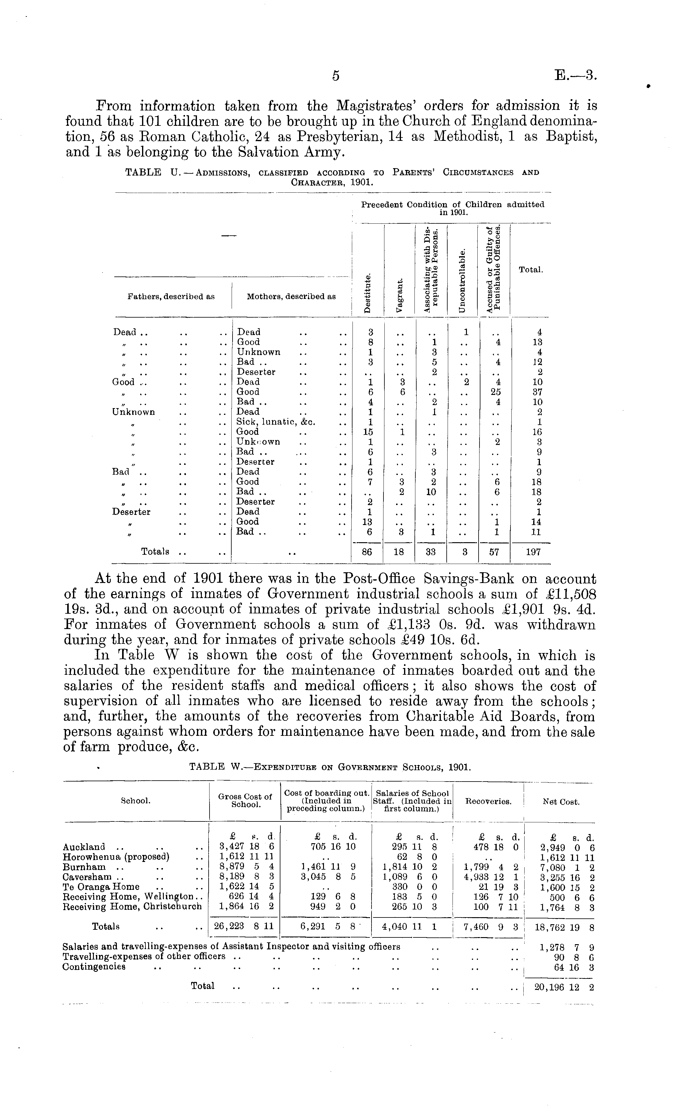 At the end of 1901 there was in the Post-Office Savings-Bank on account of the earnings of inmates of Government industrial schools a sum of £1 1,508 19s. 3d., and on account of inmates of private industrial schools £1,901 9s. 4d. For inmates of Government schools a sum of £1,133 os. 9d. was withdrawn during the year, and for inmates of private schools £49 10s. 6d. In Table W is shown the cost of the Government schools, in which is included the expenditure for the maintenance of inmates boarded out and the salaries of the resident staffs and medical officers; it also shows the cost of supervision of all inmates who are licensed to reside away from the schools; and, further, the amounts of the recoveries from Charitable Aid Boards, from persons against whom orders for maintenance have been made, and from the sale of farm produce, &c.