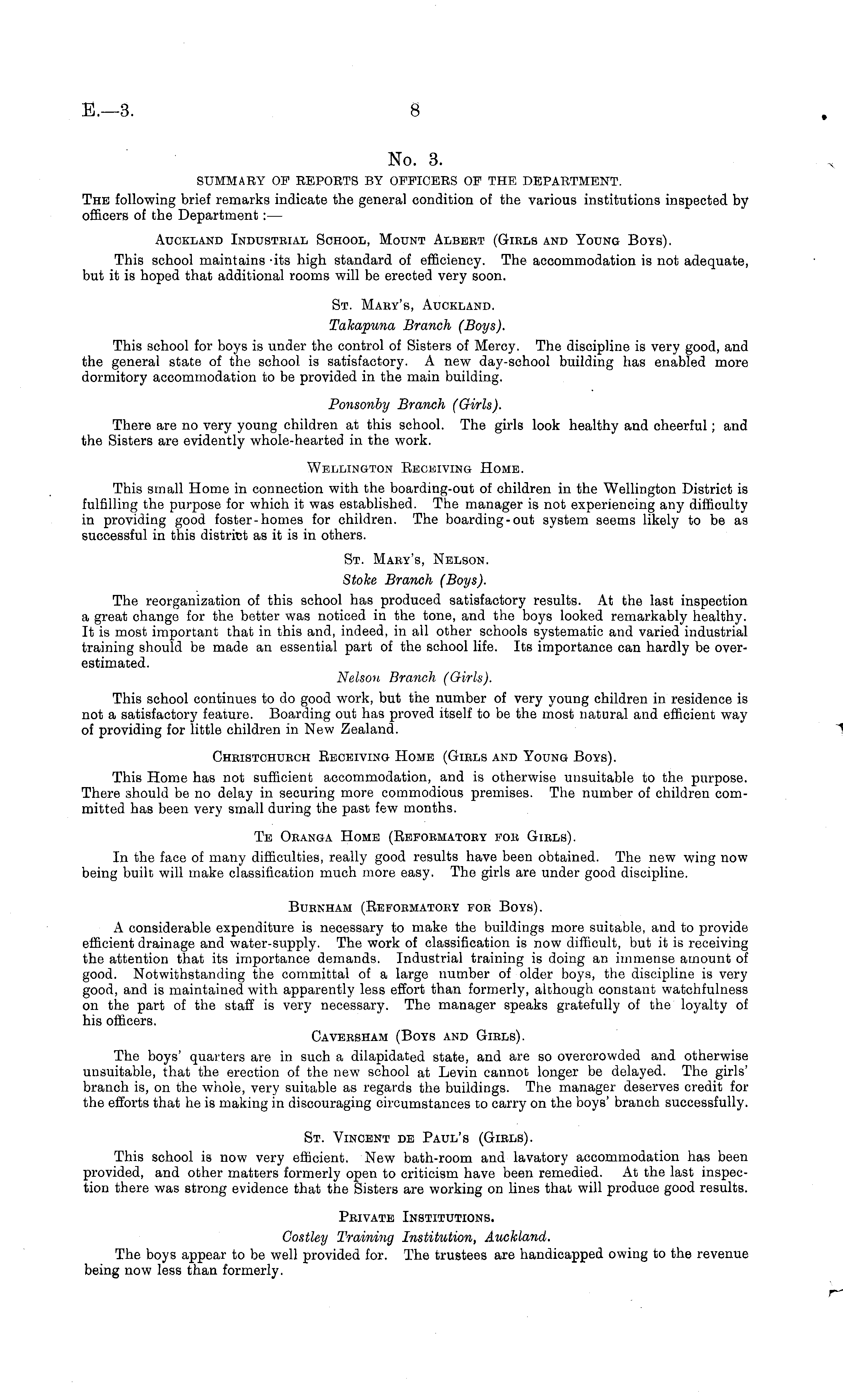 No. 3. SUMMARY OP REPORTS BY OFFICERS OF THE DEPARTMENT. The following brief remarks indicate the general condition of the various institutions inspected by officers of the Department : — Auckland Industrial School, Mount Albert (Girls and Young Boys). This school maintains -its high standard of efficiency. The accommodation is not adequate, but it is hoped that additional rooms will be erected very soon. St. Mary's, Auckland. Takapuna Branch (Boys). This school for boys is under the control of Sisters of Mercy. The discipline is very good, and the general state of the school is satisfactory. A new day-school building has enabled more dormitory accommodation to be provided in the main building. Ponsonby Branch (Girls). There are no very young children at this school. The girls look healthy and cheerful; and the Sisters are evidently whole-hearted in the work. Wellington Receiving Home. This small Home in connection with the boarding-out of children in the Wellington District is fulfilling the purpose for which it was established. The manager is not experiencing any difficulty in providing good foster-homes for children. The boarding-out system seems likely to be as successful in this district as it is in others. St. Mary's, Nelson. Stoke Branch (Boys). The reorganization of this school has produced satisfactory results. At the last inspection a great change for the better was noticed in the tone, and the boys looked remarkably healthy. It is most important that in this and, indeed, in all other schools systematic and varied industrial training should be made an essential part of the school life. Its importance can hardly be overestimated. Nelson Branch (Girls). This school continues to do good work, but the number of very young children in residence is not a satisfactory feature. Boarding out has proved itself to be the most natural and efficient way of providing for little children in New Zealand. Christchurch Eeceiving Home (Girls and Young Boys). This Home has not sufficient accommodation, and is otherwise unsuitable to the purpose. There should be no delay in securing more commodious premises. The number of children committed has been very small during the past few months. Te Oranga Home (Reformatory for Girls). In the face of many difficulties, really good results have been obtained. The new wing now being built will make classification much more easy. The girls are under good discipline. Burnham (Beformatoky for Boys). A considerable expenditure is necessary to make the buildings more suitable, and to provide efficient drainage and water-supply. The work of classification is now difficult, but it is receiving the attention that its importance demands. Industrial training is doing an immense amount of good. Notwithstanding the committal of a large number of older boys, the discipline is very good, and is maintained with apparently less effort than formerly, although constant watchfulness on the part of the staff is very necessary. The manager speaks gratefully of the loyalty of his officers. Caversham (Boys and Girls). The boys' quarters are in such a dilapidated state, and are so overcrowded and otherwise unsuitable, that the erection of the new school at Levin cannot longer be delayed. The girls' branch is, on the whole, very suitable as regards the buildings. The manager deserves credit for the efforts that he is making in discouraging circumstances to carry on the boys' branch successfully. St. Vincent de Paul's (Girls). This school is now very efficient. New bath-room and lavatory accommodation has been provided, and other matters formerly open to criticism have been remedied. At the last inspection there was strong evidence that the Sisters are working on lines that will produce good results. Private Institutions. Costley Training Institution, Auckland. The boys appear to be well provided for. The trustees are handicapped owing to the revenue being now less than formerly.