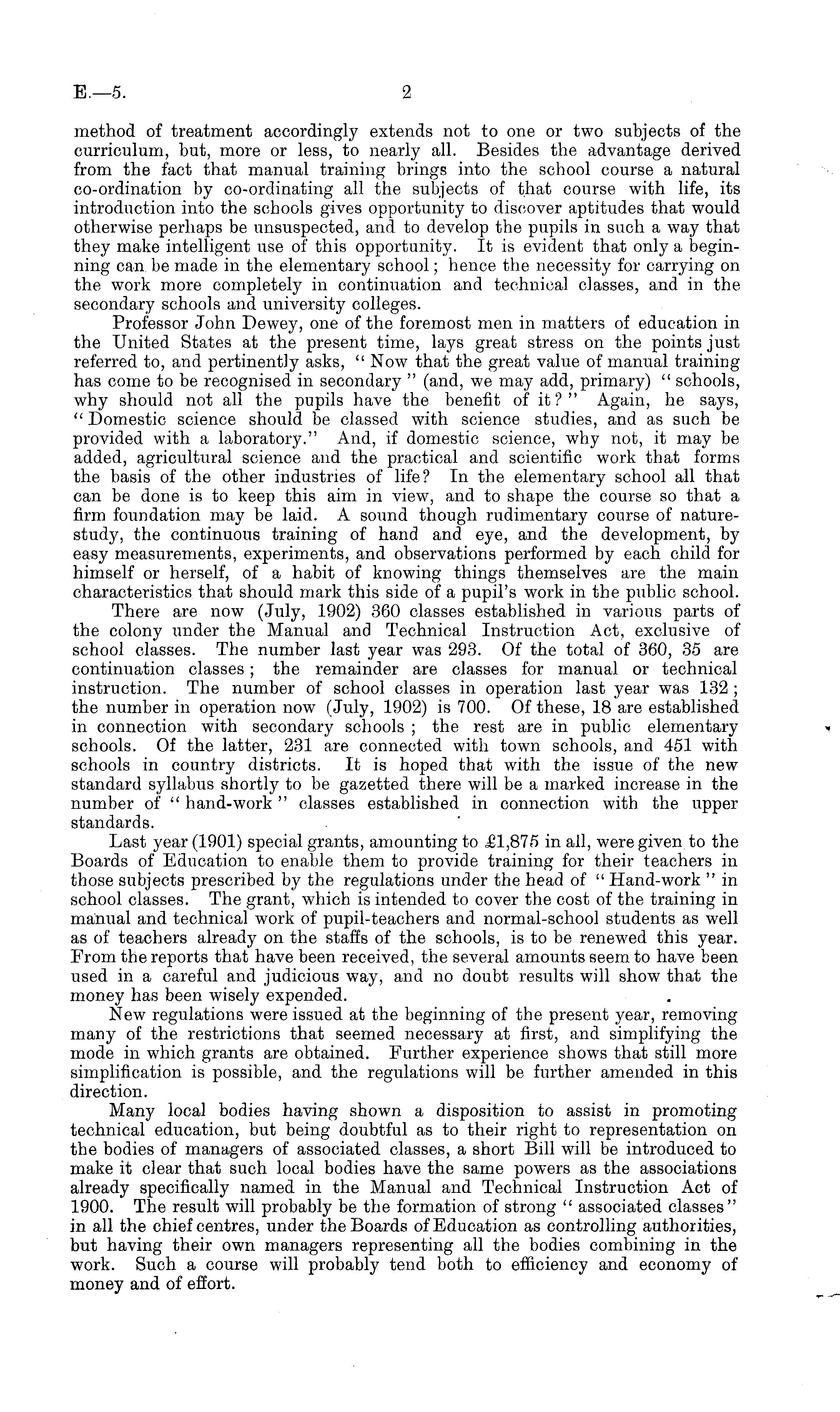 method of treatment accordingly extends not to one or two subjects of the curriculum, but, more or less, to nearly all. Besides the advantage derived from the fact that manual training brings into the school course a natural co-ordination by co-ordinating all the subjects of that course with life, its introduction into the schools gives opportunity to discover aptitttdes that would otherwise perhaps be unsuspected, and to develop the pupils in such a way that they make intelligent use of this opportunity. It is evident that only a beginning can be made in the elementary school; hence the necessity for carrying on the work more completely in continuation and technical classes, and in the secondary schools and university colleges. Professor John Dewey, one of the foremost men in matters of education in the United States at the present time, lays great stress on the points just referred to, and pertinently asks, " Now that the great value of manual training has come to be recognised in secondary " (and, we may add, primary) " schools, why should not all the pupils have the benefit of it?" Again, he says, " Domestic science should be classed with science studies, and as such be provided with a laboratory." And, if domestic science, why not, it may be added, agricultural science and the practical and scientific work that forms the basis of the other industries of life? In the elementary school all that can be done is to keep this aim in view, and to shape the course so that a firm foundation may be laid. A sound though rudimentary course of naturestudy, the continuous training of hand and eye, and the development, by easy measurements, experiments, and observations performed by each child for himself or herself, of a habit of knowing things themselves are the main characteristics that should mark this side of a pupil's work in the public school. There are now (July, 1902) 360 classes established in various parts of the colony under the Manual and Technical Instruction Act, exclusive of school classes. The number last year was 293. Of the total of 360, 35 are continuation classes ; the remainder are classes for manual or technical instruction. The number of school classes in operation last year was 132 ; the number in operation now (July, 1902) is 700. Of these, 18 are established in connection with secondary schools ; the rest are in public elementary schools. Of the latter, 231 are connected with town schools, and 451 with schools in country districts. It is hoped that with the issue of the new standard syllabus shortly to be gazetted there will be a marked increase in the number of " hand-work " classes established in connection with the upper standards. Last year (1901) special grants, amounting to £1,875 in all, were given to the Boards of Education to enable them to provide training for their teachers in those subjects prescribed by the regulations under the head of " Hand-work " in school classes. The grant, which is intended to cover the cost of the training in manual and technical work of pupil-teachers and normal-school students as well as of teachers already on the staffs of the schools, is to be renewed this year. From the reports that have been received, the several amounts seem to have been used in a careful and judicious way, and no doubt residts will show that the money has been wisely expended. New regulations were issued at the beginning of the present year, removing many of the restrictions that seemed necessary at first, and simplifying the mode in which grants are obtained. Further experience shows that still more simplification is possible, and the regulations will be further amended in this direction. Many local bodies having shown a disposition to assist in promoting technical education, but being doubtful as to their right to representation on the bodies of managers of associated classes, a short Bill will be introduced to make it clear that such local bodies have the same powers as the associations already specifically named in the Manual and Technical Instruction Act of 1900. The result will probably be the formation of strong " associated classes" in all the chief centres, under the Boards of Education as controlling authorities, but having their own managers representing all the bodies combining in the work. Such a course will probably tend both to efficiency and economy of money and of effort.