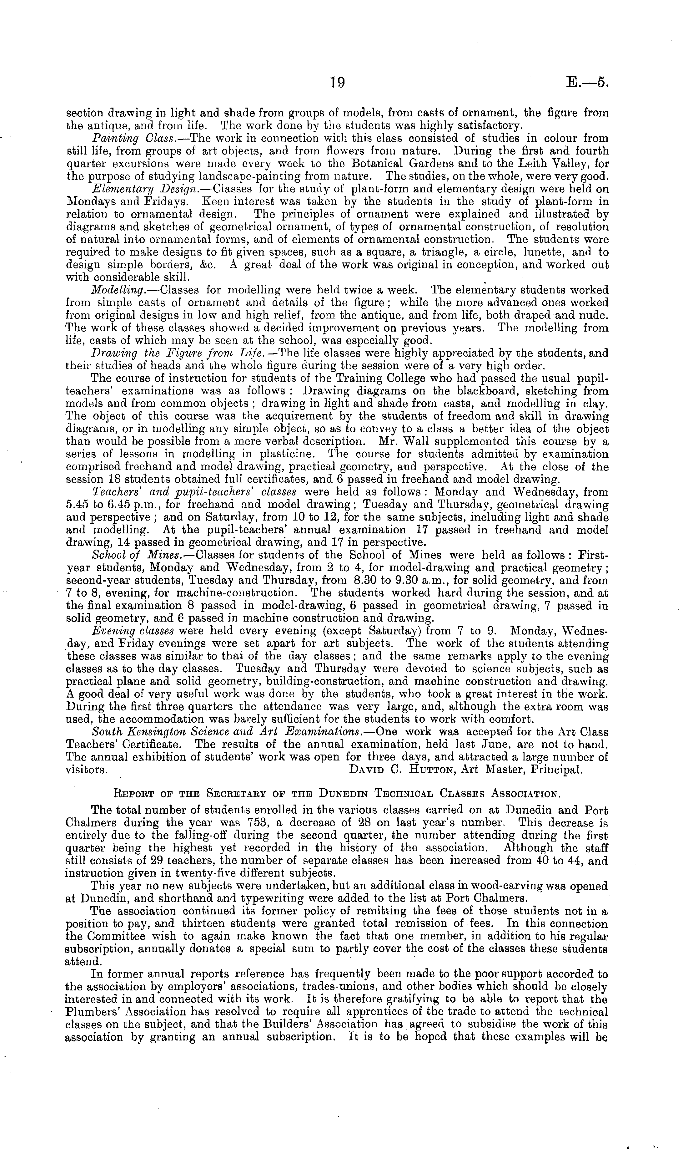 section drawing in light and shade from groups of models, from casts of ornament, the figure from the antique, and from life. The work done by the students was highly satisfactory. Painting Class. —The work in connection with this class consisted of studies in colour from still life, from groups of art objects, and from flowers from nature. During the first and fourth quarter excursions were made every week to the Botanical Gardens and to the Leith Valley, for the purpose of studying landscape-painting from nature. The studies, on the whole, were very good. Elementary Design. —Classes for the study of plant-form and elementary design were held on Mondays and Fridays. Keen interest was taken by the students in the study of plant-form in relation to ornamental design. The principles of ornament were explained and illustrated by diagrams and sketches of geometrical ornament, of types of ornamental construction, of resolution of natural into ornamental forms, and of elements of ornamental construction. The students were required to make designs to fit given spaces, such as a square, a triangle, a circle, lunette, and to design simple borders, &c. A great deal of the work was original in conception, and worked out with considerable skill. Modelling. —Classes for modelling were held twice a week. The elementary students worked from simple casts of ornament and details of the figure; while the more advanced ones worked from original designs in low and high relief, from the antique, and from life, both draped and nude. The work of these classes showed a decided improvement on previous years. The modelling from life, casts of which may be seen at the school, was especially good. Drawing the Figttre from Life. —The life classes were highly appreciated by the students, and their studies of heads and the whole figure during the session were of a very high order. The course of instruction for students of the Training College who had passed the usual pupilteachers' examinations was as follows : Drawing diagrams on the blackboard, sketching from models and from common objects ; drawing in light and shade from casts, and modelling in clay. The object of this course was the acquirement by the students of freedom and skill in drawing diagrams, or in modelling any simple object, so as to convey to a class a better idea of the object than would be possible from a mere verbal description. Mr. Wall supplemented this course by a series of lessons in modelling in plasticine. The course for students admitted by examination comprised freehand and model drawing, practical geometry, and perspective. At the close of the session 18 students obtained full certificates, and 6 passed in freehand and model drawing. Teachers' and pupil-teachers' classes were held as follows : Monday and Wednesday, from 5.45 to 6.45 p.m., for freehand and model drawing; Tuesday and Thursday, geometrical drawing and perspective ; and on Saturday, from 10 to 12, for the same subjects, including light and shade and modelling. At the pupil-teachers' annual examination 17 passed in freehand and model drawing, 14 passed in geometrical drawing, and 17 in perspective. School of Mines. —Classes for students of the School of Mines were held as follows : Firstyear students, Monday and Wednesday, from 2 to 4, for model-drawing and practical geometry; second-year students, Tuesday and Thursday, from 8.30 to 9.30 a.m., for solid geometry, and from 7to 8, evening, for machine-construction. The students worked hard during the session, and at the final examination 8 passed in model-drawing, 6 passed in geometrical drawing, 7 passed in solid geometry, and 6 passed in machine construction and drawing. Evening classes were held every evening (except Saturday) from 7 to 9. Monday, Wednesday, and Friday evenings were set apart for art subjects. The work of the students attending these classes was similar to that of the day classes; and the same remarks apply to the evening classes as to the day classes. Tuesday and Thursday were devoted to science subjects, such as practical plane and solid geometry, building-construction, and machine construction and drawing. A good deal of very useful work was done by the students, who took a great interest in the work. During the first three quarters the attendance was very large, and, although the extra room was used, the accommodation was barely sufficient for the students to work with comfort. South Kensington Science and Art Examinations. —One work was accepted for the Art Class Teachers' Certificate. The results of the annual examination, held last June, are not to hand. The annual exhibition of students' work was open for three days, and attracted a large number of visitors. David C. Hutton, Art Master, Principal. Report of the Seceetaey of the Dunedin Technical Classes Association. The total number of students enrolled in the various classes carried on at Dunedin and Port Chalmers during the year was 753, a decrease of 28 on last year's number. This decrease is entirely due to the falling-off during the second quarter, the number attending during the first quarter being the highest yet recorded in the history of the association. Although the staff still consists of 29 teachers, the number of separate classes has been increased from 40 to 44, and instruction given in twenty-five different subjects. This year no new subjects were undertaken, but an additional class in wood-carving was opened at Dunedin, and shorthand and typewriting were added to the list at Port Chalmers. The association continued its former policy of remitting the fees of those students not in a position to pay, and thirteen students were granted total remission of fees. In this connection the Committee wish to again make known the fact that one member, in addition to his regular subscription, annually donates a special sum to partly cover the cost of the classes these students attend. In former annual reports reference has frequently been