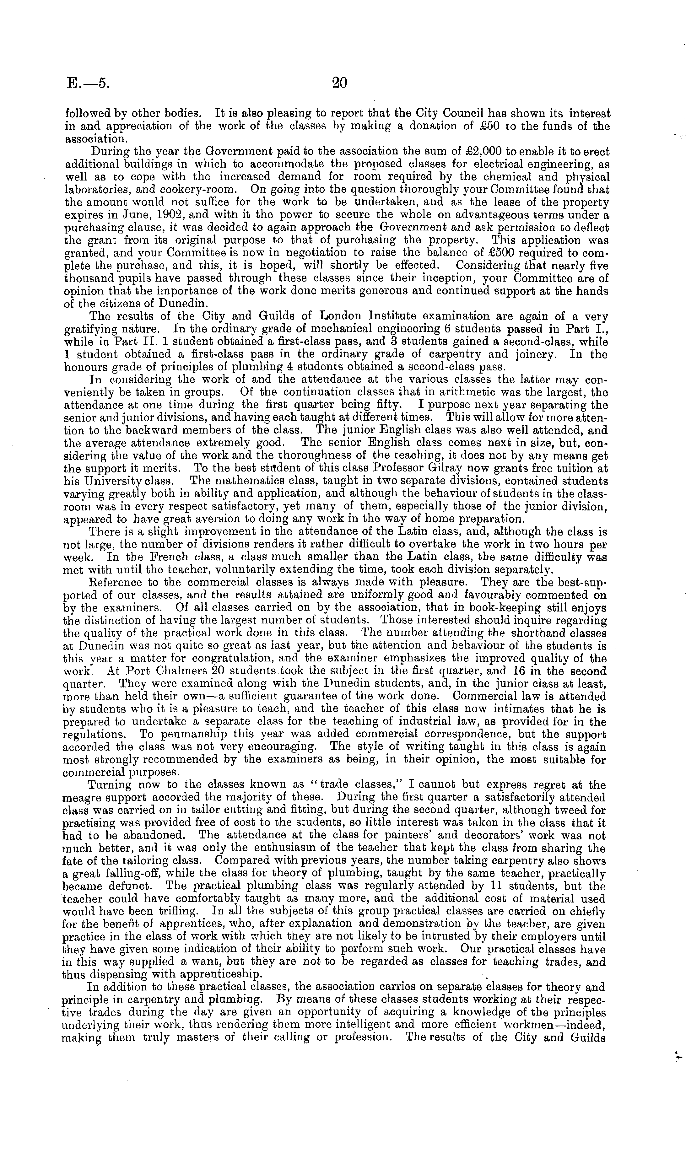 followed by other bodies. It is also pleasing to report that the City Council has shown its interest in and appreciation of the work of the classes by making a donation of £50 to the funds of the association. During the year the Government paid to the association the sum of £2,000 to enable it to erect additional buildings in which to accommodate the proposed classes for electrical engineering, as well as to cope with the increased demand for room required by the chemical and physical laboratories, and cookery-room. On going into the question thoroughly your Committee found that the amount would not suffice for the work to be undertaken, and as the lease of the property expires in June, 1902, and with it the power to secure the whole on advantageous terms under a purchasing clause, it was decided to again approach the Government and ask permission to deflect the grant from its original purpose to that of purchasing the property. This application was granted, and your Committee is now in negotiation to raise the balance of £500 required to complete the purchase, and this, it is hoped, will shortly be effected. Considering that nearly five thousand pupils have passed through these classes since their inception, your Committee are of opinion that the importance of the work done merits generous and continued support at the hands of the citizens of Dunedin. The results of the City and Guilds of London Institute examination are again of a very gratifying nature. In the ordinary grade of mechanical engineering 6 students passed in Part 1., while in Part 11. 1 student obtained a first-class pass, and 3 students gained a second-class, while 1 student obtained a first-class pass in the ordinary grade of carpentry and joinery. In the honours grade of principles of plumbing 4 students obtained a second-class pass. In considering the work of and the attendance at the various classes the latter may conveniently be taken in groups. Of the continuation classes that in arithmetic was the largest, the attendance at one time during the first quarter being fifty. I purpose next year separating the senior and junior divisions, and having each taught at different times. This will allow for more attention to the backward members of the class. The junior English class was also well attended, and the average attendance extremely good. The senior English class comes next in size, but, considering the value of the work and the thoroughness of the teaching, it does not by any means get the support it merits. To the best stitdent of this class Professor Gilray now grants free tuition at his University class. The mathematics class, taught in two separate divisions, contained students varying greatly both in ability and application, and although the behaviour of students in the classroom was in every respect satisfactory, yet many of them, especially those of the junior division, appeared to have great aversion to doing any work in the way of home preparation. There is a slight improvement in the attendance of the Latin class, and, although the class is not large, the number of divisions renders it rather difficult to overtake the work in two hours per week. In the French class, a class much smaller than the Latin class, the same difficulty was met with until the teacher, voluntarily extending the time, took each division separately. Reference to the commercial classes is always made with pleasure. They are the best-sup-ported of our classes, and the results attained are uniformly good and favourably commented on by the examiners. Of all classes carried on by the association, that in book-keeping still enjoys the distinction of having the largest number of students. Those interested should inquire regarding the quality of the practical work done in this class. The number attending the shorthand classes at Dunedin was not quite so great as last year, but the attention and behaviour of the students is this year a matter for congratulation, and the examiner emphasizes the improved quality of the work. At Port Chalmers 20 students took the subject in the first quarter, and 16 in the second quarter. They were examined along with the Dunedin students, and, in the junior class at least, more than held their own —a sufficient guarantee of the work done. Commercial law is attended by students who it is a pleasure to teach, and the teacher of this class now intimates that he is prepared to undertake a separate class for the teaching of industrial law, as provided for in the regulations. To penmanship this year was added commercial correspondence, but the support accorded the class was not very encouraging. The style of writing taught in this class is again most strongly recommended by the examiners as being, in their opinion, the most suitable for commercial purposes. Turning now to the classes known as "trade classes," I cannot but express regret at the meagre support accorded the majority of these. During the first quarter a satisfactorily attended class was carried on in tailor cutting and fitting, but during the second quarter, although tweed for practising was provided free of cost to the students, so little interest was taken in the class that it had to be abandoned. The attendance at the class for painters' and decorators' work was not much better, and it was only the enthusiasm of the teacher that kept the class from sharing the fate of the tailoring class. Compared with previous years, the number taking carpentry also shows a great falling-off, while the class for theory of plumbing, taught by the same teacher, practically became defunct. The practical plumbing class was regularly attended by 11 students, but the teacher could have comfortably taught as many more, and the additional cost of material used would have been trifling. In all the subjects of this group practical classes are carried on chiefly for the benefit of apprentices, who, after explanation and demonstration by the teacher, are given practice in t