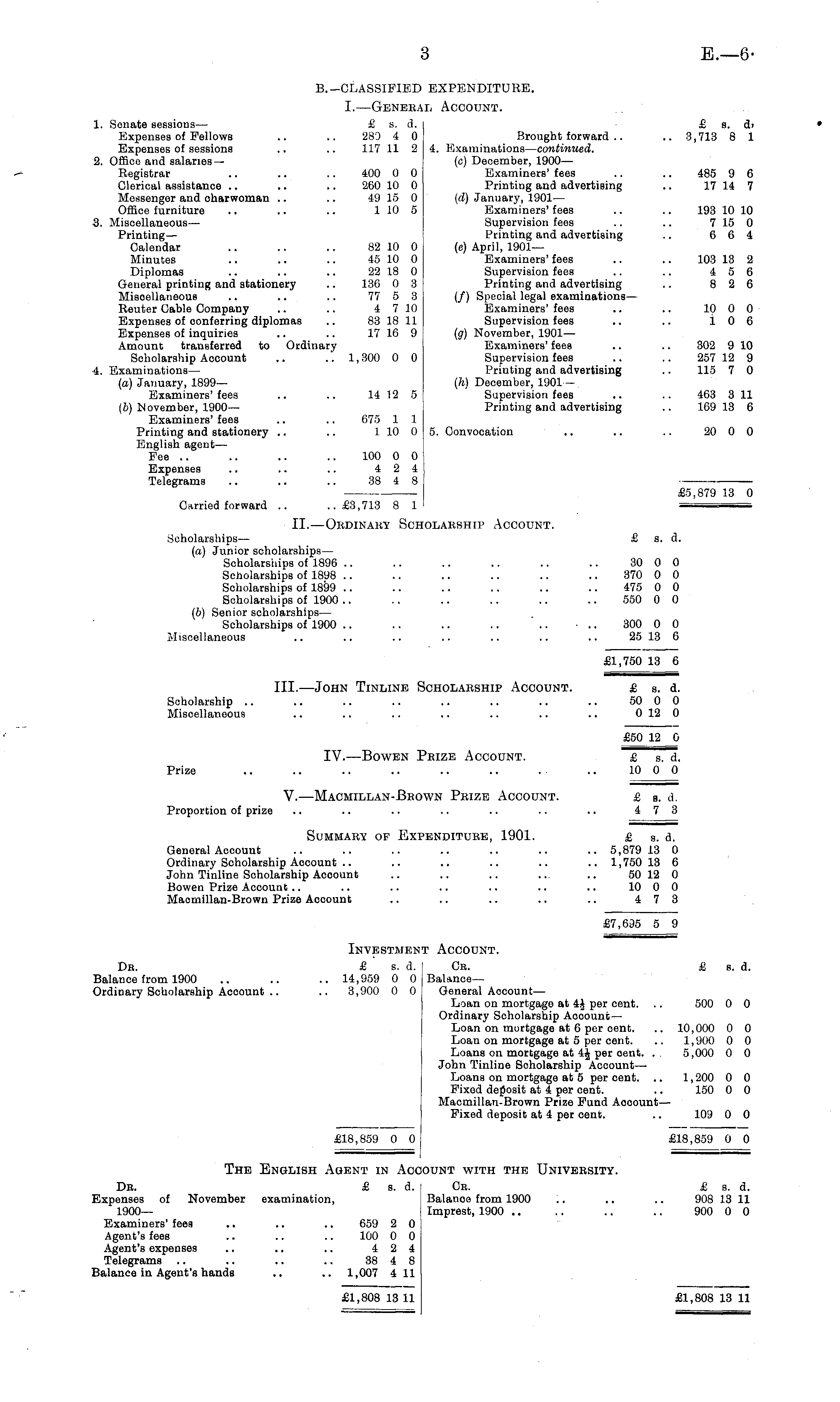 8.-CLASSIFIED EXPENDITURE. I.—Genebai, Account. 1. Senate sessions— £ s. d. £ s. d> Expenses of Fellows .. .. 280 4 0 Brought forward .. .. 3,713 8 1 Expenses of sessions .. .. 117 11 2 4. Examinations — continued. 2. Office and salaries— (c) December, 1900 — Registrar .. .. .. 400 0 0 Examiners' fees .. .. 485 9 6 Clerical assistance .. .. .. 260 10 0 Printing and advertising .. 17 14 7 Messenger and charwoman .. .. 49 15 0 (d) January, 1901— Office furniture .. .. .. 110 5 Examiners' fees .. .. 193 10 10 3. Miscellaneous — Supervision fees .. .. 715 0 Printing— Printing and advertising .. 6 6 4 Calendar .. .. .. 82 10 0 (c) April, 1901— Minutes .. .. .. 45 10 0 Examiners' fees .. .. 103 13 2 Diplomas .. .. .. 22 18 0 Supervision fees .. .. 4 5 6 General printing and stationery .. 136 0 3 Printing and advertising .. 8 2 6 Miscellaneous .. .. .. 77 5 3 (/) Special legal examinations — Reuter Cable Company .. .. 4 710 Examiners' fees .. .. 10 0 0 Expenses of conferring diplomas .. 83 18 11 Supervision fees .. .. 10 6 Expenses of inquiries .. .. 17 16 9 (g) November, 1901— Amount transferred to Ordinary Examiners' fees .. .. 302 910 Scholarship Account .. .. 1,300 0 0 Supervision fees .. .. 257 12 9 4. Examinations— Printing and advertising .. 115 7 0 (a) January, 1899— (h) December, 1901— Examiners'fees .. .. 14 12 5 Supervision fees .. .. 463 3 11 (b) November, 1900 — Printing and advertising .. 169 13 6 Examiners' fees .. .. 675 1 1 Printing and stationery .. .. 1 10 0 5. Convocation .. .. .. 20 0 0 English agent— Fee .. .. .. .. 100 0 0 Expenses .. .. .. 4 2 4 Telegrams .. .. .. 38 4 8 £5,879 13 0 Carried forward .. ..£3,713 8 1 — ll.—Ordinary Scholarship Account. Scholarships— £ s. d. (a) Junior scholarships— Scholarships of 1896 .. .. .. .. .. .. 30 0 0 Scholarships of 1898 .. .. .. .. .. .. 370 0 0 Scholarships of 1899 .. .. .. .. .. .. 475 0 0 Scholarships of 1900.. .. .. .. .. .. 550 0 0 (b) Senior scholarships— Scholarships of 1900 .. .. .. .. .. ■ .. 300 0 0 Miscellaneous .. .. .. .. .. .. .. 25 13 6 £1,750 13 6 lll.—John Tinline Scholabship Account. £ s. d. Scholarship .. .. .. .. .. .. .. .. 50 0 0 Miscellaneous .. .. .. .. .. .. .. 0 12 0 £50 12 0 IV.—Bowen Prize Account. £ s. d. Prize .. .. .. .. .. .. . . .. 10 0 0 V.—Macmillan-Brown Prize Account. £ b. d. Proportion of prize .. .. .. .. .. .. .. 473 Summary of Expenditure, 1901. £ s . d. General Account .. .. .. .. .. .. .. 5,879 13 0 Ordinary Scholarship Aocount .. .. .. .. .. .. 1,750 13 6 John Tinline Scholarship Acoount .. .. .. ... .. 50 12 0 Bowen Prize Account .. .. .. .. .. .. .. 10 0 0 Macmillan-Brown Prize Account .. .. .. .. .. 473 £7,695 5 9 Investment Account. De. £ s. d. Cβ. £ s. d. Balance from 1900 .. .. .. 14,959 0 0 BalanceOrdinary Scholarship Account .. .. 3,900 0 0 General Account— Loan on mortgage at 4J per cent. .. 500 0 0 Ordinary Scholarship Account— Loan on mortgage at 6 per oent. .. 10,000 0 0 Loan on mortgage at 5 per cent. .. 1,900 0 0 Loans on mortgage at 4j per oent. . 5,000 0 0 John Tinline Scholarship Account—• Loans on mortgage at 5 per cent. .. 1,200 0 0 Fixed deposit at 4 per cent. .. 150 0 0 Macmillan-Brown Prize Fund Account — Fixed deposit at 4 per cent. .. 109 0 0 £18,859 0 0 £18,859 0 0 The English Agent in Account with the University. Dβ. £ s. d. Cβ. £ s. d. Expenses of November examination, Balanoe from 1900 ;. .. .. 908 13 11 1900— Imprest, 1900 .. .. .. .. 900 0 0 Examiners' fees .. .. .. 659 2 0 Agent's fees .. .. .. 100 0 0 Agent's expenses .. .. .. 4 2 4 Telegrams .. .. .. .. 38 4 8 Balance in Agent's hands .. .. 1,007 411 £1,808 13 11 £1,808 13 11