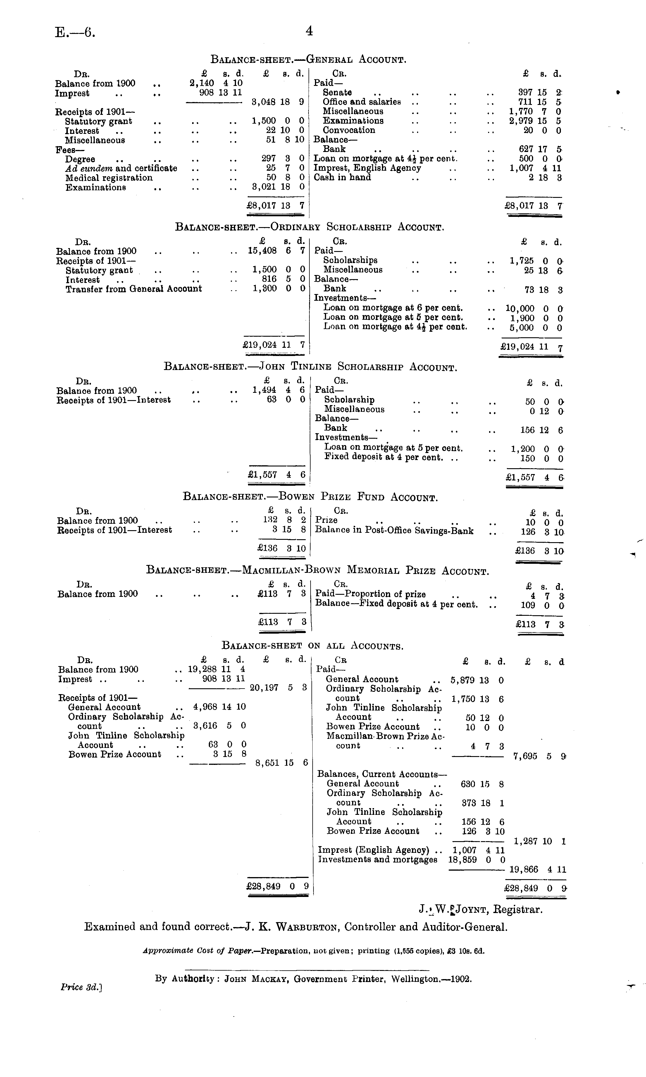 Balance-sheet.—General Account. Dβ. £ a. d. £ s. d. Or. JE s. d. Balance from 1900 .. 2,140 4 10 PaidImprest .. .. 908 13 11 Senate .. .. .. .. 397 15 2 3,048 18 9 Office and salaries .. .. .. 711 15 5 Beoeipta of 1901— Miscellaneous .. .. .. 1,770 7 0 Statutory grant .. .. .. 1,500 0 0 Examinations .. .. .. 2,979 15 5 Interest .. .. .. .. 22 10 0 Convocation .. .. .. 20 0 0 Miscellaneous .. .. .. 51 8 10 Balance— Pees— Bank .. .. .. .. 627 17 5 Degree .. .. .. .. 297 3 0 Loan on mortgage at 4J per oent. .. 500 0 0 Ad eundem and certificate .. .. 25 7 0 Imprest, English Agency .. .. 1,007 411 Medical registration .. .. 50 8 0 Cash in hand .. .. .. 2 18 3 Examinations .. .. .. 3,021 18 0 £8,017 13 7 £8,017 13 7 Balance-sheet. —Ordinary Scholarship Account. Dβ. £ s. d. Cβ. £ s. d. Balance from 1900 .. .. .. 15,408 6 7 PaidReceipts of 1901 — Scholarships .. .. .. 1,725 0 0 Statutory grant .. .. .. 1,500 0 0 Miscellaneous .. .. .. 25 13 6 Interest .. .. .. .. 816 5 0 BalanceTransfer from General Account .. 1,300 0 0 Bank .. .. .. .. 73 18 3 Investments— Loan on mortgage at 6 per oent. .. 10,000 0 0 Loan on mortgage at 5 per oent. .. 1,900 0 0 Loan on mortgage at 4J per oent. .. 5,000 0 0 £19,024 11 7 £19,024 11 7 Balance-sheet. —John Tinline Scholarship Account. Dβ. £ s. d. j Cβ. £ 9 . a. Balance from 1900 .. .. .. 1,494 4 6 Paid— Reoeipts of 1901—Interest .. .. 63 0 0 Scholarship .. .. .. 50 0 0 Miscellaneous .. .. ~ 0 12 0 Balance— Bank .. .. .. .. 156 12 6 Investments— Loan on mortgage at 5 per oent. .. 1,200 0 0 Fixed deposit at 4 per cent. .. .. 150 0 0 * £1.557 4 6 4 6 Balance-sheet. —Bowen Prize Fund Account. Dβ. £ s. d. Cβ. £ s . d . Balance from 1900 .. .. .. 132 8 2 Prize .. .. .. .. 10 0 0 Reoeipts of 1901 —Interest .. .. 315 8 Balance in Post-Office Savings-Bank .. 126 310 £136J5JL0 £136 3 10 Balance-sheet.—Macmillan-Bbown Memorial Prize Account. Dβ. £ s. d. Cβ. £ s# $ Balance from 1900 .. .. .. £113 7 3 Paid—Proportion of prize .. .. 4 7 3 Balance—Fixed deposit at 4 per cent. .. 109 0 0 £113 7 3 £113 7 3 Balance-sheet on all Accounts. Dβ. £ s. d. £ s. d. Cβ £ s d £ s d Balance from 1900 ..19,288 11 4 PaidImprest .. .. .. 908 13 11 General Account .. 5,879 13 0 20,197 5 3 Ordinary Scholarship AcReceipts of 1901— count .. .. 1,750 13 6 General Account .. 4,968 14 10 John Tinline Scholarship Ordinary Scholarship Ac- Account .. .. 50 12 0 count .. .. 3,616 5 0 Bowen Prize Account .. 10 0 0 John Tinline Scholarship Macmillan Brown Prize AcAccount .. .. 63 0 0 count .. .. 4 7 3 Bowen Prize Account .. 315 8 7 695 5 9 8,651 15 6 ' Balances, Current Accounts— General Account .. 630 15 8 Ordinary Scholarship Account .. .. 373 18 1 John Tinline Scholarship Account .. .. 156 12 6 Bowen Prize Account .. 126 3 10 1,287 10 1 Imprest (English Agenoy) .. 1,007 4 11 Investments and mortgages 18,859 0 0 19,866 4 11 £28,849 0 9 £28,849 0 9J.' W.PJoynt, Eegistrar. Examined and found correct.— J. K. Warburton, Controller and Auditor-General. Approximate Cost of Paper.— Preparation, not given; printing (1,655 copies), £3 10s. 6d.
