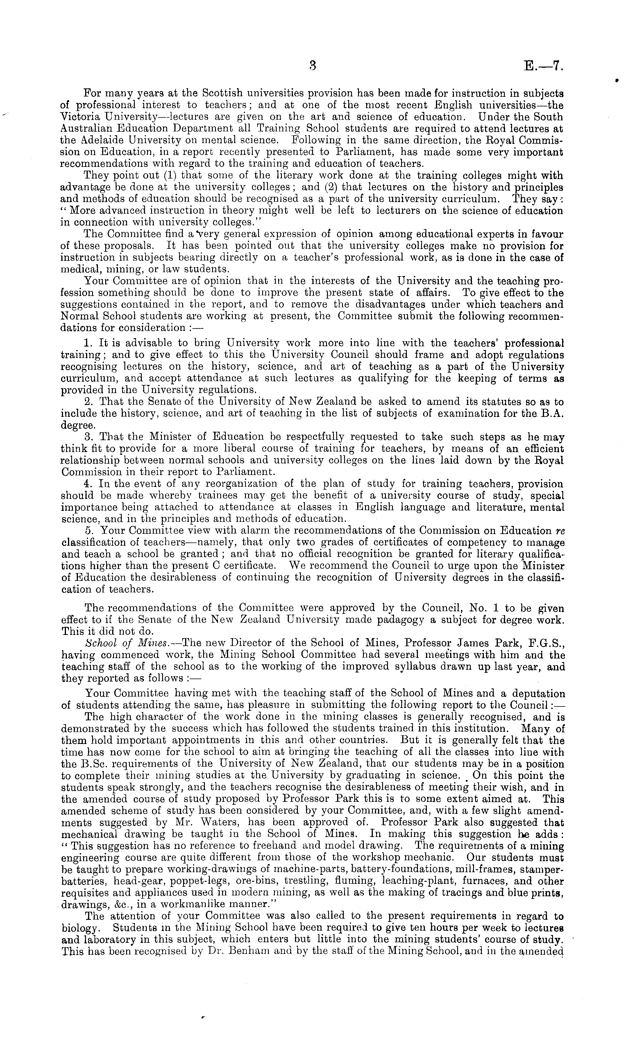 For many years at the Scottish universities provision has been made for instruction in subjects of professional interest to teachers; and at one of the most recent English universities—the Victoria University—lectures are given on the art and science of education. Under the South Australian Education Department all Training School students are required to attend lectures at the Adelaide University on mental science. Following in the same direction, the Royal Commission on Education, in a report recently presented to Parliament, has made some very important recommendations with regard to the training and education of teachers. They point out (1) that some of the literary work done at the training colleges might with advantage be done at the university colleges; and (2) that lectures on the history and principles and methods of education should be recognised as a part of the university curriculum. They say-: " More advanced instruction in theory might well be left to lecturers on the science of education in connection with university colleges." The Committee find a Very general expression of opinion among educational experts in favour of these proposals. It has been pointed out that the university colleges make no provision for instruction in subjects bearing directly on a teacher's professional work, as is done in the case of medical, mining, or law students. Your Committee are of opinion that in the interests of the University and the teaching profession something should be done to improve the present state of affairs. To give effect to the suggestions contained in the report, and to remove the disadvantages under which teachers and Normal School students are working at present, the Committee submit the following recommendations for consideration :— 1. It is advisable to bring University work more into line with the teachers' professional training; and to give effect to this the University Council should frame and adopt regulations recognising lectures on the history, science, and art of teaching as a part of the University curriculum, and accept attendance at such lectures as qualifying for the keeping of terms as provided in the University regulations. 2. That the Senate of the University of New Zealand be asked to amend its statutes so as to include the history, science, and art of teaching in the list of subjects of examination for the. B.A. degree. 3. That the Minister of Education be respectfully requested to take such steps as he may think fit to provide for a more liberal course of training for teachers, by means of an efficient relationship between normal schools and university colleges on the lines laid down by the Royal Commission in their report to Parliament. 4. In the event of any reorganization of the plan of study for training teachers, provision should be made whereby trainees may get the benefit of a university course of study, special importance being attached to attendance at classes in English language and literature, mental science, and in the principles and methods of education. 5. Your Committee view with alarm the recommendations of the Commission on Education re classification of teachers —namely, that only two grades of certificates of competency to manage and teach a school be granted ; and that no official recognition be granted for literary qualifications higher than the present C certificate. We recommend the Council to urge upon the Minister of Education the desirableness of continuing the recognition of University degrees in the classification of teachers. The recommendations of the Committee were approved by the Council, No. 1 to be given effect to if the Senate of the New Zealand University made padagogy a subject for degree work. This it did not do. School of Mines. —The new Director of the School of Mines, Professor James Park, F.G.S., having commenced work, the Mining School Committee had several meetings with him and the teaching staff of the school as to the working of the improved syllabus drawn up last year, and they reported as follows : — Your Committee having met with the teaching staff of the School of Mines and a deputation of students attending the same, has pleasure in submitting the following report to the Council:— The high character of the work done in the mining classes is generally recognised, and is demonstrated by the success which has followed the students trained in this institution. Many of them hold important appointments in this and other countries. But it is generally felt that the time has now come for the school to aim at bringing the teaching of all the classes into line with the B.Sc. requirements of the University of New Zealand, that our students may be in a position to complete their mining studies at the University by graduating in science. _ On this point the students speak strongly, and the teachers recognise the desirableness of meeting their wish, and in the amended course of study proposed by Professor Park this is to some extent aimed at. This amended scheme of study has been considered by your Committee, and, with a few slight amendments suggested by Mr. Waters, has been approved of. Professor Park also suggested that mechanical drawing be taught in the School of Mines. In making this suggestion he adds : " This suggestion has no reference to freehand and model drawing. The requirements of a mining engineering course are quite different from those of the workshop mechanic. Our students must be taught to prepare working-drawings of machine-parts, battery-foundations, mill-frames, stamperbatteries, head-gear, poppet-legs, ore-bins, trestling, fluming, leaching-plant, furnaces, and other requisites and appliances used in modern mining, as well as the making of tracings and blue prints, drawings, &c, in a workmanlike manner." The attention of your Committee was also called to the present requirements in regard to biology. Students in the Mining School have been required to give ten hours per week to le