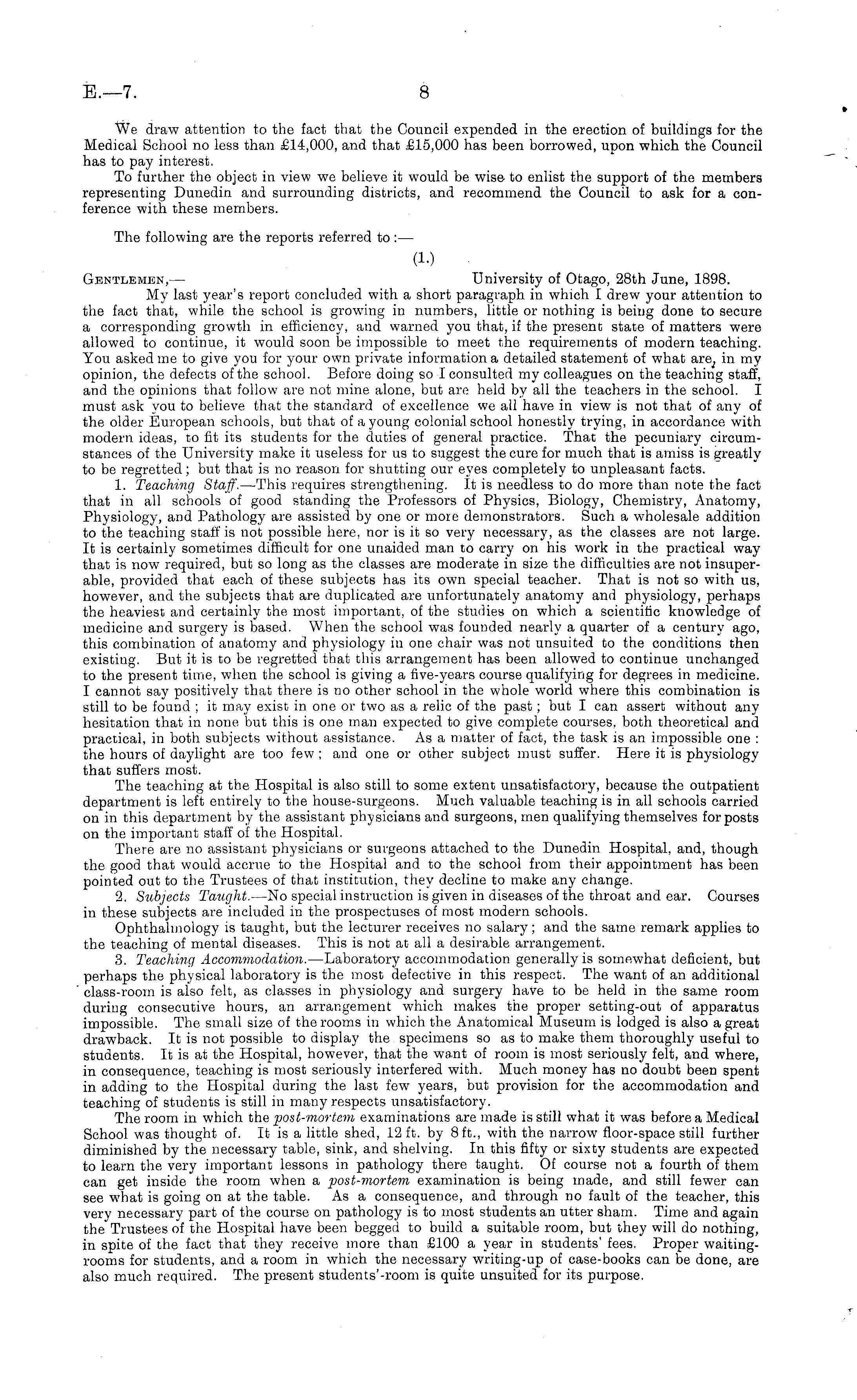 We draw attention to the fact that the Council expended in the erection of buildings for the Medical School no less than £14,000, and that £15,000 has been borrowed, upon which the Council has to pay interest. To further the object in view we believe it would be wise to enlist the support of the members representing Dunedin and surrounding districts, and recommend the Council to ask for a conference with these members. The following are the reports referred to : — (1.) Gentlemen, — University of Otago, 28th June, 1898. My last year's report concluded with a short paragraph in which I drew your attention to the fact that, while the school is growing in numbers, little or nothing is being done to secure a corresponding growth in efficiency, and warned you that, if the present state of matters were allowed to continue, it would soon be impossible to meet the requirements of modern teaching. You asked me to give you for your own private information a detailed statement of what are, in my opinion, the defects of the school. Before doing so I consulted my colleagues on the teaching staff, and the opinions that follow are not mine alone, but are held by all the teachers in the school. I must ask you to believe that the standard of excellence we all have in view is not that of any of the older European schools, but that of a young colonial school honestly trying, in accordance with modern ideas, to fit its students for the duties of general practice. That the pecuniary circumstances of the University make it useless for us to suggest the cure for much that is amiss is greatly to be regretted; but that is no reason for shutting our eyes completely to unpleasant facts. 1. Teaching Staff. —This requires strengthening. It is needless to do more than note the fact that in all schools of good standing the Professors of Physics, Biology, Chemistry, Anatomy, Physiology, and Pathology are assisted by one or more demonstrators. Such a wholesale addition to the teaching staff is not possible here, nor is it so very necessary, as the classes are not large. It is certainly sometimes difficult for one unaided man to carry on his work in the practical way that is now required, but so long as the classes are moderate in size the difficulties are not insuperable, provided that each of these subjects has its own special teacher. That is not so with us, however, and the subjects that are duplicated are unfortunately anatomy and physiology, perhaps the heaviest and certainly the most important, of the studies on which a scientific knowledge of medicine and surgery is based. When the school was founded nearly a quarter of a century ago, this combination of anatomy and physiology in one chair was not unsuited to the conditions then existing. But it is to be regretted that this arrangement has been allowed to continue unchanged to the present time, when the school is giving a five-years course qualifying for degrees in medicine. I cannot say positively that there is no other school in the whole world where this combination is still to be found ;it may exist in one or two as a relic of the past; but I can assert without any hesitation that in none but this is one man expected to give complete courses, both theoretical and practical, in both subjects without assistance. As a matter of fact, the task is an impossible one : the hours of daylight are too few ; and one or other subject must suffer. Here it is physiology that suffers most. The teaching at the Hospital is also still to some extent unsatisfactory, because the outpatient department is left entirely to the house-surgeons. Much valuable teaching is in all schools carried on in this department by the assistant physicians and surgeons, men qualifying themselves for posts on the important staff of the Hospital. There are no assistant physicians or surgeons attached to the Dunedin Hospital, and, though the good that would accrue to the Hospital and to the school from their appointment has been pointed out to the Trustees of that institution, they decline to make any change. 2. Subjects Taught. —No special instruction is given in diseases of the throat and ear. Courses in these subjects are included in the prospectuses of most modern schools. Ophthalmology is taught, but the lecturer receives no salary; and the same remark applies to the teaching of mental diseases. This is not at all a desirable arrangement. 3. Teaching Accommodation. —Laboratory accommodation generally is somewhat deficient, but perhaps the physical laboratory is the most defective in this respect. The want of an additional class-room is also felt, as classes in physiology and surgery have to be held in the same room during consecutive hours, an arrangement which makes the proper setting-out of apparatus impossible. The small size of the rooms in which the Anatomical Museum is lodged is also a great drawback. It is not possible to display the specimens so as to make them thoroughly useful to students. It is at the Hospital, however, that the want of room is most seriously felt, and where, in consequence, teaching is most seriously interfered with. Much money has no doubt been spent in adding to the Hospital during the last few years, but provision for the accommodation and teaching of students is still in many respects unsatisfactory. The room in which the post-mortem examinations are made is still what it was before a Medical School was thought of. It is a little shed, 12 ft. by 8 ft., with the narrow floor-space still further diminished by the necessary table, sink, and shelving. In this fifty or sixty students are expected to learn the very important lessons in pathology there taught. Of course not a fourth of them can get inside the room when a post-mortem examination is being made, and still fewer can see what is going on at the table. As a consequence, and through no fault of the teacher, this very necessary part of the course on pathology is to most students an utter sham. Time an