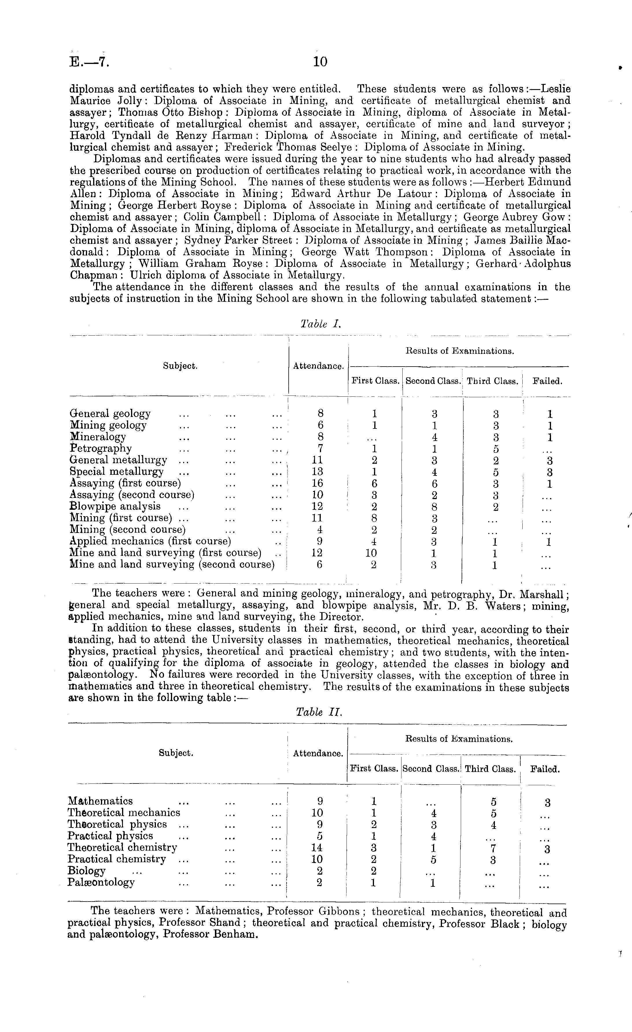 The teachers were : General and mining geology, mineralogy, and petrography, Dr. Marshall; general and special metallurgy, assaying, and blowpipe analysis, Mr. D. B. Waters; mining, applied mechanics, mine and land surveying, the Director. In addition to these classes, students in their first, second, or third year, according to their Standing, had to attend the University classes in mathematics, theoretical mechanics, theoretical physics, practical physics, theoretical and practical chemistry; and two students, with the intention of qualifying for the diploma of associate in geology, attended the classes in biology and palaeontology. No failures were recorded in the University classes, with the exception of three in mathematics and three in theoretical chemistry. The results of the examinations in these subjects are shown in the following table :—