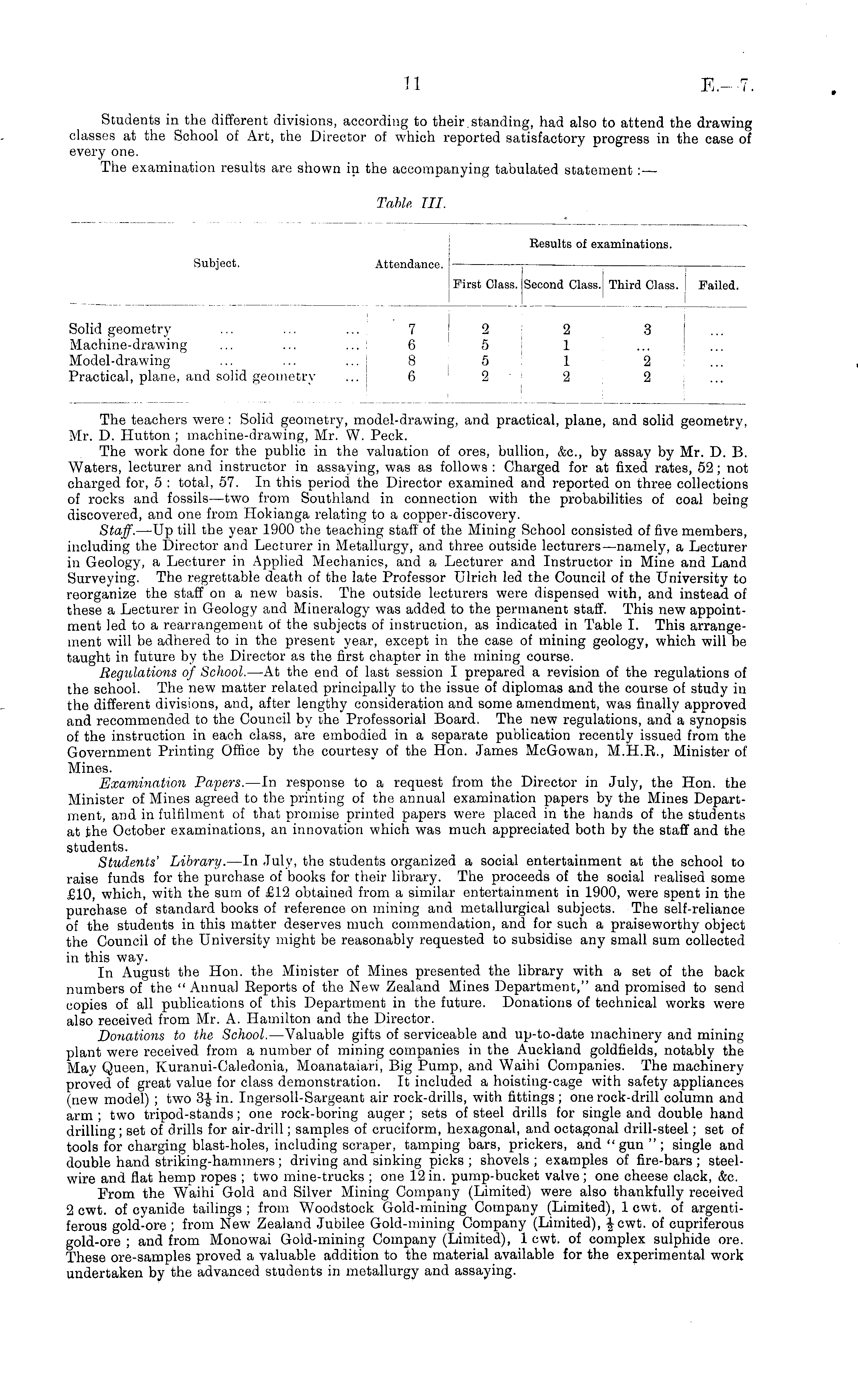 The teachers were : Solid geometry, model-drawing, and practical, plane, and solid geometry, Mr. D. Hutton ; machine-drawing, Mr. W. Peck. The work done for the public in the valuation of ores, bullion, &c, by assay by Mr. D. B. Waters, lecturer and instructor in assaying, was as follows : Charged for at fixed rates, 52; not charged for, 5 : total, 57. In this period the Director examined and reported on three collections of rocks and fossils—two from Southland in connection with the probabilities of coal being discovered, and one from Hokianga relating to a copper-discovery. Staff. —Up till the year 1900 the teaching staff of the Mining School consisted of five members, including the Director and Lecturer in Metallurgy, and three outside lecturers—namely, a Lecturer in Geology, a Lecturer in Applied Mechanics, and a Lecturer and Instructor in Mine and Land Surveying. The regrettable death of the late Professor Ulrich led the Council of the University to reorganize the staff on a new basis. The outside lecturers were dispensed with, and instead of these a Lecturer in Geology and Mineralogy was added to the permanent staff. This new appointment led to a rearrangement of the subjects of instruction, as indicated in Table I. This arrangement will be adhered to in the present year, except in the case of mining geology, which will be taught in future by the Director as the first chapter in the mining course. Regulations of School. —At the end of last session I prepared a revision of the regulations of the school. The new matter related principally to the issue of diplomas and the course of study in the different divisions, and, after lengthy consideration and some amendment, was finally approved and recommended to the Council by the Professorial Board. The new regulations, and a synopsis of the instruction in each class, are embodied in a separate publication recently issued from the Government Printing Office by the courtesy of the Hon. James McGowan, M.H.R., Minister of Mines. Examination Papers. —ln response to a request from the Director in July, the Hon. the Minister of Mines agreed to the printing of the annual examination papers by the Mines Department, and in fulfilment of that promise printed papers were placed in the hands of the students at the October examinations, an innovation which was much appreciated both by the staff and the students. Students' Library. —ln July, the students organized a social entertainment at the school to raise funds for the purchase of books for their library. The proceeds of the social realised some £10, which, with the sum of £12 obtained from a similar entertainment in 1900, were spent in the purchase of standard books of reference on mining and metallurgical subjects. The self-reliance of the students in this matter deserves much commendation, and for such a praiseworthy object the Council of the University might be reasonably requested to subsidise any small sum collected in this way. In August the Hon. the Minister of Mines presented the library with a set of the back numbers of the " Annual Reports of the New Zealand Mines Department," and promised to send copies of all publications of this Department in the future. Donations of technical works were also received from Mr. A. Hamilton and the Director. Donations to the School. —Valuable gifts of serviceable and up-to-date machinery and mining plant were received from a number of mining companies in the Auckland goldfields, notably the May Queen, Kuranui-Caledonia, Moanataiari, Big Pump, and Waihi Companies. The machinery proved of great value for class demonstration. It included a hoisting-cage with safety appliances (new model) ; two in. Ingersoll-Sargeant air rock-drills, with fittings ; one rock-drill column and arm ; two tripod-stands; one rock-boring auger; sets of steel drills for single and double hand drilling; set of drills for air-drill; samples of cruciform, hexagonal, and octagonal drill-steel; set of tools for charging blast-holes, including scraper, tamping bars, prickers, and " gun " ; single and double hand striking-hammers; driving and sinking picks ; shovels ; examples of fire-bars ; steelwire and flat hemp ropes ; two mine-trucks ; one 12 in. pump-bucket valve; one cheese clack, &c. From the Waihi Gold and Silver Mining Company (Limited) were also thankfully received 2 cwt. of cyanide tailings ; from Woodstock Gold-mining Company (Limited), 1 cwt. of argentiferous gold-ore ; from New Zealand Jubilee Gold-mining Company (Limited), \ cwt. of cupriferous gold-ore ; and from Monowai Gold-mining Company (Limited), 1 cwt. of complex sulphide ore. These ore-samples proved a valuable addition to the material available for the experimental work undertaken by the advanced students in metallurgy and assaying.