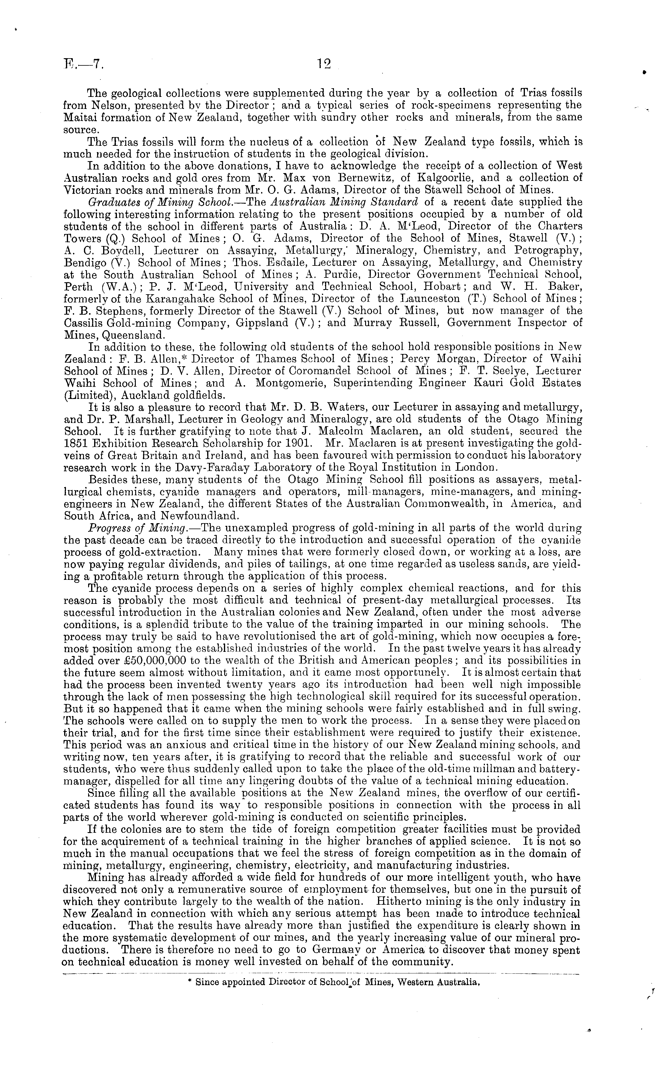 The geological collections were supplemented during the year by a collection of Trias fossils from Nelson, presented by the Director ; and a typical series of rock-specimens representing the Maitai formation of New Zealand, together with sundry other rocks and minerals, from the same source. The Trias fossils will form the nucleus of a collection of New Zealand type fossils, which is much needed for the instruction of students in the geological division. In addition to the above donations, I have to acknowledge the receipt of a collection of West Australian rocks and gold ores from Mr. Max yon Bernewitz, of Kalgoorlie, and a collection of Victorian rocks and minerals from Mr. 0. G. Adams, Director of the Stawell School of Mines. Graduates of Mining School. —The Australian Mining Standard of a recent date supplied the following interesting information relating to the present positions occupied by a number of old students of the school in different parts of Australia : D. A. M'Leod, Director of the Charters Towers (Q.) School of Mines ; 0. G. Adams, Director of the School of Mines, Stawell (V.) ; A. C. Boydell, Lecturer on Assaying, Metallurgy,' Mineralogy, Chemistry, and Petrography, Bendigo (V.) School of Mines; Thos. Esdaile, Lecturer on Assaying, Metallurgy, and Chemistry at the South Australian School of Mines ; A. Purdie, Director Government Technical School, Perth (W.A.) ; P. J. M'Leod, University and Technical School, Hobart; and W. H. Baker, formerly of the Karangahake School of Mines, Director of the Launceston (T.) School of Mines; F. B. Stephens, formerly Director of the Stawell (V.) School of - Mines, but now manager of the Cassilis Gold-mining Company, Gippsland (V.) ; and Murray Russell, Government Inspector of Mines, Queensland. In addition to these, the following old students of the school hold responsible positions in New Zealand: F. B. Allen,* Director of Thames School of Mines; Percy Morgan, Director of Waihi School of Mines ; D. V. Allen, Director of Coromandel School of Mines ; F. T. Seelye, Lecturer Waihi School of Mines; and A. Montgomerie, Superintending Engineer Kauri Gold Estates (Limited), Auckland goldfields. It is also a pleasure to record that Mr. D. B. Waters, our Lecturer in assaying and metallurgy, and Dr. P. Marshall, Lecturer in Geology and Mineralogy, are old students of the Otago Mining School. It is further gratifying to note that J. Malcolm Maclaren, an old student, secured the 1851 Exhibition Research Scholarship for 1901. Mr. Maclaren is at present investigating the goldveins of Great Britain and Ireland, and has been favoured with permission to conduct his laboratory research work in the Davy-Faraday Laboratory of the Royal Institution in London. Besides these, many students of the Otago Mining School fill positions as assayers, metallurgical chemists, cyanide managers and operators, mill managers, mine-managers, and miningengineers in New Zealand, the different States of the Australian Commonwealth, in America, and South Africa, and Newfoundland. Progress of Mining. —The unexampled progress of gold-mining in all parts of the world during the past decade can be traced directly to the introduction and successful operation of the cyanide process of gold-extraction. Many mines that were formerly closed down, or working at a loss, are now paying regular dividends, and piles of tailings, at one time regarded as useless sands, are yielding a profitable return through the application of this process. The cyanide process depends on a series of highly complex chemical reactions, and for this reason is probably the most difficult and technical of present-day metallurgical processes. Its successful introduction in the Australian colonies and New Zealand, often under the most adverse conditions, is a splendid tribute to the value of the training imparted in our mining schools. The process may truly be said to have revolutionised the art of gold-mining, which now occupies a foremost position among the established industries of the world. In the past twelve years it has already added over £50,000,000 to the wealth of the British and American peoples; and its possibilities in the future seem almost without limitation, and it came most opportunely. It is almost certain that had the process been invented twenty years ago its introduction had been well nigh impossible through the lack of men possessing the high technological skill required for its successful operation. But it so happened that it came when the mining schools were fairly established and in full swing. The schools were called on to supply the men to work the process. In a sense they were placed on their trial, and for the first time since their establishment were required to justify their existence. This period was an anxious and critical time in the history of our New Zealand mining schools, and writing now, ten years after, it is gratifying to record that the reliable and successful work of our students, who were thus suddenly called upon to take the place of the old-time millman and batterymanager, dispelled for all time any lingering doubts of the value of a technical mining education. Since filling all the available positions at the New Zealand mines, the overflow of our certificated students has found its way to responsible positions in connection with the process in all parts of the world wherever gold-mining is conducted on scientific principles. If the colonies are to stem the tide of foreign competition greater facilities must be provided for the acquirement of a technical training in the higher branches of applied science. It is not so much in the manual occupations that we feel the stress of foreign competition as in the domain of mining, metallurgy, engineering, chemistry, electricity, and manufacturing industries. Mining has already afforded a wide field for hundreds of our more intelligent youth, who have discovered not only a remunerative source of employment for themselves, but o