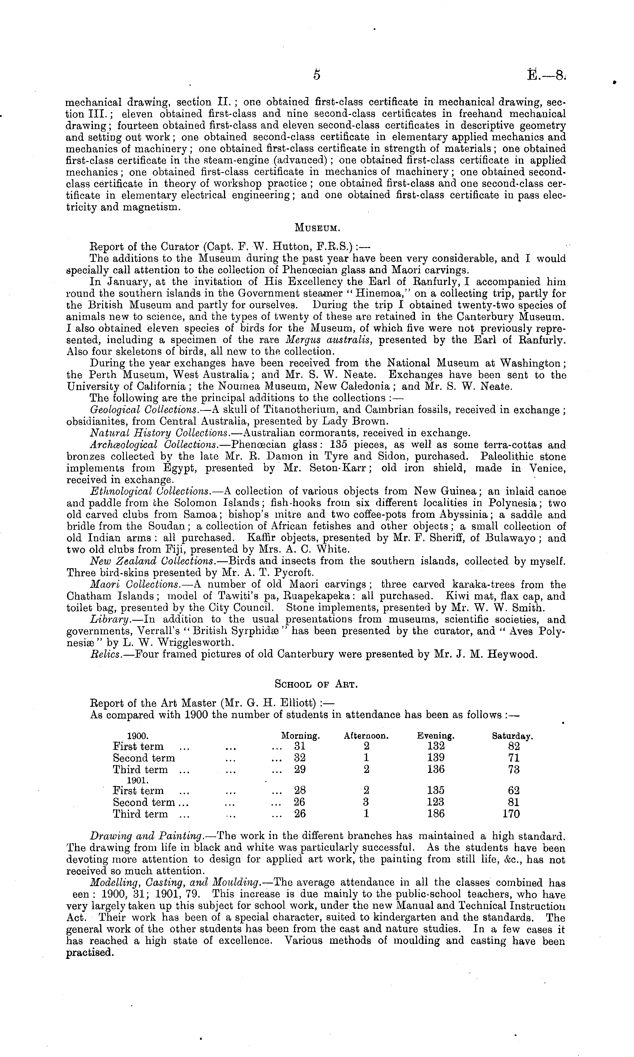 mechanical drawing, section 11. ; one obtained first-class certificate in mechanical drawing, section III.; eleven obtained first-class and nine second-class certificates in freehand mechanical drawing; fourteen obtained first-class and eleven second-class certificates in descriptive geometry and setting out work; one obtained second-class certificate in elementary applied mechanics and mechanics of machinery; one obtained first-class certificate in strength of materials; one obtained first-class certificate in the steam-engine (advanced); one obtained first-class certificate in applied mechanics; one obtained first-class certificate in mechanics of machinery; one obtained secondclass certificate in theory of workshop practice ; one obtained first-class and one second-class certificate in elementary electrical engineering; and one obtained first-class certificate in pass electricity and magnetism. Museum. Eeport of the Curator (Capt. F. W. Hutton, F.E.S.) :— The additions to the Museum during the past year have been very considerable, and I would specially call attention to the collection of Phenoecian glass and Maori carvings. In January, at the invitation of His Excellency the Earl of Banfurly, I accompanied him round the southern islands in the Government steamer " Hinemoa," on a collecting trip, partly for the British Museum and partly for ourselves. During the trip I obtained twenty-two species of animals new to science, and the types of twenty of these are retained in the Canterbury Museum. I also obtained eleven species of birds for the Museum, of which five were not previously represented, including a specimen of the rare Mergtis australis, presented by the Earl of Ranfurly. Also four skeletons of birds, all new to the collection. During the year exchanges have been received from the National Museum at Washington ; the Perth Museum, West Australia; and Mr. S. W. Neate. Exchanges have been sent to the University of California; the Noumea Museum, New Caledonia ; and Mr. S. W. Neate. The following are the principal additions to the collections :— Geological Collections. —A skull of Titanotherium, and Cambrian fossils, received in exchange ; obsidianites, from Central Australia, presented by Lady Brown. Natural History Collections. —Australian cormorants, received in exchange. Archceological Collections. —Phenoecian glass: 135 pieces, as well as some terra-cottas and bronzes collected by the late Mr. E. Damon in Tyre and Sidon, purchased. Paleolithic stone implements from Egypt, presented by Mr. Seton-Karr; old iron shield, made in Venice, received in exchange. EtJinological Collections. —A collection of various objects from New Guinea; an inlaid canoe and paddle from the Solomon Islands; fish-hooks from six different localities in Polynesia; two old carved clubs from Samoa; bishop's mitre and two coffee-pots from Abyssinia; a saddle and bridle from the Soudan; a collection of African fetishes and other objects; a small collection of old Indian arms : all purchased. Kaffir objects, presented by Mr. F. Sheriff, of Bulawayo ; and two old clubs from Fiji, presented by Mrs. A. C. White. New Zealand Collections. —Birds and insects from the southern islands, collected by myself. Three bird-skins presented by Mr. A. T. Pycroft. Maori Collections. —A number of old Maori carvings ; three carved karaka-trees from the Chatham Islands; model of Tawiti's pa, Euapekapeka: all purchased. Kiwi mat, flax cap, and toilet bag, presented by the City Council. Stone implements, presented by Mr. W. W. Smith. Library. —ln addition to the usual presentations from museums, scientific societies, and governments, Verrall's "British Syrphidse " has been presented by the curator, and " Ayes Polynesise " by L. W. Wrigglesworth. Belies. —Four framed pictures of old Canterbury were presented by Mr. J. M. Heywood. School op Act. Report of the Art Master (Mr. G. H. Elliott) : — As compared with 1900 the number of students in attendance has been as follows :— 1900. Morning. Afternoon. Evening. Saturday. First term ... ... ... 31 2 132 82 Second term ... ... 32 1 139 71 Third term ... ... ... 29 2 136 73 1901. First term ... ... ... 28 2 135 62 Second term... ... ... 26 3 123 81 Third term ... ... ... 26 1 186 170 Drawing and Painting. —The work in the different branches has maintained a high standard. The drawing from life in black and white was particularly successful. As the students have been devoting more attention to design for applied art work, the painting from still life, &c, has not received so much attention. Modelling, Casting, and Moulding. —The average attendance in all the classes combined has een : 1900, 31; 1901, 79. This increase is due mainly to the public-school teachers, who have very largely taken up this subject for school work, under the new Manual and Technical Instruction Act. Their work has been of a special character, suited to kindergarten and the standards. The general work of the other students has been from the cast and nature studies. In a few cases it has reached a high state of excellence. Various methods of moulding and casting have been practised.