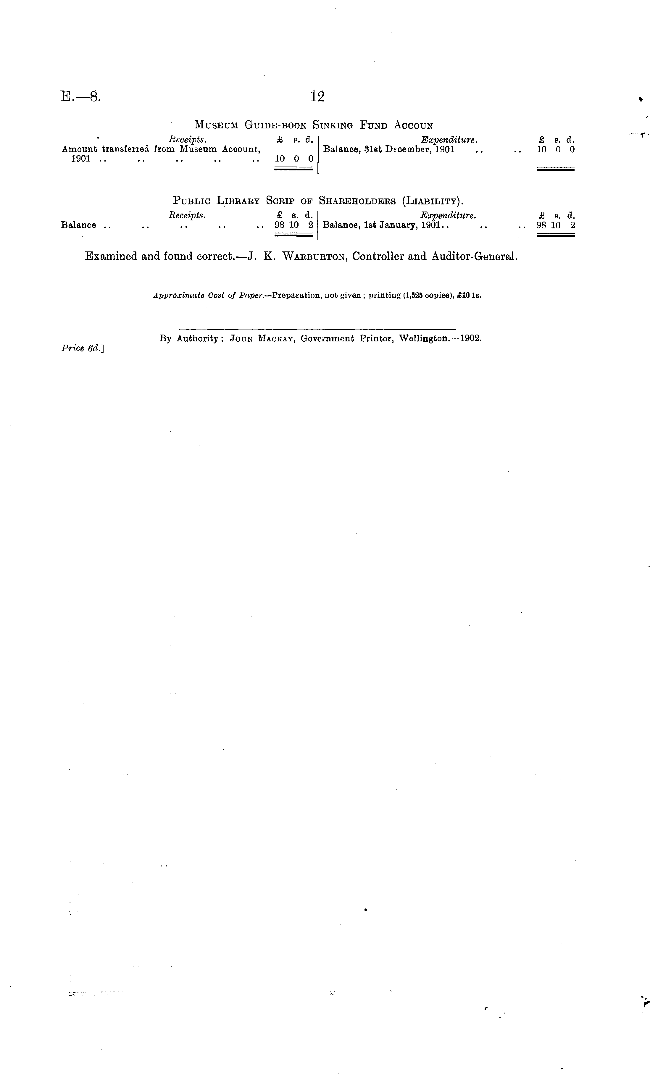 Museum Guide-book Sinking Fund Accoun Receipts. £ s. d. Expenditure. £ s. d. Amount transferred from Museum Acoounfc, Balance, 31et December, 1901 .. .. 10 0 0 1901 .. .. .. .. 10 0 0 Public Libbaby Scrip of Shaeeholdeks (Liability). Receipts. £ s. d. Expenditure. £ p. d. Balance .. .. .. .. .. 98 10 2 Balanoe, Ist January, 1901.. .. .. 98 10 2 Examined and found correct.— J. K. Waebubton, Controller and Auditor-General. Approximate Cost of Paper.—Preparation, not given ; printing (1,525 copies), £10 Is.