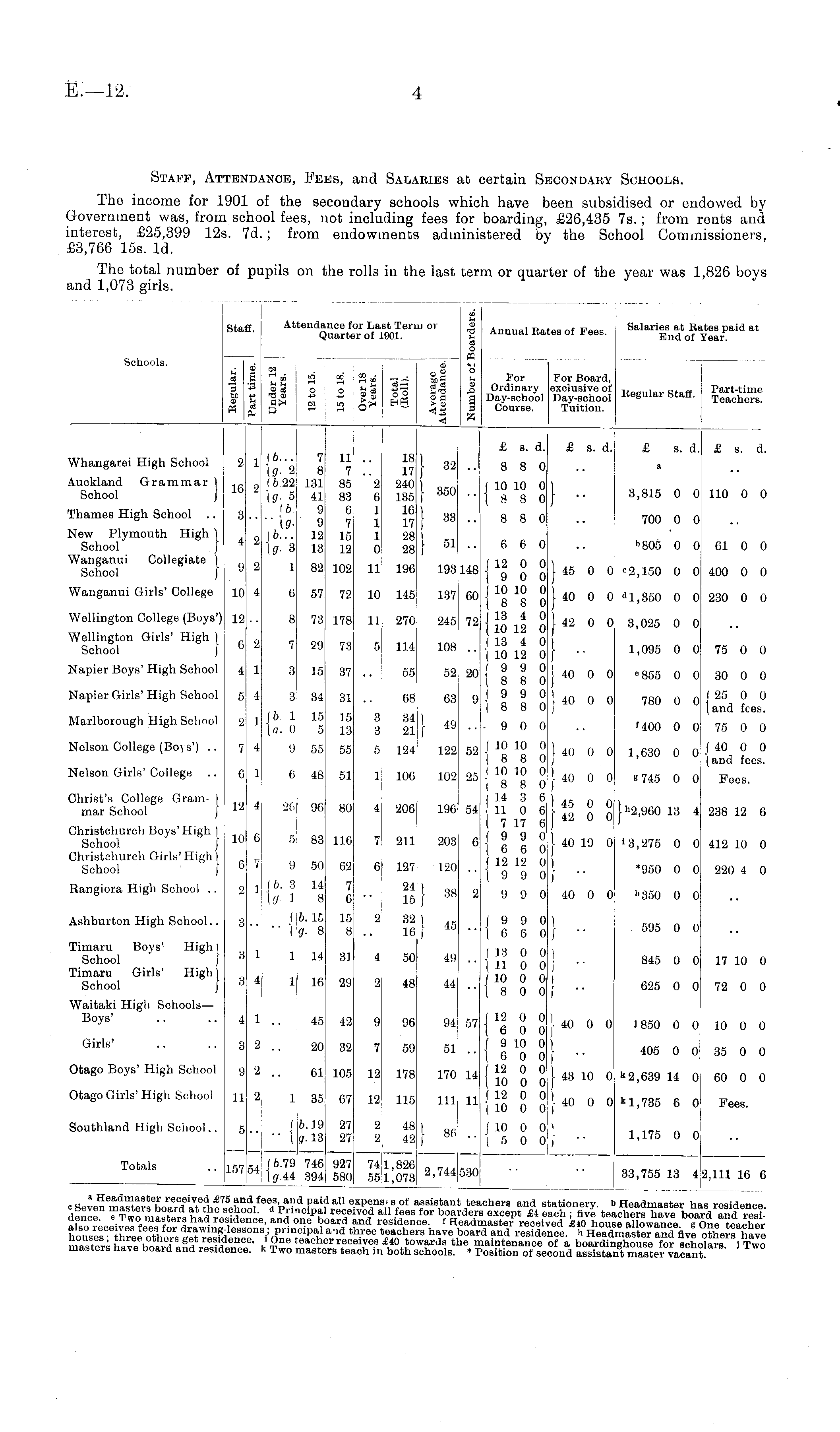 Staff, Attendance, Febs, and Salaries at certain Secondary Schools. The income for 1901 of the secondary schools which have been subsidised or endowed by Government was, from school fees, not including fees for boarding, £26,435 7s. ; from rents and interest, £25,399 12s. 7d.; from endowments administered by the School Commissioners, £3,766 15s. Id. The total number of pupils on the rolls in the last term or quarter of the year was 1,826 boys and 1,073 girls.