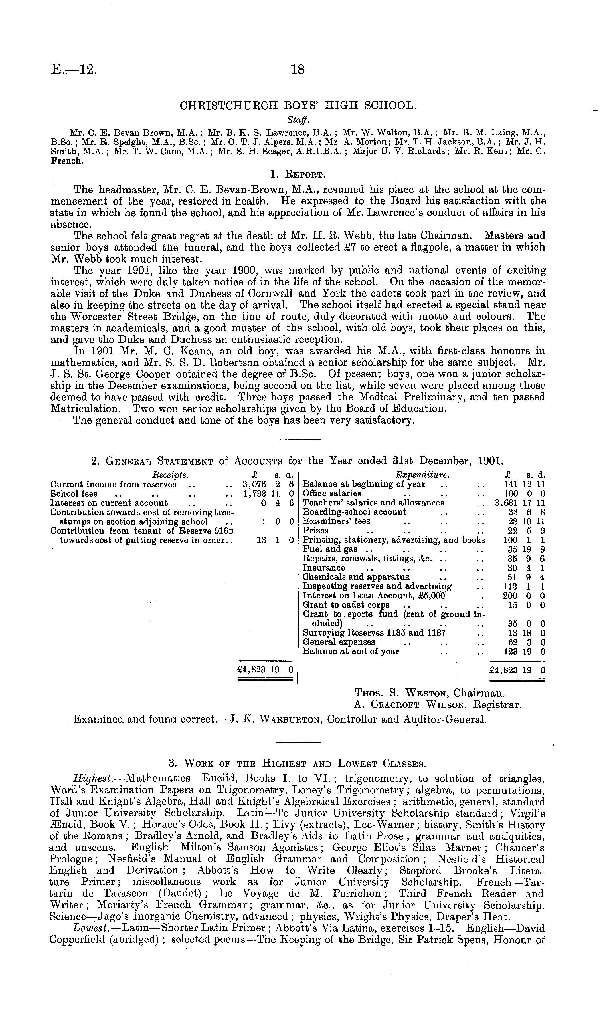 CHEISTCHDECH BOYS' HIGH SCHOOL. Staff. Mr. C. E. Bevan-Brown, M.A. ; Mr. B. K. S. Lawrence, B.A. ; Mr. W. Walton, B.A. ; Mr. R. M. Laing, M.A., B.Se.; Mr. R. Speight, M.A., B.So. ; Mr. 0. T. J. Alpers, M.A.; Mr. A. Merton; Mr. T. H. Jackson, B.A. ; Mr. J. H. Smith, M.A. ; Mr. T. W. Cane, M.A.; Mr. S. H. Seager, A.R.1.8.A. ; Major V. V. Richards; Mr. R. Kent; Mr. G. French. 1. Bepobt. The headmaster, Mr. C. E. Bevan-Brown, M.A., resumed his place at the school at the commencement of the year, restored in health. He expressed to the Board his satisfaction with the state in which he found the school, and his appreciation of Mr. Lawrence's conduce of affairs in his absence. The school felt great regret at the death of Mr. H. E. Webb, the late Chairman. Masters and senior boys attended the funeral, and the boys collected £7 to erect a flagpole, a matter in which Mr. Webb took much interest. The year 1901, like the year 1900, was marked by public and national events of exciting interest, which were duly taken notice of in the life of the school. On the occasion of the memorable visit of the Duke and Duchess of Cornwall and York the cadets took part in the review, and also in keeping the streets on the day of arrival. The school itself had erected a special stand near the Worcester Street Bridge, on the line of route, duly decorated with motto and colours. The masters in academicals, and a good muster of the school, with old boys, took their places on this, and gave the Duke and Duchess an enthusiastic reception. In 1901 Mr. M. C. Keane, an old boy, was awarded his M.A., with first-class honours in mathematics, and Mr. S. S. D. Eobertson obtained a senior scholarship for the same subject. Mr. J. S. St. George Cooper obtained the degree of B.Sc. Of present boys, one won a junior scholarship in the December examinations, being second on the list, while seven were placed among those deemed to have passed with credit. Three boys passed the Medical Preliminary, and ten passed Matriculation. Two won senior scholarships given by the Board of Education. The general conduct and tone of the boys has been very satisfactory.