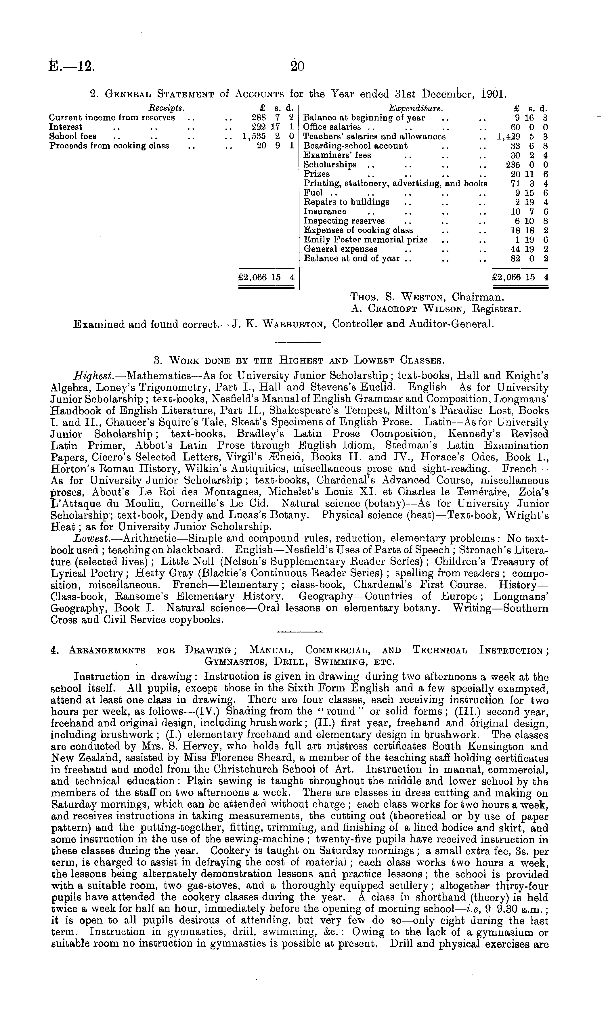 2. Geneeal Statement of Accounts for the Year ended 31st December, 1901; Receipts. £ s. d. Expenditure. £ s. d. Current income from reserves .. .. 288 7 2 Balance at beginning of year .. .. 916 3 Interest .. .. .. .. 222 17 1 Office salaries .. .. .. .. 60 0 0 School fees .. .. .. .. 1,535 2 0 Teaohers' salaries and allowances .. 1,429 5 3 Proceeds from cooking class .. .. 20 9 1 Boarding-school account .. .. 33 6 8 Examiners' fees .. .. .. 30 2 4 Scholarships .. .. .. .. 235 0 0 Prizes .. .. .. .. 20 11 6 Printing, stationery, advertising, and books 71 3 4 Fuel .. .. .. .. .. 9 15 6 Repairs to buildings .. .. .. 219 4 Insurance .. .. .. .. 10 7 6 Inspecting reserves .. .. .. 610 8 Expenses of cooking class .. .. 18 18 2 Emily Foster memorial prize .. .. 119 6 General expenses .. .. .. 44 19 2 Balance at end of year .. .. .. 82 0 2 £2,066 15 4 £2,066 15 4 Thos. S. Weston, Chairman. A. Cbacboft Wilson, Eegistrar. Examined and found correct. — J. K. Waebubton, Controller and Auditor-General.