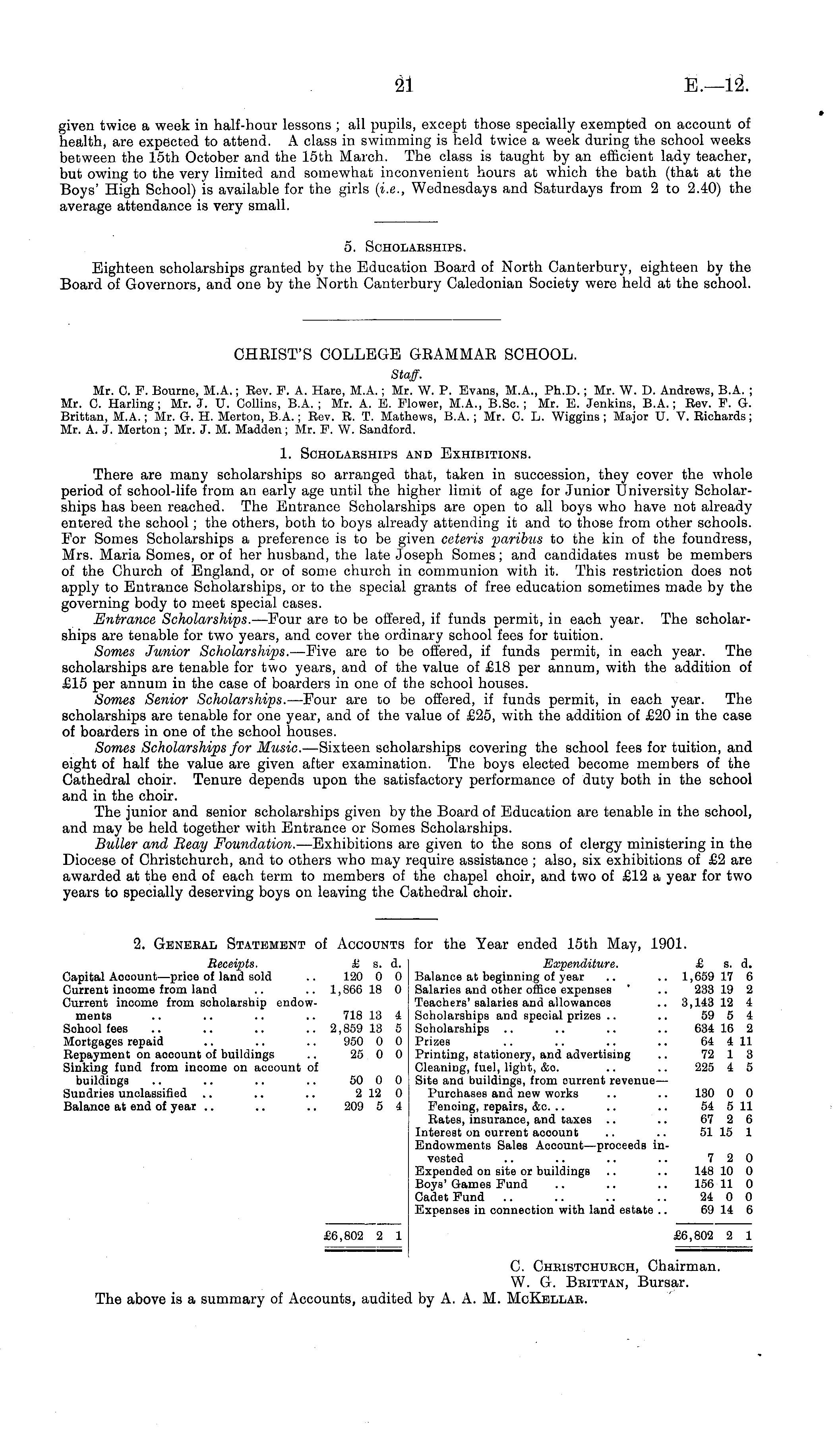 CHEIST'S COLLEGE GKAMMAE SCHOOL. Staff. Mr. C. F. Bourne, M.A.; Bey. F. A. Hare, M.A. ; Mr. W. P. Evans, M.A., Ph.D. ; Mr. W. D. Andrews, B.A. ; Mr. C. Harling; Mr. J. U. Collins, B.A. ; Mr. A. E. Flower, M.A., B.So. ; Mr. E. Jenkins, 8.A.; Rev. F. G. Brittan, M.A.; Mr. G. H. Merton, 8.A.; Rev. R. T. Mathews, B.A. ; Mr. C. L. Wiggins ; Major U. V. Richards; Mr. A. J. Merton ; Mr. J. M. Madden ; Mr. F. W. Sandford. 1. Scholarships and Exhibitions. There are many scholarships so arranged that, taken in succession, they cover the whole period of school-life from an early age until the higher limit of age for Junior "University Scholarships has been reached. The Entrance Scholarships are open to all boys who have not already entered the school; the others, both to boys already attending it and to those from other schools. For Somes Scholarships a preference is to be given ceteris paribus to the kin of the foundress, Mrs. Maria Somes, or of her husband, the late Joseph Somes; and candidates must be members of the Church of England, or of some church in communion with it. This restriction does not apply to Entrance Scholarships, or to the special grants of free education sometimes made by the governing body to meet special cases. Entrance Scholarships. —Pour are to be offered, if funds permit, in each year. The scholarships are tenable for two years, and cover the ordinary school fees for tuition. Somes Junior Scholarships. —Five are to be offered, if funds permit, in each year. The scholarships are tenable for two years, and of the value of £18 per annum, with the addition of £15 per annum in the case of boarders in one of the school houses. Somes Senior Scholarships. —Four are to be offered, if funds permit, in each year. The scholarships are tenable for one year, and of the value of £25, with the addition of £20 in the case of boarders in one of the school houses. Somes Scholarships for Music. —Sixteen scholarships covering the school fees for tuition, and eight of half the value are given after examination. The boys elected become members of the Cathedral choir. Tenure depends upon the satisfactory performance of duty both in the school and in the choir. The junior and senior scholarships given by the Board of Education are tenable in the school, and may be held together with Entrance or Somes Scholarships. Butter and Beay Foundation. —Exhibitions are given to the sons of clergy ministering in the Diocese of Christchurch, and to others who may require assistance ; also, six exhibitions of £2 are awarded at the end of each term to members of the chapel choir, and two of £12 a year for two years to specially deserving boys on leaving the Cathedral choir.
