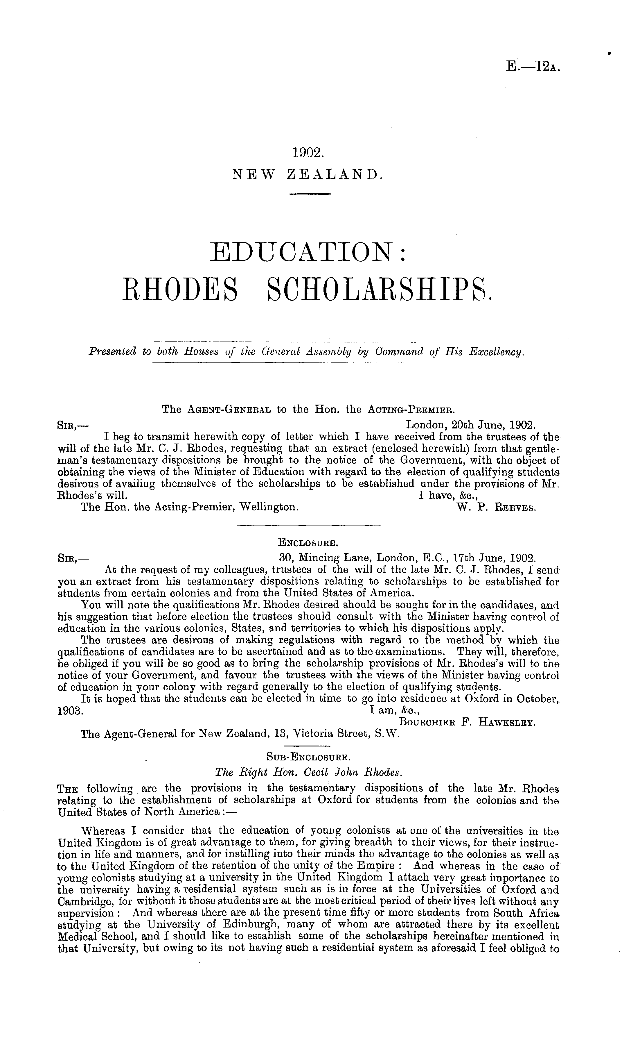 Enclosure. Sir,— 30, Mincing Lane, London, E.C., 17th June, 1902. At the request of my colleagues, trustees of the will of the late Mr. C. J. Rhodes, I send you an extract from his testamentary dispositions relating to scholarships to be established for students from certain colonies and from the United States of America. You will note the qualifications Mr. Rhodes desired should be sought for in the candidates, and his suggestion that before election the trustees should consult with the Minister having control of education in the various colonies, States, and territories to which his dispositions apply. The trustees are desirous of making regulations with regard to the method by which the qualifications of candidates are to be ascertained and as to the examinations. They will, therefore, be obliged if you will be so good as to bring the scholarship provisions of Mr. Rhodes's will to the notice of your Government, and favour the trustees with the views of the Minister having control of education in your colony with regard generally to the election of qualifying students. It is hoped that the students can be elected in time to go into residence at Oxford in October, 1903. I am, &c, Bourchier F. Hawksley. The Agent-General for New Zealand, 13, Victoria Street, S.W.