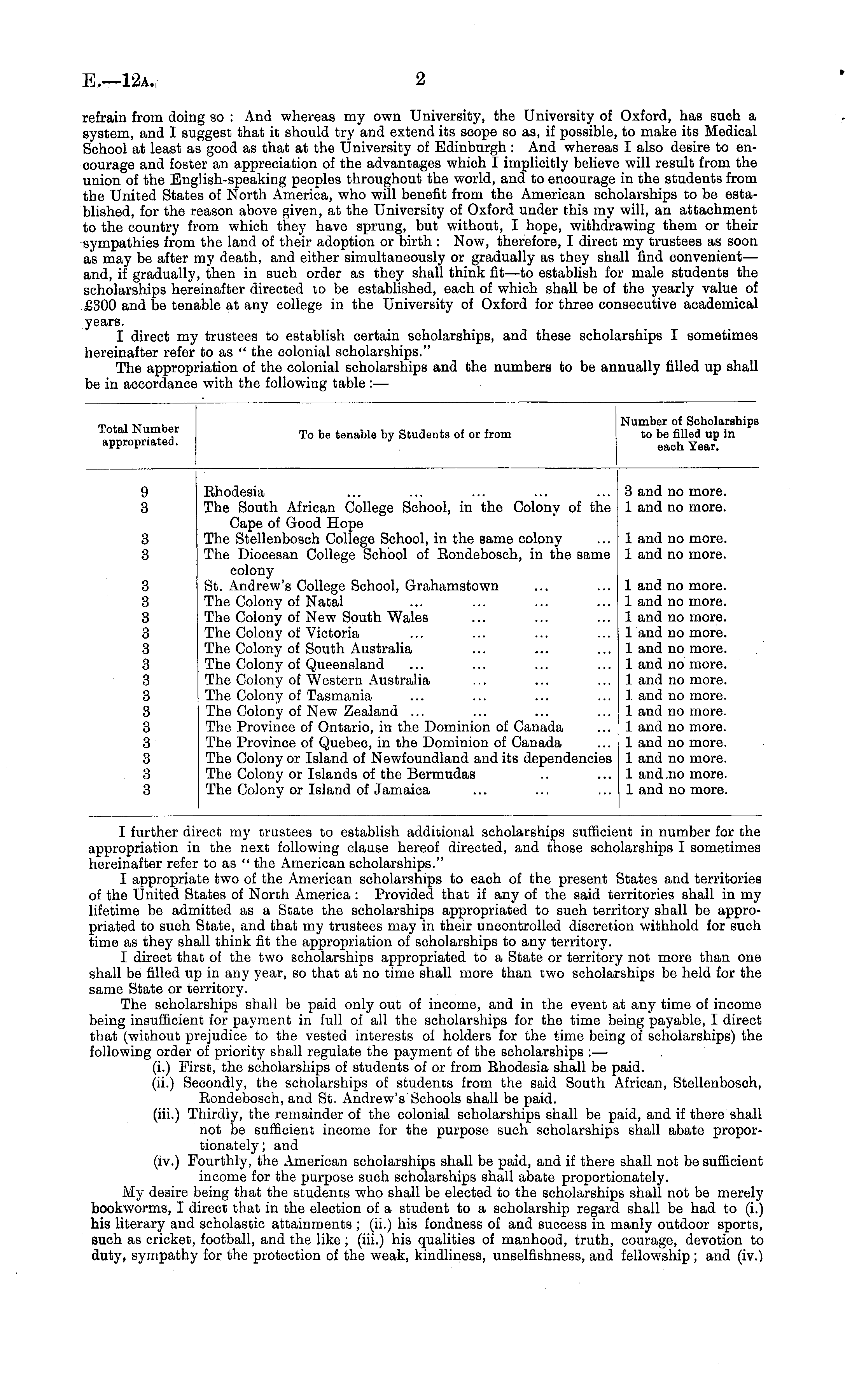 I further direct my trustees to establish additional scholarships sufficient in number for the appropriation in the next following clause hereof directed, and those scholarships I sometimes hereinafter refer to as " the American scholarships." I appropriate two of the American scholarships to each of the present States and territories of the United States of North America : Provided that if any of the said territories shall in my lifetime be admitted as a State the scholarships appropriated to such territory shall be appropriated to such State, and that my trustees may in their uncontrolled discretion withhold for such time as they shall think fit the appropriation of scholarships to any territory. I direct that of the two scholarships appropriated to a State or territory not more than one shall be filled up in any year, so that at no time shall more than two scholarships be held for the same State or territory. The scholarships shall be paid only out of income, and in the event at any time of income being insufficient for payment in full of all the scholarships for the time being payable, I direct that (without prejudice to the vested interests of holders for the time being of scholarships) the following order of priority shall regulate the payment of the scholarships : — (i.) First, the scholarships of students of or from Rhodesia shall be paid. (ii.) Secondly, the scholarships of students from the said South African, Stellenbosch, Rondebosch, and St. Andrew's Schools shall be paid, (iii.) Thirdly, the remainder of the colonial scholarships shall be paid, and if there shall not be sufficient income for the purpose such scholarships shall abate proportionately ; and (iv.) Fourthly, the American scholarships shall be paid, and if there shall not be sufficient income for the purpose such scholarships shall abate proportionately. My desire being that the students who shall be elected to the scholarships shall not be merely bookworms, I direct that in the election of a student to a scholarship regard shall be had to (i.) his literary and scholastic attainments ; (ii.) his fondness of and success in manly outdoor sports, such as cricket, football, and the like; (iii.) his qualities of manhood, truth, courage, devotion to duty, sympathy for the protection of the weak, kindliness, unselfishness, and fellowship ; and (iv.)