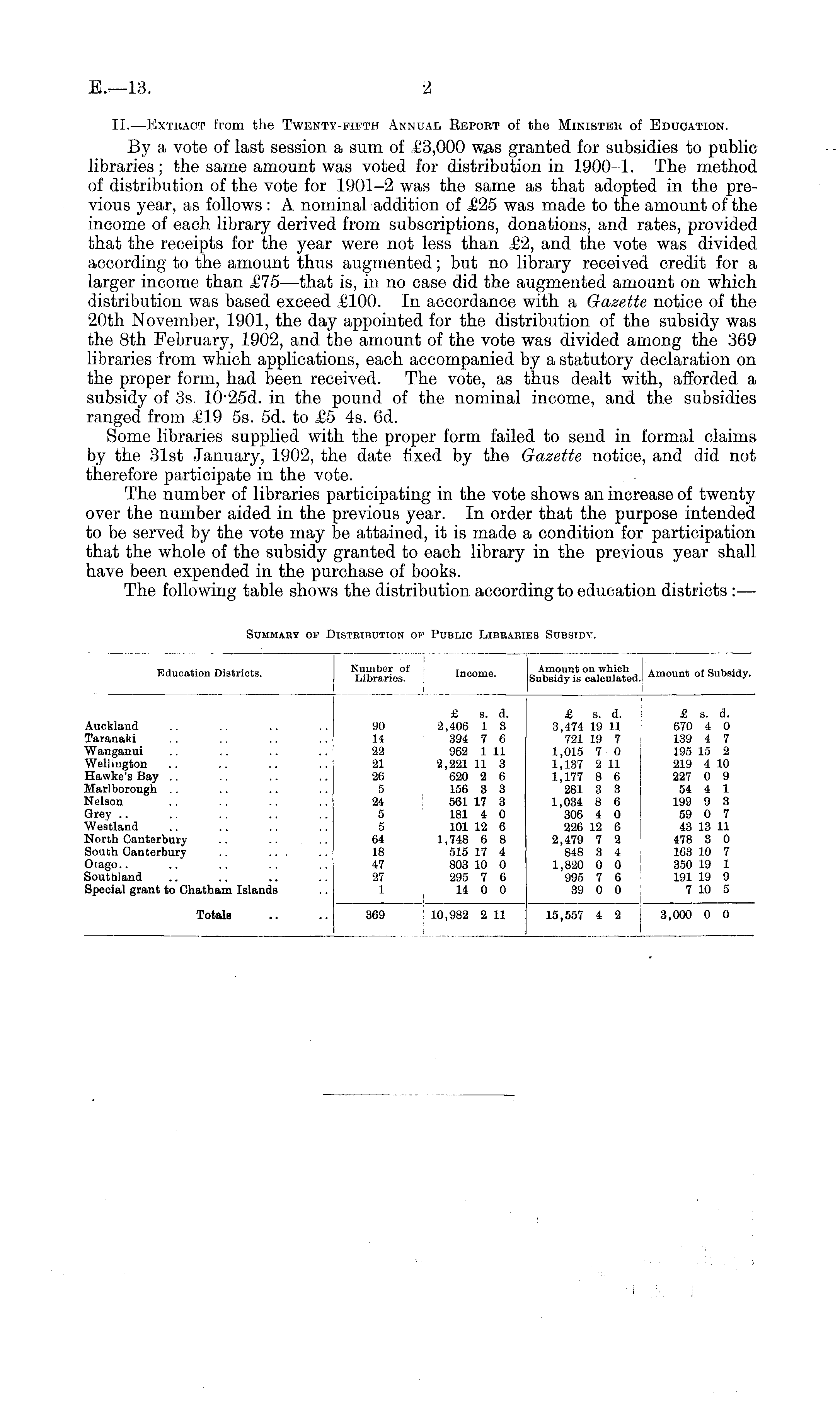 ll.—Extract from the Twenty-fifth Annual Eepoet of the Minister of Education. By a vote of last session a sum of £3,000 was granted for subsidies to public libraries; the same amount was voted for distribution in 1900-1. The method of distribution of the vote for 1901-2 was the same as that adopted in the previous year, as follows : A nominal addition of £25 was made to the amount of the income of each library derived from subscriptions, donations, and rates, provided that the receipts for the year were not less than £2, and the vote was divided according to the amount thus augmented; but no library received credit for a larger income than £75 —that is, in no case did the augmented amount on which distribution was based exceed £100. In accordance with a Gazette notice of the 20th November, 1901, the day appointed for the distribution of the subsidy was the Bth February, 1902, and the amount of the vote was divided among the 369 libraries from which applications, each accompanied by a statutory declaration on the proper form, had been received. The vote, as thus dealt with, afforded a subsidy of 3s. 10 - 25 d. in the pound of the nominal income, and the subsidies ranged from .£l9 ss. sd. to £5 4s. 6d. Some libraries supplied with the proper form failed to send in formal claims by the 31st January, 1902, the date fixed by the Gazette notice, and did not therefore participate in the vote. The number of libraries participating in the vote shows an increase of twenty over the number aided in the previous year. In order that the purpose intended to be served by the vote may be attained, it is made a condition for participation that the whole of the subsidy granted to each library in the previous year shall have been expended in the purchase of books. The following table shows the distribution according to education districts : —