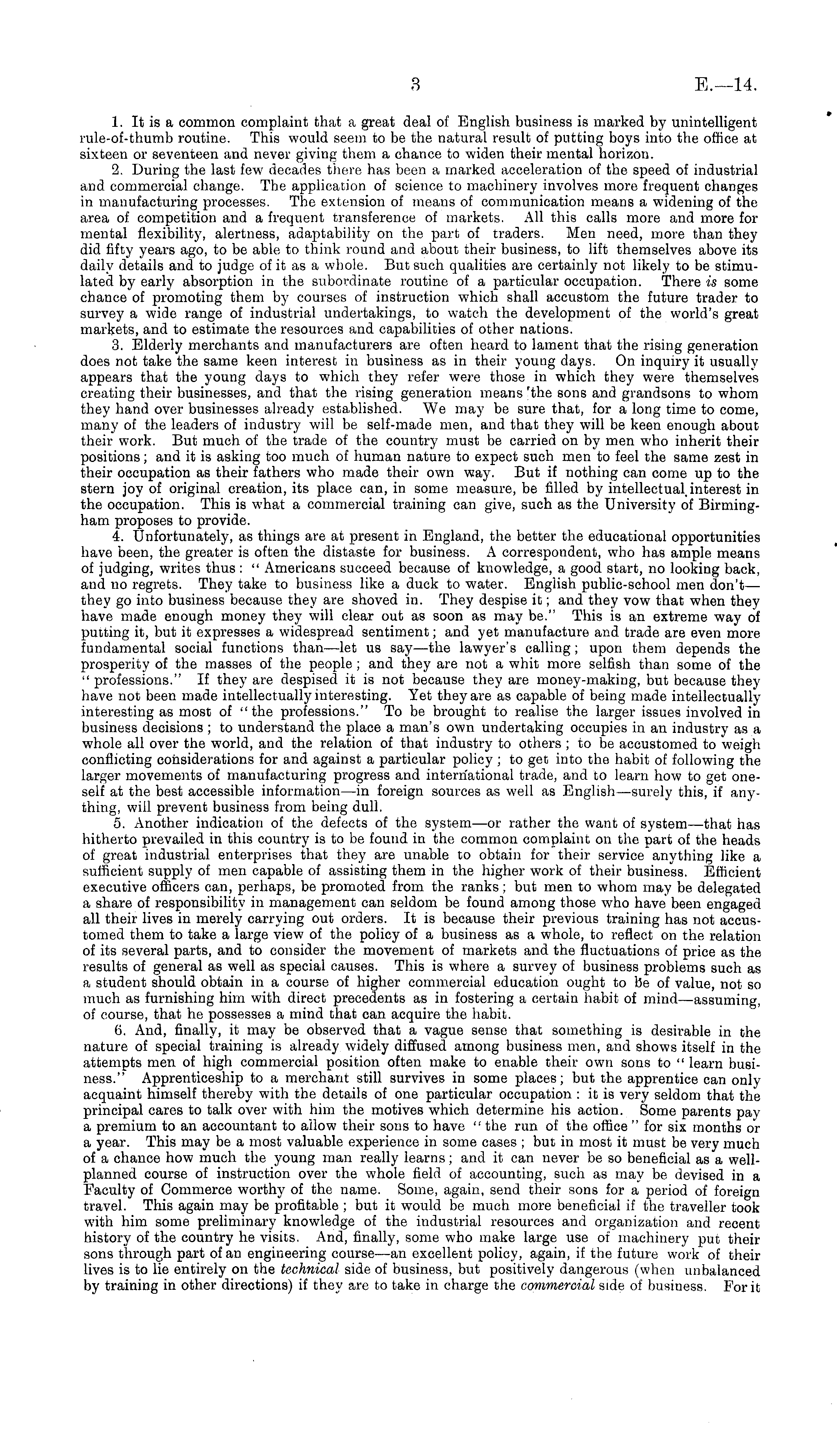 1. It is a common complaint that a great deal of English business is marked by unintelligent rule-of-thumb routine. This would seem to be the natural result of putting boys into the office at sixteen or seventeen and never giving them a chance to widen their mental horizon. 2. During the last few decades there has been a marked acceleration of the speed of industrial and commercial change. The application of science to machinery involves more frequent changes in manufacturing processes. The extension of means of communication means a widening of the area of competition and a frequent transference of markets. All this calls more and more for mental flexibility, alertness, adaptability on the part of traders. Men need, more than they did fifty years ago, to be able to think round and about their business, to lift themselves above its daily details and to judge of it as a whole. But such qualities are certainly not likely to be stimulated by early absorption in the subordinate routine of a particular occupation. There is some chance of promoting them by courses of instruction which shall accustom the future trader to survey a wide range of industrial undertakings, to watch the development of the world's great markets, and to estimate the resources and capabilities of other nations. 3. Elderly merchants and manufacturers are often heard to lament that the rising generation does not take the same keen interest in business as in their young days. On inquiry it usually appears that the young days to which they refer were those in which they were themselves creating their businesses, and that the rising generation means r the sons and grandsons to whom they hand over businesses already established. We may be sure that, for a long time to come, many of the leaders of industry will be self-made men, and that they will be keen enough about their work. But much of the trade of the country must be carried on by men who inherit their positions; and it is asking too much of human nature to expect such men to feel the same zest in their occupation as their fathers who made their own way. But if nothing can come up to the stern joy of original creation, its place can, in some measure, be filled by intellectual, interest in the occupation. This is what a commercial training can give, such as the University of Birmingham proposes to provide. 4. Unfortunately, as things are at present in England, the better the educational opportunities have been, the greater is often the distaste for business. A correspondent, who has ample means of judging, writes thus : " Americans succeed because of knowledge, a good start, no looking back, and no regrets. They take to business like a duck to water. English public-school men don't— they go into business because they are shoved in. They despise it; and they vow t that when they have made enough money they will clear out as soon as may be." This is an extreme way of putting it, but it expresses a widespread sentiment; and yet manufacture and trade are even more fundamental social functions than—let us say—the lawyer's calling ; upon them depends the prosperity of the masses of the people ; and they are not a whit more selfish than some of the " professions." If they are despised it is not because they are money-making, but because they have not been made intellectually interesting. Yet they are as capable of being made intellectually interesting as most of "the professions." To be brought to realise the larger issues involved in business decisions ; to understand the place a man's own undertaking occupies in an industry as a whole all over the world, and the relation of that industry to others ; to be accustomed to weigh conflicting considerations for and against a particular policy ; to get into the habit of following the larger movements of manufacturing progress and international trade, and to learn how to get oneself at the best accessible information—in foreign sources as well as English—surely this, if anything, will prevent business from being dull. 5. Another indication of the defects of the system —or rather the want of system—that has hitherto prevailed in this country is to be found in the common complaint on the part of the heads of great industrial enterprises that they are unable to obtain for their service anything like a sufficient supply of men capable of assisting them in the higher work of their business. Efficient executive officers can, perhaps, be promoted from the ranks; but men to whom may be delegated a share of responsibility in management can seldom be found among those who have been engaged all their lives in merely carrying out orders. It is because their previous training has not accustomed them to take a large view of the policy of a business as a whole, to reflect on the relation of its several parts, and to consider the movement of markets and the fluctuations of price as the results of general as well as special causes. This is where a survey of business problems such as a student should obtain in a course of higher commercial education ought to be of value, not so much as furnishing him with direct precedents as in fostering a certain habit of mind—assuming, of course, that he possesses a mind that can acquire the habit. 6. And, finally, it may be observed that a vague sense that something is desirable in the nature of special training is already widely diffused among business men, and shows itself in the attempts men of high commercial position often make to enable their own sons to " learn business." Apprenticeship to a merchant still survives in some places; but the apprentice can only acquaint himself thereby with the details of one particular occupation : it is very seldom that the principal cares to talk over with him the motives which determine his action. Some parents pay a premium to an accountant to allow their sous to have " the run of the office " for six months or a year. This may be a most valuable experienc