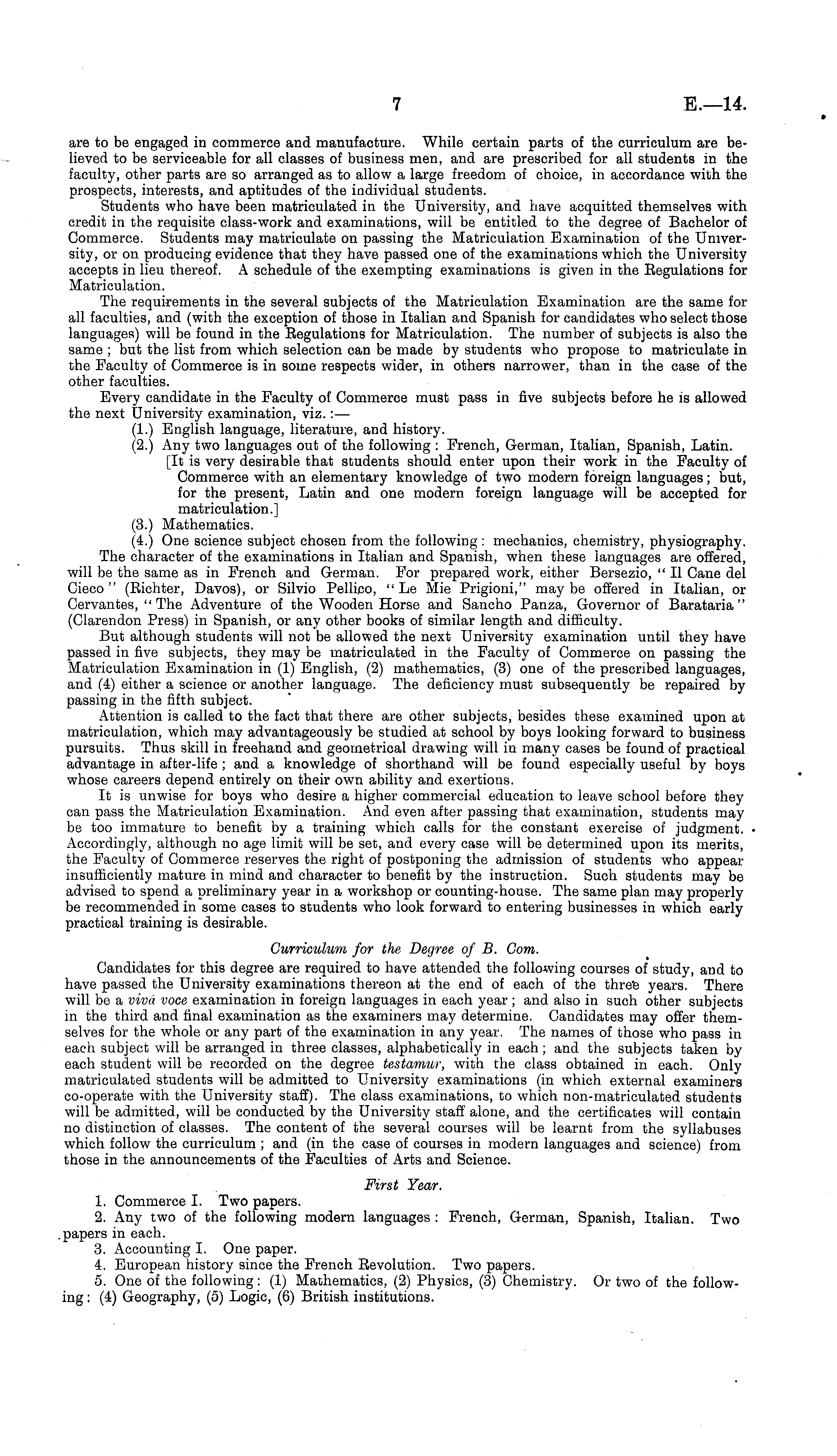 are to be engaged in commerce and manufacture. While certain parts of the curriculum are believed to be serviceable for all classes of business men, and are prescribed for all students in the faculty, other parts are so arranged as to allow a large freedom of choice, in accordance with the prospects, interests, and aptitudes of the individual students. Students who have been matriculated in the University, and have acquitted themselves with credit in the requisite class-work and examinations, will be entitled to the degree of Bachelor of Commerce. Students may matriculate on passing the Matriculation Examination of the University, or on producing evidence that they have passed one of the examinations which the University accepts in lieu thereof. A schedule of the exempting examinations is given in the Regulations for Matriculation. The requirements in the several subjects of the Matriculation Examination are the same for all faculties, and (with the exception of those in Italian and Spanish for candidates who select those languages) will be found in the Regulations for Matriculation. The number of subjects is also the same ; but the list from which selection can be made by students who propose to matriculate in the Faculty of Commerce is in some respects wider, in others narrower, than in the case of the other faculties. Every candidate in the Faculty of Commerce must pass in five subjects before he is allowed the next University examination, viz.: — (1.) English language, literature, and history. (2.) Any two languages out of the following : French, German, Italian, Spanish, Latin. [It is very desirable that students should enter upon their work in the Faculty of Commerce with an elementary knowledge of two modern foreign languages; but, for the present, Latin and one modern foreign language will be accepted for matriculation.] (3.) Mathematics. (4.) One science subject chosen from the following : mechanics, chemistry, physiography. The character of the examinations in Italian and Spanish, when these languages are offered, will be the same as in French and German. For prepared work, either Bersezio, "II Cane del Cieeo " (Richter, Davos), or Silvio Pellico, "Le Mie Prigioni," maybe offered in Italian, or Cervantes, " The Adventure of the Wooden Horse and Sancho Panza, Governor of Barataria " (Clarendon Press) in Spanish, or any other books of similar length and difficulty. But although students will not be allowed the next University examination until they have passed in five subjects, they may be matriculated in the Faculty of Commerce on passing the Matriculation Examination in (1) English, (2) mathematics, (3) one of the prescribed languages, and (4) either a science or another language. The deficiency must subsequently be repaired by passing in the fifth subject. Attention is called to the fact that there are other subjects, besides these examined upon at matriculation, which may advantageously be studied at school by boys looking forward to business pursuits. Thus skill in freehand and geometrical drawing will in many cases be found of practical advantage in after-life ; and a knowledge of shorthand will be found especially useful by boys whose careers depend entirely on their own ability and exertions. It is unwise for boys who desire a higher commercial education to leave school before they can pass the Matriculation Examination. And even after passing that examination, students may be too immature to benefit by a training which calls for the constant exercise of judgment. Accordingly, although no age limit will be set, and every case will be determined upon its merits, the Faculty of Commerce reserves the right of postponing the admission of students who appear insufficiently mature in mind and character to benefit by the instruction. Such students may be advised to spend a preliminary year in a workshop or counting-house. The same plan may properly be recommended in some cases to students who look forward to entering businesses in which early practical training is desirable. Curriculum for the Degree of B. Com. Candidates for this degree are required to have attended the following courses of study, and to have passed the University examinations thereon at the end of each of the threfe years. There will be a viva voce examination in foreign languages in each year; and also in such other subjects in the third and final examination as the examiners may determine. Candidates may offer themselves for the whole or any part of the examination in any year. The names of those who pass in each subject will be arranged in three classes, alphabetically in each; and the subjects taken by each student will be recorded on the degree testamur, with the class obtained in each. Only matriculated students will be admitted to University examinations (in which external examiners co-operate with the University staff). The class examinations, to which non-matriculated students will be admitted, will be conducted by the University staff alone, and the certificates will contain no distinction of classes. The content of the several courses will be learnt from the syllabuses which follow the curriculum ; and (in the case of courses in modern languages and science) from those in the announcements of the Faculties of Arts and Science. First Year. 1. Commerce I. Two papers. 2. Any two of the following modern languages : French, German, Spanish, Italian. Two papers in each. 3. Accounting I. One paper. 4. European history since the French Revolution. Two papers. 5. One of the following: (1) Mathematics, (2) Physics, (3) Chemistry. Or two of the following : (4) Geography, (5) Logic, (6) British institutions.