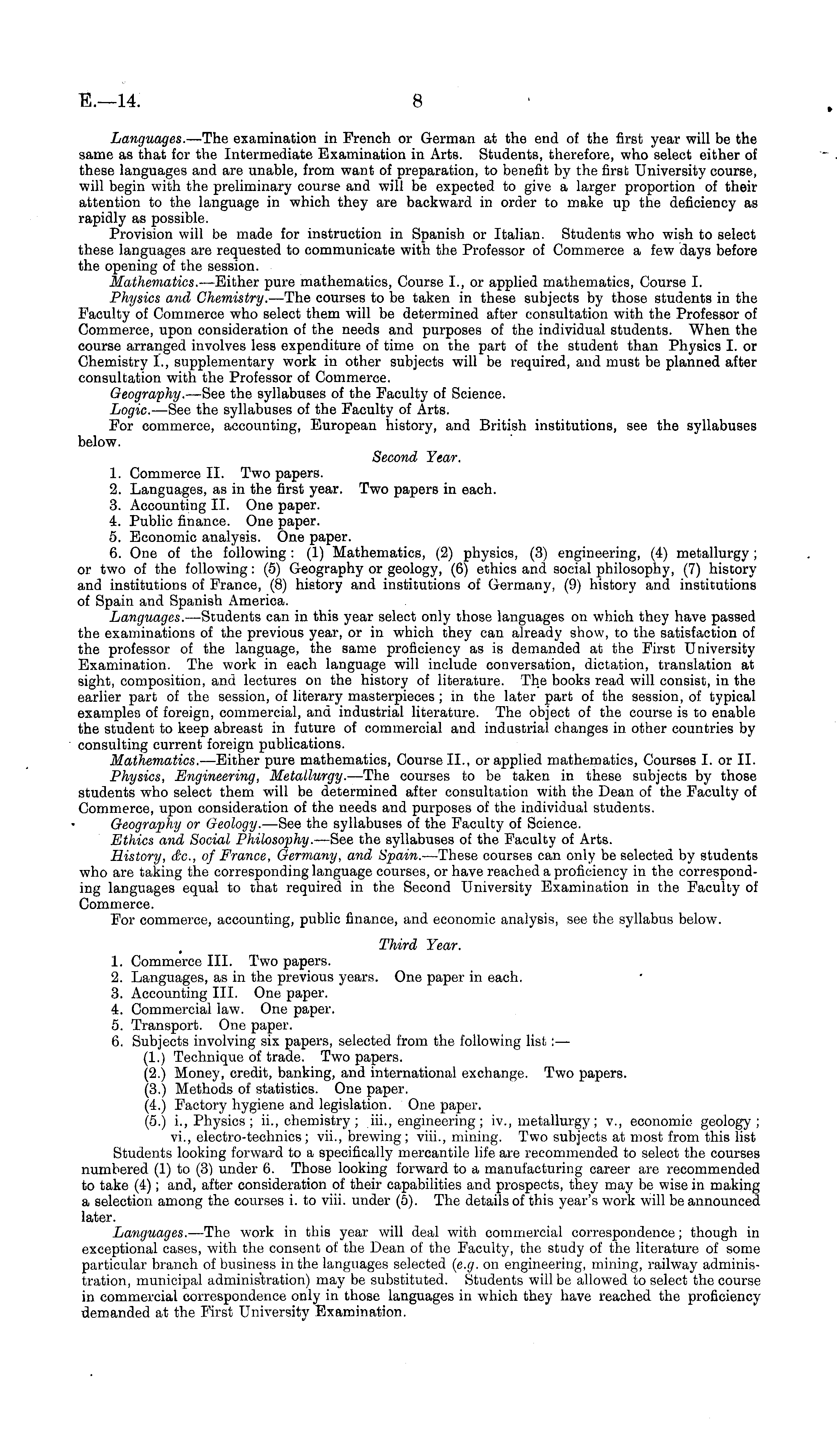 Languages. —The examination in French or German at the end of the first year will be the same as that for the Intermediate Examination in Arts. Students, therefore, who select either of these languages and are unable, from want of preparation, to benefit by the first University course, will begin with the preliminary course and will be expected to give a larger proportion of their attention to the language in which they are backward in order to make up the deficiency as rapidly as possible. Provision will be made for instruction in Spanish or Italian. Students who wish to select these languages are requested to communicate with the Professor of Commerce a few days before the opening of the session. Mathematics. —Either pure mathematics, Course L, or applied mathematics, Course I. Physics and Chemistry.- —The courses to be taken in these subjects by those students in the Faculty of Commerce who select them will be determined after consultation with the Professor of Commerce, upon consideration of the needs and purposes of the individual students. When the course arranged involves less expenditure of time on the part of the student than Physics I. or Chemistry 1., supplementary work in other subjects will be required, and must be planned after consultation with the Professor of Commerce. Geography. —See the syllabuses of the Faculty of Science. Logic. —See the syllabuses of the Faculty of Arts. For commerce, accounting, European history, and British institutions, see the syllabuses below. Second Year. 1. Commerce 11. Two papers. 2. Languages, as in the first year. Two papers in each. 3. Accounting 11. One paper. 4. Public finance. One paper. 5. Economic analysis. One paper. 6. One of the following: (1) Mathematics, (2) physics, (3) engineering, (4) metallurgy; or two of the following: (5) Geography or geology, (6) ethics and social philosophy, (7) history and institutions of France, (8) history and institutions of Germany, (9) history and institutions of Spain and Spanish America. Languages. —Students can in this year select only those languages on which they have passed the examinations of the previous year, or in which they can already show, to the satisfaction of the professor of the language, the same proficiency as is demanded at the First University Examination. The work in each language will include conversation, dictation, translation at sight, composition, and lectures on the history of literature. The books read will consist, in the earlier part of the session, of literary masterpieces; in the later part of the session, of typical examples of foreign, commercial, and industrial literature. The object of the course is to enable the student to keep abreast in future of commercial and industrial changes in other countries by consulting current foreign publications. Mathematics. —Either pure mathematics, Course 11., or applied mathematics, Courses I. or 11. Physics, Engineering, Metallurgy. —The courses to be taken in these subjects by those students who select them will be determined after consultation with the Dean of the Faculty of Commerce, upon consideration of the needs and purposes of the individual students. Geography or Geology. —See the syllabuses of the Faculty of Science. Ethics and Social Philosophy. —See the syllabuses of the Faculty of Arts. History, &c, of France, Germany, and Spain. —These courses can only be selected by students who are taking the corresponding language courses, or have reached a proficiency in the corresponding languages equal to that required in the Second University Examination in the Faculty of Commerce. For commerce, accounting, public finance, and economic analysis, see the syllabus below. Third Year. 1. Commerce 111. Two papers. 2. Languages, as in the previous years. One paper in each. 3. Accounting 111. One paper. 4. Commercial law. One paper. 5. Transport. One paper. 6. Subjects involving six papers, selected from the following list: — (1.) Technique of trade. Two papers. (2.) Money, credit, banking, and international exchange. Two papers. (3.) Methods of statistics. One paper. (4.) Factory hygiene and legislation. One paper. (5.) i., Physics; ii., chemistry ; iii., engineering; iv., metallurgy; v., economic geology; vi., electro-technics; vii., brewing; viii., mining. Two subjects at most from this list Students looking forward to a specifically mercantile life are recommended to select the courses numbered (1) to (3) under 6. Those looking forward to a manufacturing career are recommended to take (4); and, after consideration of their capabilities and prospects, they may be wise in making a selection among the courses i. to viii. under (5). The details of this year's work will be announced later. Languages. —The work in this year will deal with commercial correspondence; though in exceptional cases, with the consent of the Dean of the Faculty, the study of the literature of some particular branch of business in the languages selected (e.g. on engineering, mining, railway administration, municipal administration) may be substituted. Students will be allowed to select the course in commercial correspondence only in those languages in which they have reached the proficiency demanded at the First University Examination.