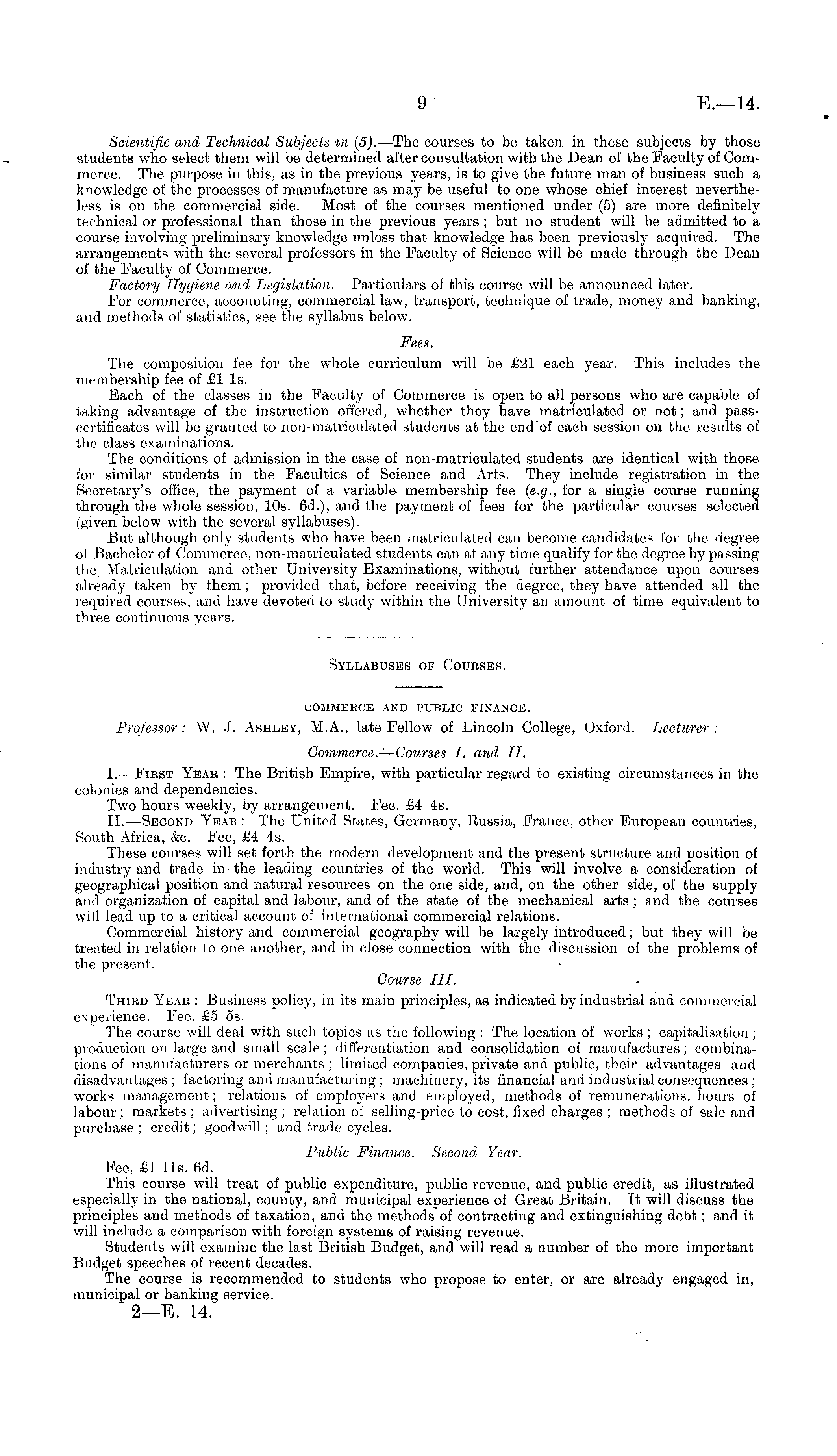 Scientific and Technical Subjects in (5). —The courses to be taken in these subjects by those students who select them will be determined after consultation with the Dean of the Faculty of Commerce. The purpose in this, as in the previous years, is to give the future man of business such a knowledge of the processes of manufacture as may be useful to one whose chief interest nevertheless is on the commercial side. Most of the courses mentioned under (5) are more definitely technical or professional than those in the previous years ; but no student will be admitted to a course involving preliminary knowledge unless that knowledge has been previously acquired. The arrangements with the several professors in the Faculty of Science will be made through the Dean of the Faculty of Commerce. Factory Hygiene and Legislation.-— Particulars of this course will be announced later. For commerce, accounting, commercial law, transport, technique of trade, money and banking, and methods of statistics, see the syllabus below. Fees. The composition fee for the whole curriculum will be £21 each year. This includes the membership fee of £1 Is. Bach of the classes in the Faculty of Commerce is open to all persons who are capable of taking advantage of the instruction offered, whether they have matriculated or not; and passcertificates will be granted to non-matriculated students at the end'of each session on the results of the class examinations. The conditions of admission in the ease of non-matriculated students are identical with those for similar students in the Faculties of Science and Arts. They include registration in the Secretary's office, the payment of a variable membership fee (e.g., for a single course running through the whole session, 10s. 6d.), and the payment of fees for the particular courses selected (given below with the several syllabuses). But although only students who have been matriculated can become candidates for the degree of Bachelor of Commerce, non-matriculated students can at any time qualify for the degree by passing the. Matriculation and other University Examinations, without further attendance upon courses already taken by them ; provided that, before receiving the degree, they have attended all the required courses, and have devoted to study within the University an amount of time equivalent to three continuous yea.rs.