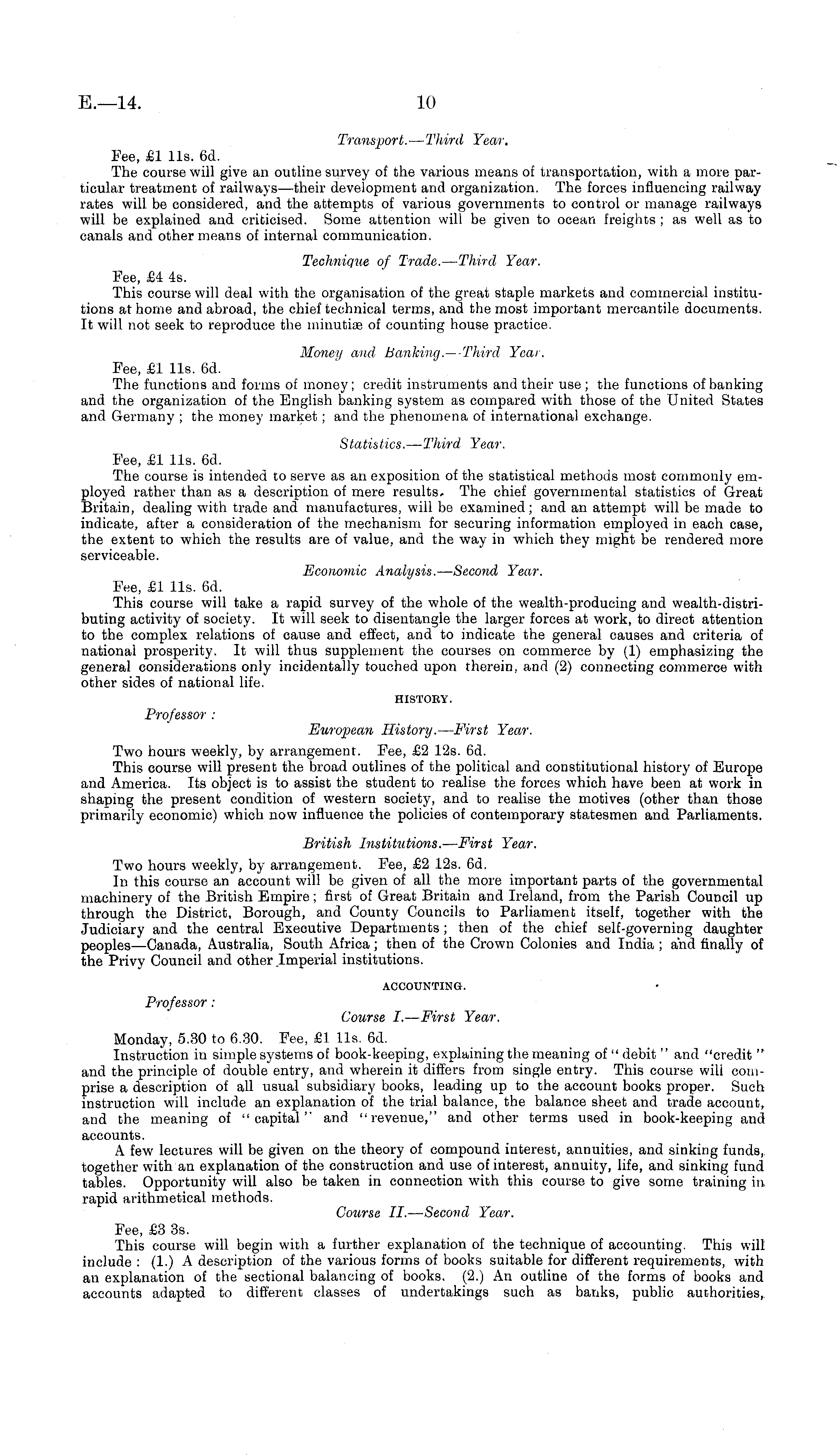 Transport. — Third Yean\ Fee, £1 11s. 6d. The course will give an outline survey of the various means of transportation, with a more particular treatment of railways—their development and organization. The forces influencing railway rates will be considered, and the attempts of various governments to control or manage railways will be explained and criticised. Some attention will be given to ocean freights ; as well as to canals and other means of internal communication. Technique of Trade. — Third Year. Fee, £4 4s. This course will deal with the organisation of the great staple markets and commercial institutions at home and abroad, the chief technical terms, and the most important mercantile documents. It will not seek to reproduce the minutiae of counting house practice. Money and Banking.—-Third Yea/. Fee, £1 lls. 6d. The functions and forms of money; credit instruments and their use ; the functions of banking and the organization of the English banking system as compared with those of the United States and Germany ; the money market; and the phenomena of international exchange. Statistics. — Third Year. Fee, £1 lls. 6d. The course is intended to serve as an exposition of the statistical methods most commonly employed rather than as a description of mere results- The chief governmental statistics of Great Britain, dealing with trade and manufactures, will be examined; and an attempt will be made to indicate, after a consideration of the mechanism for securing information employed in each case, the extent to which the results are of value, and the way in which they might be rendered more serviceable. Economic Analysis. — Second Year. Fee, £1 lls. 6d. This course will take a rapid survey of the whole of the wealth-producing and wealth-distri-buting activity of society. It will seek to disentangle the larger forces at work, to direct attention to the complex relations of cause and effect, and to indicate the general causes and criteria of national prosperity. It will thus supplement the courses on commerce by (1) emphasizing the general considerations only incidentally touched upon therein, and (2) connecting commerce with other sides of national life. HISTORY. Professor : European History. — First Year. Two hours weekly, by arrangement. Fee, £2 12s. 6d. This course will present the broad outlines of the political and constitutional history of Europe and America. Its object is to assist the student to realise the forces which have been at work in shaping the present condition of western society, and to realise the motives (other than those primarily economic) which now influence the policies of contemporary statesmen and Parliaments. British Institutions. — First Year. Two hours weekly, by arrangement. Fee, £2 12s. 6d. In this course an account will be given of all the more important parts of the governmental machinery of the British Empire; first of Great Britain and Ireland, from the Parish Council up through the District, Borough, and County Councils to Parliament itself, together with the Judiciary and the central Executive Departments; then of the chief self-governing daughter peoples —Canada, Australia, South Africa ; then of the Crown Colonies and India ; and finally of the Privy Council and other Imperial institutions. ACCOUNTING. Professor: Course I. — First Year. Monday, 5.30 to 6.30. Fee, £1 lls. 6d. Instruction in simple systems of book-keeping, explaining the meaning of " debit " and "credit " and the principle of double entry, and wherein it differs from single entry. This course will comprise a description of all usual subsidiary books, leading up to the account books proper. Such instruction will include an explanation of the trial balance, the balance sheet and trade account, and the meaning of "capital , ' and "revenue," and other terms used in book-keeping and accounts. A few lectures will be given on the theory of compound interest, annuities, and sinking funds, together with an explanation of the construction and use of interest, annuity, life, and sinking fund tables. Opportunity will also be taken in connection with this course to give some training in. rapid arithmetical methods. Course II. — Second Year. Fee, £3 3s. This course will begin with a further explanation of the technique of accounting. This will include : (1.) A description of the various forms of books suitable for different requirements, with an explanation of the sectional balancing of books. (2.) An outline of the forms of books and accounts adapted to different classes of undertakings such as banks, public authorities,