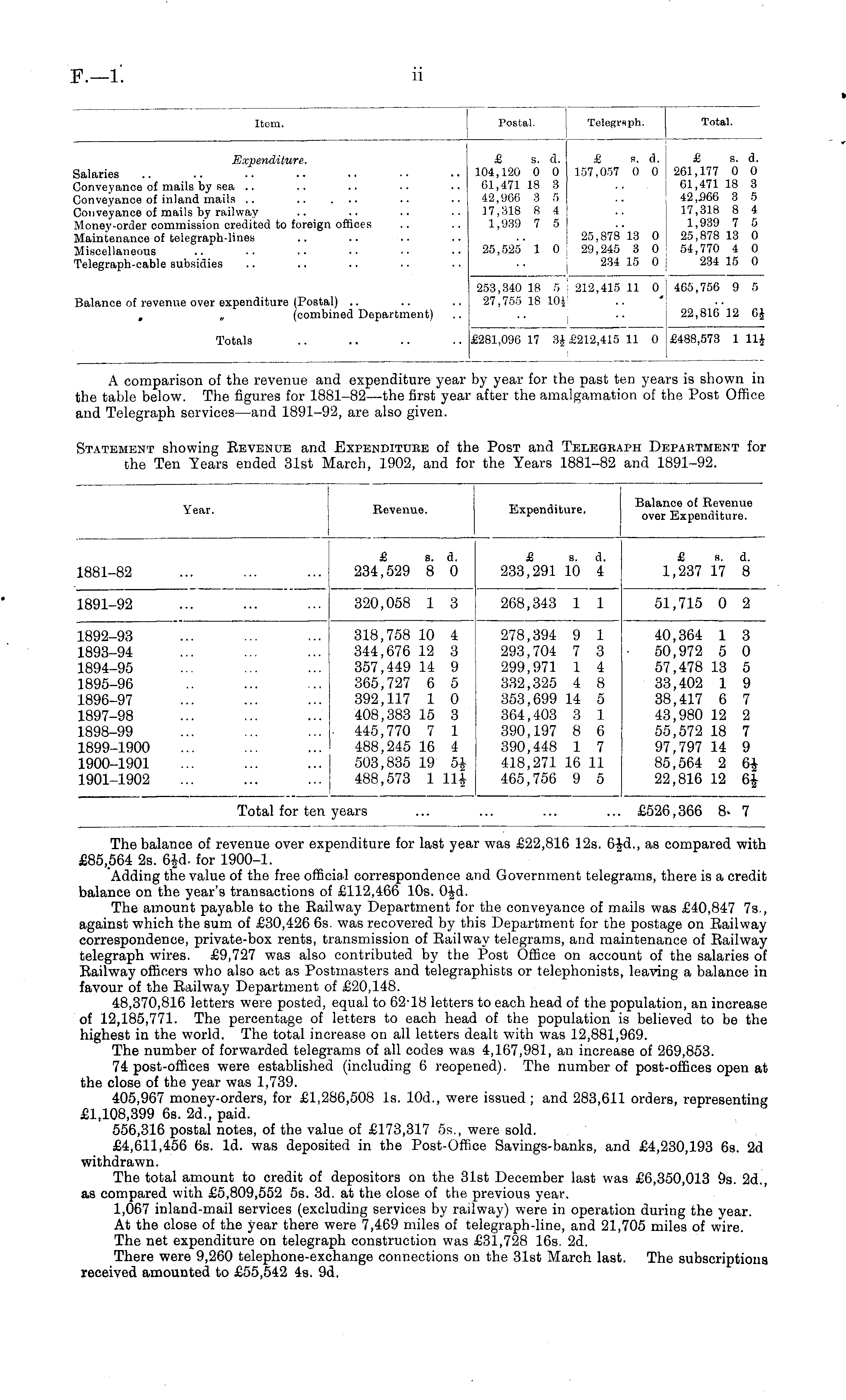 A comparison of the revenue and expenditure year by year for the past ten years is shown in the table below. The figures for 1881-82 —the first year after the amalgamation of the Post Office and Telegraph services—and 1891-92, are also given.