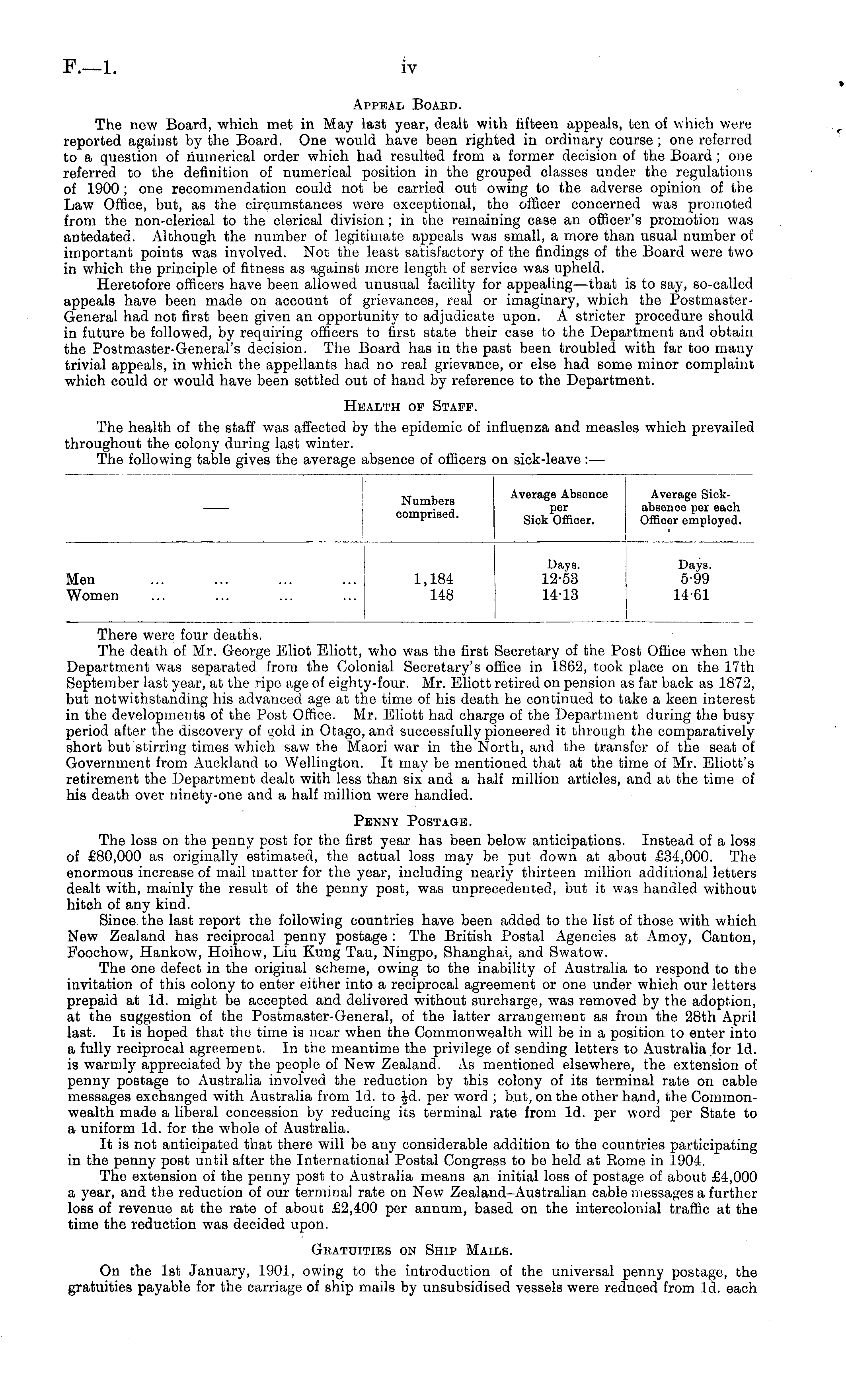 There were four deaths. The death of Mr. George Eliot Bliott, who was the first Secretary of the Post Office when the Department was separated from the Colonial Secretary's office in 1862, took place on the 17th September last year, at the ripe age of eighty-four. Mr. Bliott retired on pension as far back as 18712, but notwithstanding his advanced age at the time of his death he continued to take a keen interest in the developments of the Post Office. Mr. Bliott had charge of the Department during the busy period after the discovery of <jold in Otago, and successfully pioneered it through the comparatively short but stirring times which saw the Maori war in the North, and the transfer of the seat of Government from Auckland to Wellington. It may be mentioned that at the time of Mr. Eliott's retirement the Department dealt with less than six and a half million articles, and at the time of his death over ninety-one and a half million were handled. Penny Postage. The loss on the penny post for the first year has been below anticipations. Instead of a loss of £80,000 as originally estimated, the actual loss may be put down at about £34,000. The enormous increase of mail matter for the year, including nearly thirteen million additional letters dealt with, mainly the result of the penny post, was unprecedented, but it was handled without hitch of any kind. Since the last report the following countries have been added to the list of those with which New Zealand has reciprocal penny postage : The British Postal Agencies at Amoy, Canton, Foochow, Hankow, Hoihow, Liv Rung Tau, Ningpo, Shanghai, and Swatow. The one defect in the original scheme, owing to the inability of Australia to respond to the invitation of this colony to enter either into a reciprocal agreement or one under which our letters prepaid at Id. might be accepted and delivered without surcharge, was removed by the adoption, at the suggestion of the Postmaster-General, of the latter arrangement as from the 28th April last. It is hoped that the time is near when the Commonwealth will be in a position to enter into a fully reciprocal agreement. In the meantime the privilege of sending letters to Australia for Id. is warmly appreciated by the people of New Zealand. As mentioned elsewhere, the extension of penny postage to Australia involved the reduction by this colony of its terminal rate on cable messages exchanged with Australia from Id. to Jd. per word ; but, on the other hand, the Commonwealth made a liberal concession by reducing its terminal rate from Id. per word per State to a uniform Id. for the whole of Australia. It is not anticipated that there will be any considerable addition to the countries participating in the penny post until after the International Postal Congress to be held at Eome in 1904. The extension of the penny post to Australia means an initial loss of postage of about £4,000 a year, and the reduction of our terminal rate on New Zealand-Australian cable messages a further loss of revenue at the rate of about £2,400 per annum, based on the intercolonial traffic at the time the reduction was decided upon. GUATUITIES ON SHIP MAILS. On the Ist January, 1901, owing to the introduction of the universal penny postage, the gratuities payable for the carriage of ship mails by unsubsidised vessels were reduced from Id. each