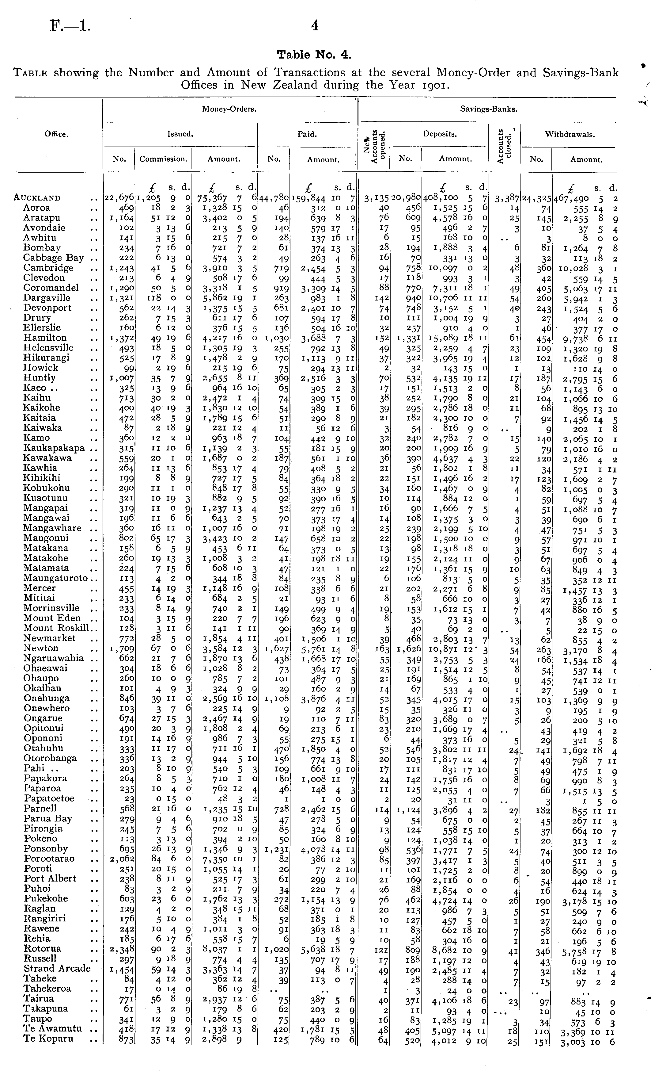 Table No. 4. Table showing the Number and Amount of Transactions at the several Money-Order and Savings-Bank Offices in New Zealand during the Year 1901.