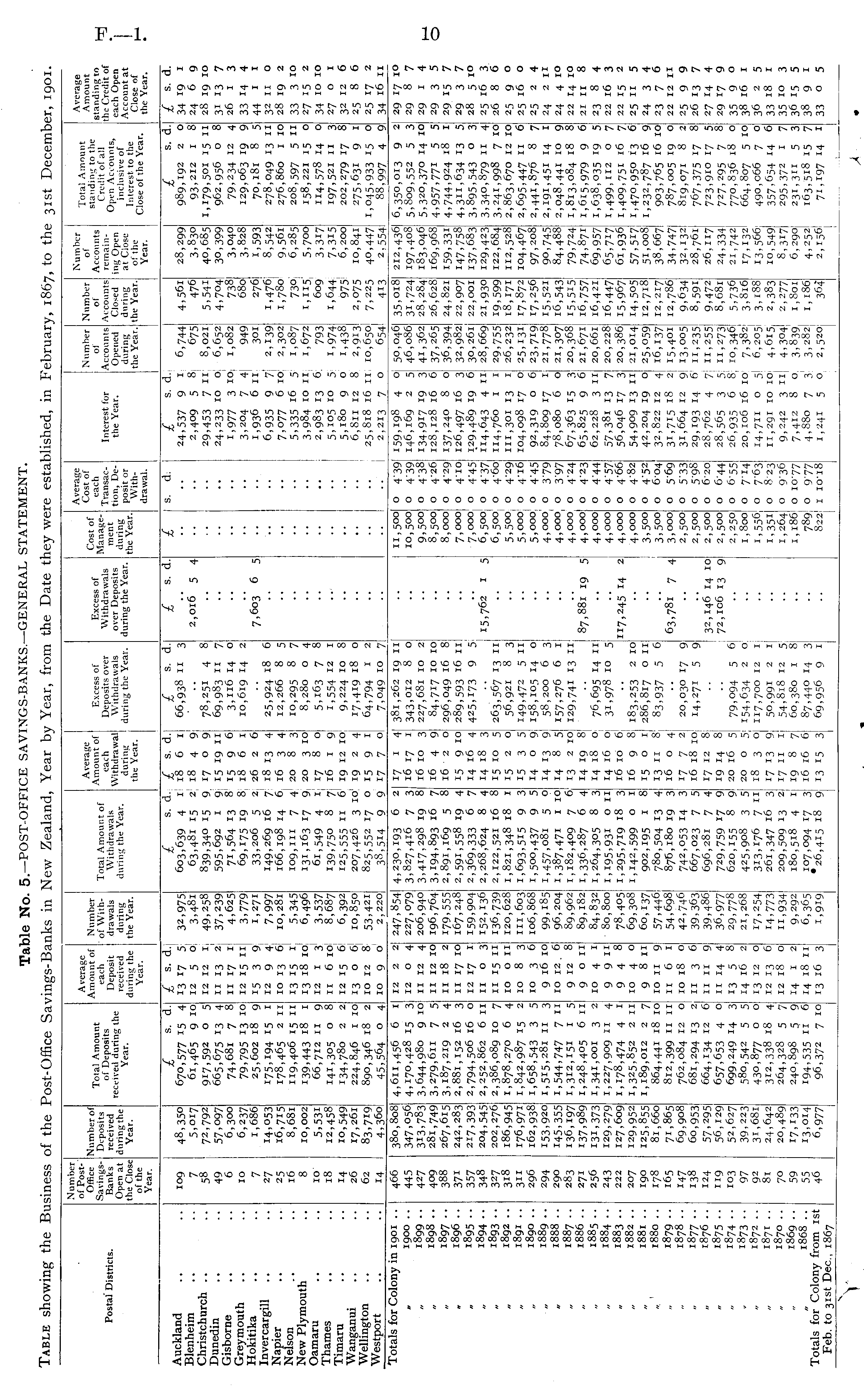 Postal Districts. Number of PostOffice SavingsBanks Open at the Close of the Year. Number of Deposits received during tile Year. Total Amount of Deposits received during the Year. Average Amount of each Deposit received during the Year. Number of Withdrawals during the Year. Total Amount of Withdrawals during the Year. Average Amount of each Withdrawal during the Year. I Excess of Deposits over Withdrawals during the Year. Excess of Withdrawals over Deposits during the Year. Cost of Management during the Year. Average Cost of each Transaction, Deposit or Withdrawal. Interest for the Year. Number of Accounts Opened during the Year. Number of Accounts Closed during the Year. Number of Accounts remaining Open at Close of the Year. Total Amount standing to the Credit of all Open Accounts, inclusive of Interest to the Close of the Year. Average Amount standing to the Credit of each Open Account at Close of the Year. Auckland Blenheim Christchurch .. Dunedin Gisborne Greymouth Hokitika Invercargill Napier Nelson New Plymouth Oamaru Thames Timaru Wanganui Wellington Westport 109 7 58 49 6 10 7 27 25 16 8 48,35O 5,OI7 72,792 57,O97 6,300 6,237 1,686 !4,O53 16,715 8,681 10,002 5,53i 12,458 10,549 17,261 83,719 4,36o| £ s. d. 670,577 15 4 61,465 9 10 917,592 o 5 665,675 13 4 74,681 7 8 79,795 13 10 25,602 18 9 175,194 15 1 178,465 2 11 119,406 15 11 139,443 18 1 66,712 11 9 141,305 o 8 134,780 2 2 224,846 1 10 890,346 18 2 45,564 o 4 £ s. d.| 13 17 5 12 5 o 12 12 1 11 13 2 11 17 1 12 15 11 15 3 9 12 9 4 10 13 6 13 15 1 13 18 10 12 1 3 11 6 10 12 15 6 13 o 6 10 12 8 32,975 3,48i 49,258 37,239 4,625 3,779 1,271 7,997 10,281 5,345 6,496 3,537 8,687 6,392 10,850 53,421 2,220 £ s. d. £ s. d. 603,639 4 1 18 6 1 63,481 15 2 18 4 9 839,34 O 15 9 i? ° 9 595,692 1 9 15 19 11 71,564 13 8 15 9 6 69,175 19 8 18 6 1 33,206 5 2 26 2 6 149,269 16 7 18 13 4 166,198 14 6 16 3 4 109,111 7 4 20 8 3' 131,163 17 9 20 3 10 61,549 4 1 17 8 o I39,75O 8 7 16 1 9 I2 5,555 n 6 19 12 10 207,426 3 10 19 2 4 825,552 17 o 15 9 1 38,514 9 9 J 7 7 °l £ s. d. 66,938 11 3 78,251 4 8 69,983 11 7 3,116 14 o 10,619 14 2 25,924 18 6 12,266 8 5 10,295 8 7 8,280 o 4 5,163 7 8 1,554 12 1 9,224 10 8 17,419 18 o 64,794 1 2 7,049 10 7 £ s. d. 2,016 5 4 .. 7,603 6 5 I s. d. 24,537 9 1 6,744 2,409 5 8 675 29,453 7 " 8,021 24,233 10 o: 6,652 1,977 3 1,082 3,204 7 4 949 1,936 6 11 301 6,935 9 7 2,139 7,077 6 10 2,302 5,335 16 5 1,087 3,984 10 11 1,672 2,983 13 6 793 5,105 10 5 1,974 5,180 9 o 1,438 6,811 12 8 2,913 25,818 16 11 10,650' 2,213 7 o 654! 4,561 476 5.54 1 4,7O4 738 680 2 7 6 1,476 1,780 73O 1,115 609 1,644 975 2,075 7,225 413 28,299 3,830 40,685 3O,399 3,040 3,828 1,593 8,542 9,561 6,285 5,700 3,317 7,315 6,200 10,841 40,447 2,554 £ s. d. 989,192 2 o 93,212 1 8 1,179,501 15 11 962, 956 o 8 79,234 12 4 129,063 19 9 70,181 8 5 278,049 13 11 276,860 1 10 208,597 5 lr 158,221 15 o 114,578 14 o 197,521 11 3 202,279 17 8 275,631 9 1 i,O45,933 15 o 88,997 4 9 £ s. d. 34 19 1 24 6 9 28 19 10 31 13 7 26 1 3 33 14 4 44 1 ! 32 11 o 28 19 2 33 3 10 27 15 2 34 10 10 27 o 1 32 12 6 25 8 6 25 17 2 34 16 11 10 18 14 26 62 10 9 o .. Totals for Colony in 1901 .. „ 1900 .. 1899 .. 1898 .. 1897.. 1896.. 1895 .. 1894 .. 1893.. 1892 .. 1891 .. 1890 .. 1889 .. 1888 .. 1887 .. 1886 .. 1885 .. 1884 .. 1883 .. 1882 .. 1881 .. 1880 .. 1879 .. 1878 .. 1877 .. 1876 .. 1875 .. 1874 .. 1873 .. 1872 .. 1871 .. 1870 .. 1869 .. 1868 .. Totals for Colony from 1st Feb. to 31st Dec, 1867 466 445 427 409 388 371 357 348 327 3i8 3" 296 294 290 283 271 256 243 222 207 190 178 165 147 138 124 119 103 97 92 81 380,808 347,056 313,783 281,749 267,615 242,283 217,393 204,545 202,276 186,945 176,971 162,938 153,920 145,355 136,197 137,989 I3i,373 129,279 127,609 129,952 I2 5,855 81,660 71,865 69,908 6o,953 57,295 56,129 52,627 39,223 31,681 24,642 20,489 !7,i33 13,014 6,977 4,611,456 6 1 4,170,428 15 3 3,644,980 9 10 3,279,611 7 5 3,187,219 2 4 2,881,152 16 3 2,794,5°6 16 o 2,252,862 6 11 2,386,089 10 7 1,878,270 6 4 1,842,987 15 2 1,658,543 3 5 1,515,281 11 3 1,544,747 7 " 1,312,151 1 5 1,248,405 6 11 1,341,001 3 2 1,227,909 11 4 4 1 1,325,852 2 11 1,189,012 2 7 864,441 18 10 812,399 11 11 762,084 12 o 681,294 J 3 2 664,134 12 6 657,653 4 o 699,249 14 3 580,542 5 5 430,877 o o 312,338 18 4 264,328 5 7 240,898 5 9 194,535 11 6 96,372 7 10 12 2 2 I2O4 II 12 4 II 12 10 II 18 2 11 17 IO 12 17 I 11 o 3 11 15 11 10 o 11 10 8 3 10 3 6 9 16 10 10 12 6 9 12 8 9 o 11 10 4 1 9 9 11 9 4 8 10 4 o 9 8 11 10 11 9 11 6 1 10 18 o 11 3 6 11 11 9 11 14 4 13 5 8 14 16 2 13 12 o 12 13 6 12 18 o 247,854 227,079 206, 940 196,764 179,555 167,248 159,904 152,136 136,739 120,628 111,603 106,868 99,i85 96,204 89,962 89,182 84,832 80,800 78,405 69,308 60,137 57,446 54,698 42,746 39,363 39,486 36,977 29,778 21,268 17,254 H,773 11,934 9,292 6,365 1,919 4,230,193 6 2 3,827,416 7 3 3,417,298 19 8 3,194,893 16 7 2,891,169 5 8 2,591,558 19 4 2,369,333 6 7 2,268,624 8 4 2,122,521 16 8 1,821,348 18 1 1,693,515 9 3 i,5OO,437 9 5 1,457,081 5 o t 1,387,471 1 10 1,182,409 7 6 1,336,287 6 4 1 ,264, 305 8 3 1,195,931 o 11 1,295,719 18 3 1,142, 599 o 1 902,195 1 8! 780,504 13 4 876,180 19 3 74 2 ,O53 X 4 3 667,023 7 5 696,281 7 4 729,759 17 9 620,155 8 9' 425,908 3 5; 313,176 7 11 261,347 16 3 209,509 13 2; 180,518 4 I 107,094 17 3 26,415 18 9 17 1 4 381,262 19 11 16 17 1 343,012 8 o 16 10 3 227,681 10 2 16 4 9 84,717 10 10 16 2 o 296,049 16 8 15 9 10 289,593 16 11 14 16 4 425,173 9 5 14 18 3 15 10 51 263,567 13 11 15 2 Oj 56,921 8 3 J 5 3 5 149,472 5 11 14 o 9i 158,105 14 o 14 13 9 58,200 6 3 14 8 5I 157,276 6 1 13 2 10] 129,741 13 11 14 19 8 14 18 o 76,695 14 11 14 16 O: 31,978 10 5 16 10 6 1 16 9 8| 183,253 2 10 15 o 1 286,817 o 11 13 11 8; 83,937 5 6 16 o 4 17 7 2 20,030 17 9 16 18 10 14,271 5 9 17 12 8 19 14 8[ 20 16 5] 79,094 5 6' 20 o 5 154,634 2 o 18 3 Oj 117,700 12 I J 7 13 9 1 50,991 2 I 17 11 i] 54,818 12 5 19 8 7J 60,380 1 8, 16 16 6\ 87,440 14 3 13 15 3! 69,956 9 1 •- .. 15,762 I 5 •• ■