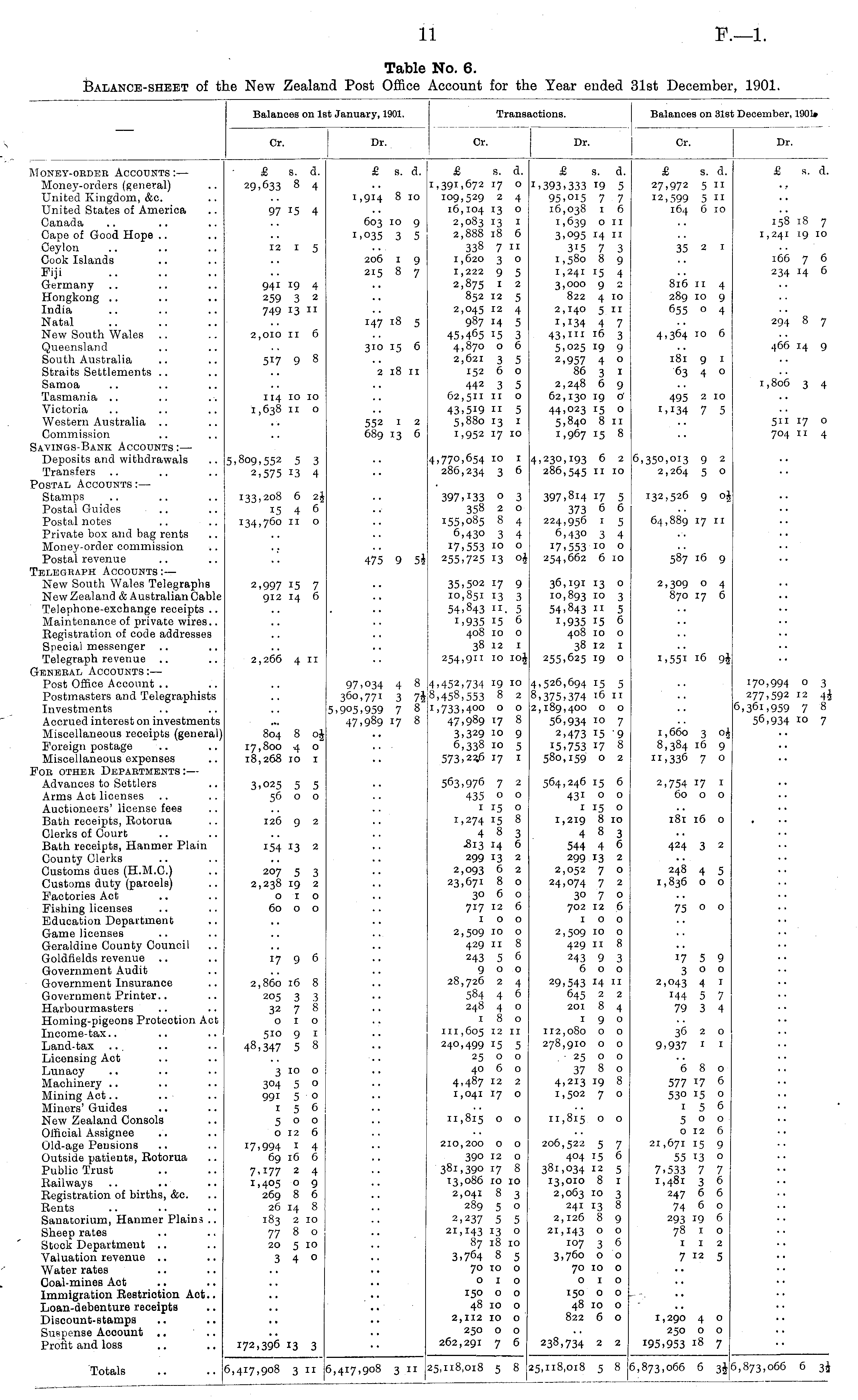 Table No. 6. Balance-sheet of the New Zealand Post Office Account for the Year ended 31st December, 1901.