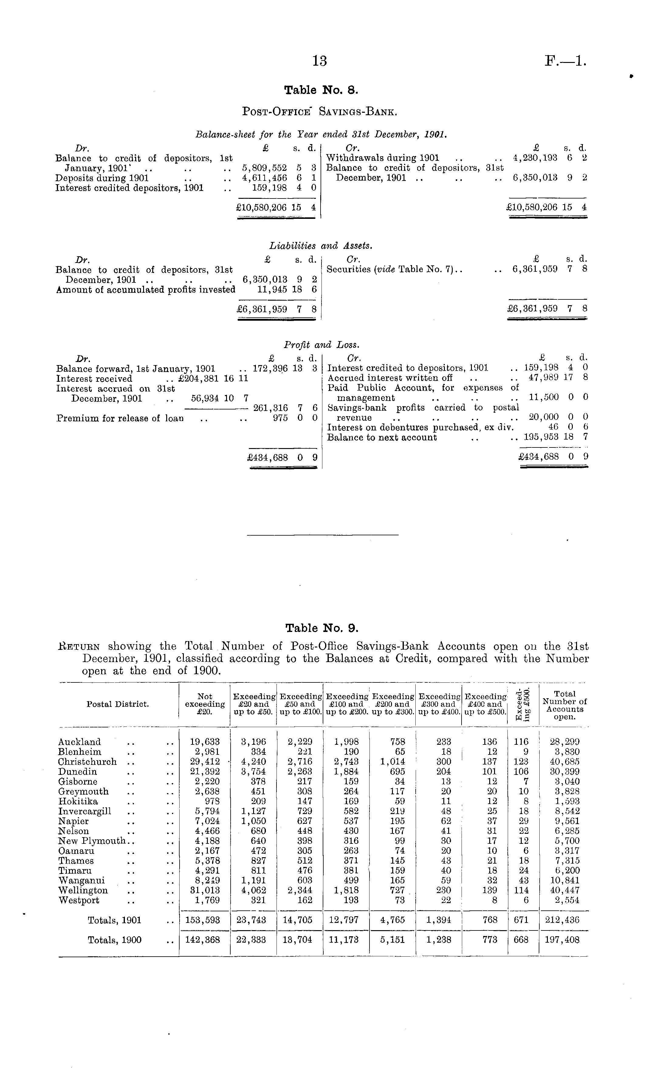 Exceeding Exceeding £300 and £400 and up to £400. up to £500. 03 ic H.S i Postal District. Not exceeding £20. Exceeding .620 and up to £50. Exceeding £50 and up to £100. Exceeding Exceeding £100 and £200 aud up to £200. up to £300. Total Number of Accounts open. Auckland Blenheim Christehurch .. Dunedin Gisborne Greymouth Hokitika Invercargill Napier Nelson New Plymouth.. Oamaru Thames Timaru Wanganui Wellington Westport 19,633 2,981 29,412 - 21,392 2,220 2,638 973 5,794 7,024 4,466 4,188 2,167 5,378 4,291 8,2i9 31,013 1,769 3,196 334 4,240 3,754 378 451 209 1,127 1,050 680 640 472 827 811 1,191 4,062 321 2,229 221 2,716 2,263 217 308 147 729 627 448 398 305 512 476 603 2,344 162 1,998 190 2,743 1,884 159 264 169 582 537 430 316 263 371 381 499 1,818 193 758 65 1,014 695 34 117 59 219 195 167 99 74 145 159 165 727 73 233 136 18 , 12 300 137 204 101 18 12 20 20 11 12 48 25 62 37 41 . 31 30 17 20 10 43 21 40 ; 18 59 i 32 230 I 139 22 8 116 9 123 106 7 W s 18 29 22 12 6 18 24 43 114 6 28,299 3,830 40,685 30,399 3,040 3,828 1,593 8,542 9,561 6,285 5,700 3,317 7,315 6,200 10,841 40,447 2,554 Totals, 1901 153,593 142,368 23,743 14,705 12,797 4,765 1,394 : 768 671 212,436 Totals, 1900 22,333 18 704 11,173 5,151 238 773 668 197,408