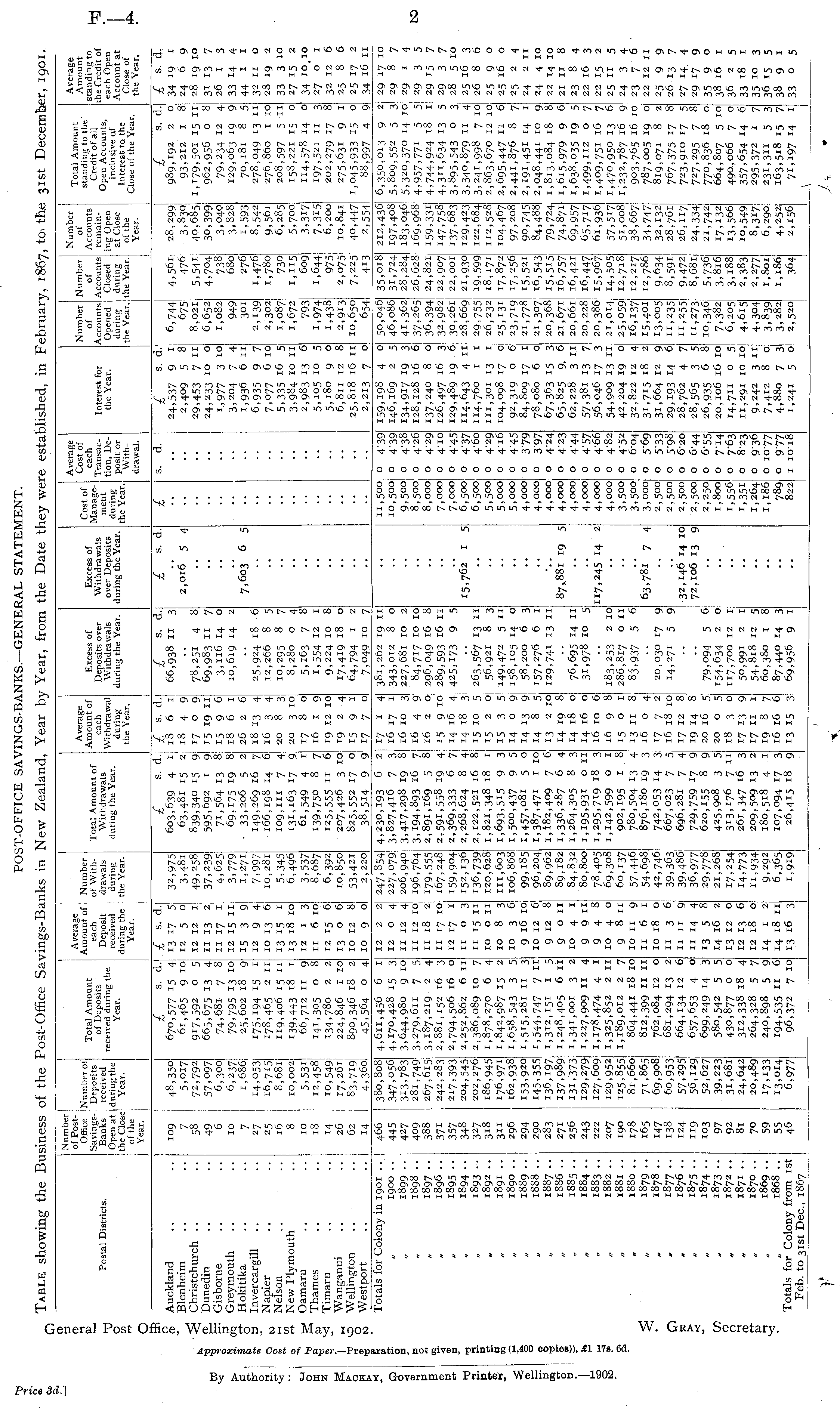 Postal Districts. Number of PostOffice SavingsBanks Open at the Close of the Year. Number of Deposits received during the Year. Total Amount of Deposits received during the Year. I Average Amount of Number each ofWithDeposit drawals received during during the the Year. Year. Total Amount of Withdrawals during the Year. Average Amount of each Withdrawal during the Year. Excess of Deposits over Withdrawals during the Year. Excess of Withdrawals over Deposits during the Year. Cost of Management during the Year. Average Cost of each Transaction, Deposit or Withdrawal. Interest for the Year. Number of Accounts Opened during the Year. Number of Accounts Closed during the Year. Number of Accounts remaining Open at Close of the Year. Total Amount standing to the Credit'ofall Open Accounts, inclusive of Interest to the Close of the Year. Average Amount Standing to the Credit of each Open Account at Close of the Year, i Auckland Blenheim Christchurch .. Dunedin Gisborne Greymouth Hokitika Invercargill Napier Nelson New Plymouth Oamaru Thames Timaru Wanganui Wellington Westport 109 7 58 49 6 10 7 27 25 16 8 48,350 5,oi7 72,792 57,097 6,300 6,237 1,686 14,053 16,715 8,681 10,002 670,577 IS 4 61,465 9 10 917,592 o 5 665,675 13 4 74,681 7 8 79,795 13 10 25,602 18 9 175,194 15 1 178,465 2 11 119,406 15 11 139,443 18 1 66,712 11 9 141,305 o S 134,780 2 2 224,846 1 10 8go,346 18 2 45,564 o 4 13 17 5! 12 5 o: 12 12 1 11 13 2 11 17 1 12 15 11 15 3 9 12 9 4 10 13 6 13 15 1 13 18 10 12 1 3 11 6 10 12 15 6 13 o 6 10 12 8 10 9 o 32,975 3,48i 49,258 37,239 4,625 3,779 1,271 7,997 10,281 5,345 6,496 3,537 8,687 6,392 10,850 53,421 2,220 603,639 4 1 63,481 15 2 839,340 15 91 595,692 1 gi 71,564 13 8 6g,i75 ig 8 33,206 5 2 149,269 16 7 166,198 14 6 log, in 7 4 131,163 17 9 6i,549 4 1 139,750 8 7 125,555 11 6 207,426 3 10 825,552 17 0! 38,514 9 9 1 £ s. d 18 6 I 18 4 9 17 o 9 15 19 11 15 9 6 18 6 1 26 2 6 18 13 4 16 3 4 20 8 3 20 3 10 17 8 o 16 1 9 19 12 10 19 2 4 15 9 1 17 7 o £ s - d - 66,g38 11 3 . " 78,251 4 8 69,983 11 7 3,116 14 o 10,619 14 2 25,924 18 6 12,266 8 5 10,295 8 7 8,280 o 4 5,163 7 8 1,554 12 1 9,224 10 8 17,419 18 o 64,794 1 2 7,Q4g 10 7 £ 8. d.j 2,016 5 4 7,603 6 5 £ S. d. £ »■ d. 24,537 9 1 2,409 5 8 29,453 7 11 24,233 10 o i,977 3 10 3,204 7 4 i,g36 6 11 6,935 9 7 7,077 6 10 5,335 16 5 3,984 10 11 2,983 13 6 5,105 10 5 5,180 9 o 6,811 12 8 25,818 16 11 2,213 7 o 6,744 675 8,021 6,652 1,082 949 301 2,139 2,302 1,087 1,672 793 i,974 i,438 2,913 10,650 654 4,56l 476 5,541 4,704 738 680 276 1,476 1,780 730 I.II5 609 1,644 975 2,075 7,225 413 28, 2gg 3,830 40,685 30,399 3,040 3,828, i,593 8,542 9,56i 6,285 5,700 3,317 7,315 6,200 10,841 40,447 2,554 £ s. d. g8g,ig2 2 o 93,212 1 8 1,179,501 15 11 962,956 o 8 79,234 12 4 129,063 19 9 70,181 8 5 278,049 13 11 276,860 1 10 208,597 5 11 158,221 15 o 114,578 14 o 197,521 11 3 202, 27g 17 8 275,631 g 1 i,o45,933 15 o 88,9974 9 £ ». d. 34 19 1 24 6 9 28 19 10 31 13 7 26 1 3 33 14 4 44 1 1 32 11 o 28 19 2 33 3 10 27 15 2 34 10 10 27 o 1 32 12 6 25 8 6 25 17 2 34 16 11 10 18 5,53i 12,458 io,549| 17,261 83,7I9J 4,3601 14 26 62 14 Totals for Colony in 1901 .. „ igoo .. i8gg .. 1898 .. 1897 • • 1896 .. 1895 •• 1894 - • i8g 3 • • 1892 .. 1891 .. „ i8go .. 1889 .. 1888 .. 1887 .. 1886 .. 1885 .. 1884 .. 1883 .. 1882 .. 1881 .. 1880 .. 1879 .. 1878.. 1877 .. 1876 .. 1875 .. 1874 • • 1873 ■ • 1872 .. 1871 .. 1870 .. 1869 .. 1868 .. Totals for Colony from 1st Feb. to 31st Dec, 1867 466 445 427 409 388 37i 357 348 327 3i8 311 296 294 2go 283 271 256 243 222 207 190 178 165 147 138 124 119 103 97 92 81 70 59 55 46 380,808 347,056 313,783 281,749 267,615 242,283 217,393 204,545 202, 276 186,945 176,971 162,938 153,920 145,355 136,197 137,989 131,373 129,279 127,609 129, g52 125,855 81,660 71,865 6g,go8 6o,g53 57,295 56,129 52,627 39,223 31,681 24,642 20,489 i7,!33 13,014 6,977 4,611,456 6 1 4,170,428 15 3 3,644,980 9 10 3,279,6n 7 5 3,187,219 2 4 2,881,152 16 3 2,794,506 16 o 2,252,862 6 11 2,386,o8g 10 7 1,878,270 6 4 J , 8 42,987 15 2 1,658,543 3 5 1,515,281 11 3 1,544,747 7 " 1,312,151 1 5 1,248,405 6 11 1,341,001 3 2 i,227,gog 11 4 1,178,474 4 1 1,325,852 2 11 i,i8g,oi2 2 7 864,441 18 10 812,399 11 11 762,084 12 o 681,294 x 3 2 664,134 12 6 657,653 4 o 699,249 14 3 580,542 5 5 430,877 o o 312,338 18 4 264,328 5 7 240,898 5 9 194,535 11 6 96,372 7 10 12 2 2 12 o 4 11 12 4 11 12 10 11 18 2 11 17 10 12 17 1 11 o 3 11 15 11 10 o 11 10 8 3 10 3 6 9 16 10 10 12 6 9 12 8 9 o 11 10 4 1 9 9 11 9 4 8 10 4 o 9 8 11 10 11 9 11 6 1 10 18 o 11 3 6 11 11 9 11 14 4 13 5 8 14 16 2 13 12 o 12 13 6 12 18 o 14 1 2 14 18 11 13 16 3 247,854 227,079 206, 940 196,764 179,555 167,248 159,904 152,136 136,739 120,628 111,603 106,868 99,i85 96,204 8g,962 8g,i82 84,832 80,800 78,405 6g,3o8 60,137 57,446 54,6g8 42,746 39,363 39,486 36,977 29,778 21,268 17,254 14,773 11,934 9,292 6,365 1,919 4,230,ig3 6 2 3,827,416 7 3 3,417,298 19 8 3,194,893 16 7 2,8gi,i6g 5 8 2,591,558 19 4 2,369,333 6 7 2,268,624 8 4 2,122,521 16 8 1,821,348 18 1 1,693,515 9 3 i,50o,437 9 5 1,457,081 5 o i,387,47i 1 10 1,182,409 7 6 1,336,287 6 4 1,264,305 8 3 1,195,931 o II 1,295,719 18 3 1,142,599 o 1 902, 195 1 8 780,504 13 4 876,180 ig 3 742,053 14 3 667,023 7 5 6g6,28i 7 4 729,759 17 9 620,155 8 9 425,908 3 5 313,176 7 11 261,347 16 3 209,509 13 2 180,518 4 1 107,094 17 3 26,415 18 9 17 1 4 16 17 1 16 10 3 16 4 9 16 2 o 15 9 10 14 16 4 14 18 3 15 10 5 15 2 o 15 3 5 14 o 9 14 13 9 14 8 5 13 2 10 14 19 8 14 18 o 14 16 o 16 10 6 16 9 8 15 o 1 13 11 8 16 o 4 17 7 2 16 18 10 17 12 8 19 14 8 20 16 5 20 o 5 18 3 o 17 13 9 17 11 1 19 8 7 16 16 6 13 15 3 381,262 19 II 343,012 8 o 227,681 10 2 84,717 10 10 296, o4g 16 8 289,593 16 11 425,173 9 5 263,567 13 n 56,921 8 3 149,472 5 11 158,105 14 o 58,200 6 3 157,276 6 1 129,741 13 11 76,695 14 11 31,978 10 5 •• .. 15,762 1 5 •• 87,881 19 5 .. 117,245 14 2 11,500, 10,500 9,50o 8,500 8,000 7,000 7,000 6,500 6,500 5,500 5,000 5,000 4,000 4,0