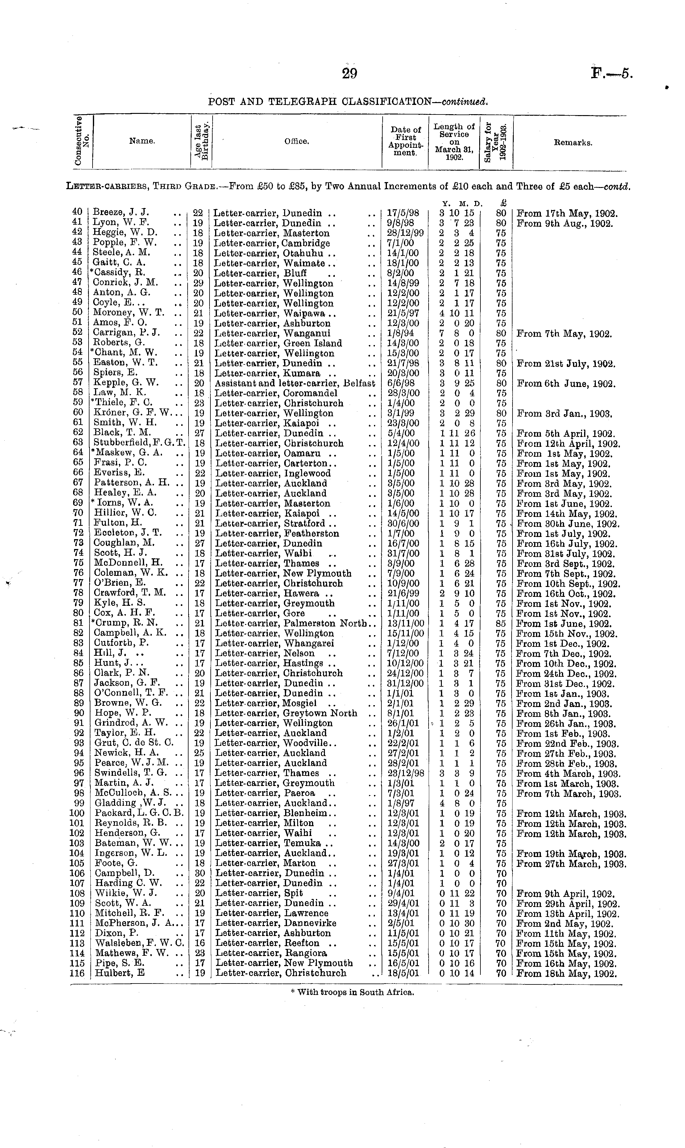 10 43 Zg fl O O Name. Ul ( so? Office. Date of Length of g g First Servloe "gS *£»$* March 31, j|S4 meut - 1902. « 3 Remarks. IEB-OABEIEBS, THIBD I rEA ie.—From £50 to £85, by Two Annual Incremer its of £10 ea tch am Three of £5 each— contd. 40 41 42 43 44 45 46 47 48 49 50 51 52 53 54 55 56 57 58 59 60 61 62 63 64 65 66 67 68 69 70 71 72 73 74 75 76 77 78 79 80 81 82 83 84 85 86 87 88 89 90 91 92 93 94 95 96 97 98 99 100 101 102 103 104 105 106 107 108 109 110 111 112 113 114 115 116 Breeze, J. J. Lyon, W. F. Heggie, W. D. Popple, F. W. Steele, A.M. Gaitt, C. A. *Cassidy, R. Conrick, J. M. Anton, A. G. Goyle, E. .. Moroney, W. T. Amos, F. 0. Oarrigan, P. J. Roberts, G. "Chant, M. W. Easton, W. T. Spiers, E. Kepple, G. W. Law, M. K. "Thiele, F. 0. Kroner, G. F. W. .. Smith, W. H. Black, T. M. Stubberfield.F.G.T. *Maskew, G. A. Frasi, P. 0. Everiss, E. Patterson, A. H. Healey, E. A. * Iorns, W. A. Hillier, W. 0. Fulton, H. Eooleton, J. T. .. Coughlan, M. Scott, H.J. McDonnell, H. .. Coleman, W. K. .. O'Brien, E. Crawford, T. M. Kyle, H. S. Cox, A. H. F. *Crump, R. N. Campbell, A. K. Cutforth, P. Hill, J. .. Hunt, J. .. Clark, P. N. Jackson, G. F. O'Oonnell, T. F. .. Browne, W. G. Hope, W. P. Grindrod, A. W. Taylor, E. H. Grut, 0. de St. 0. Newick, H. A. Pearce, W.J.M. .. Swindells, T. G. Martin, A. J. McCullocb, A. S. .. Gladding ,W. J. .. Packard, L. G. C.B. Reynolds, R. B. Henderson, G. Bateman, W. W. .. Ingerson, W. L. Foote, G. Campbell, D. Harding 0. W. Wilkie, W. J. Scott, W. A. Mitchell, R. F. McPherson, J. A... Dixon, P. Walsleben, F. W. 0. Mathews, F. W. Pipe, S.E. Hulbert, E 22 19 18 19 18 1.8 20 29 20 20 21 19 22 18 19 21 18 20 18 23 19 19 27 18 19 19 22 19 20 19 21 21 19 27 18 17 18 22 17 18 17 21 18 17 17 17 20 19 21 22 18 19 22 19 25 19 17 17 19 18 19 19 17 19 19 18 30 22 20 21 19 17 17 16 23 17 19 Letter-oarrier, Dunedin .. Letter-carrier, Dunedin Letter-carrier, Masterton Letter-oarrier, Cambridge Letter-carrier, Otahuhu Letter-carrier, Waimate Letter-carrier, Bluff Letter-carrier, Wellington Letter-oarrier, Wellington Letter-oarrier, Wellington Letter-oarrier, Waipawa Letter-carrier, Ashburton Letter-carrier, Wanganui Letter-carrier, Green Island Letter-carrier, Wellington Letter-carrier, Dunedin Letter-carrier, Kumara Assistant and letter-oarrier, Belfast Letter-oarrier, Goromandel Letter-carrier, Christchuroh Letter-carrier, Wellington Letter-carrier, Kaiapoi Letter-carrier, Dunedin Letter-carrier, Christchuroh Letter-carrier, Oamaru Letter-carrier, Carterton.. Letter-oarrier, Inglewood Letter-carrier, Auokland Letter-carrier, Auokland Letter-carrier, Masterton Letter-carrier, Kaiapoi Letter-carrier, Stratford Letter-carrier, Featherston Letter-carrier, Dunedin Letter-carrier, Waihi Letter-oarrier, Thames Letter-oarrier, New Plymouth Letter-oarrier, Christohurch Letter-carrier, Hawera Letter-oarrier, Greymouth Letter-carrier, Gore Letter-carrier, Palmerston North.. Letter-carrier, Wellington Letter-carrier, Whangarei Letter-carrier, Nelson Letter-carrier, Hastings Letter-carrier, Christchurch Letter-oarrier, Dunedin Letter-carrier, Dunedin Letter-carrier, Mosgiel Letter-oarrier, Greytown North .. Letter-carrier, Wellington Letter-oarrier, Auckland Letter-carrier, Woodville.. Letter-carrier, Auckland Letter-carrier, Auckland Letter-carrier, Thames Letter-carrier, Greymouth Letter-carrier, Paeroa Letter-carrier, Auckland.. Letter-carrier, Blenheim.. Letter-carrier, Milton Letter-carrier, Waihi Letter-carrier, Temuka Letter-carrier, Auckland.. Letter-carrier, Marton Letter-carrier, Dunedin Letter-carrier, Dunedin Letter-oarrier, Spit Letter-carrier, Dunedin Letter-carrier, Lawrence Letter-carrier, Dannevirke Letter-carrier, Ashburton Letter-carrier, Reefton Letter-carrier, Rangiora Letter-oarrier, New Plymouth Letter-carrier, Christohurch 17/5/98 9/8/98 28/12/99 7/1/00 14/1/00 18/1/00 8/2/00 14/8/99 12/2/00 12/2/00 21/5/97 12/3/00 1/8/94 14/3/00 15/3/00 21/7/98 20/3/00 6/6/98 28/3/00 1/4/00 3/1/99 23/3/00 5/4/00 12/4/00 1/5/00 1/5/00 1/5/00 3/5/00 3/5/00 1/6/00 14/5/00 30/6/00 1/7/00 16/7/00 31/7/00 3/9/00 7/9/00 10/9/00 21/6/99 1/11/00 1/11/00 13/11/00 15/11/00 1/12/00 7/12/00 10/12/00 24/12/00 31/12/00 1/1/01 2/1/01 8/1/01 26/1/01 1/2/01 22/2/01 27/2/01 28/2/01 23/12/98 1/3/01 7/3/01 1/8/97 12/3/01 12/3/01 12/3/01 14/3/00 19/3/01 27/3/01 1/4/01 1/4/01 9/4/01 29/4/01 13/4/01 2/5/01 11/5/01 15/5/01 15/5/01 16/5/01 18/5/01 Y. M. D, 3 10 15 3 7 23 2 3 4 2 2 25 2 2 18 2 2 13 2 1 21 2 7 18 2 1 17 2 1 17 4 10 11 2 0 20 7 8 0 2 0 18 2 0 17 3 8 11 3 0 11 3 9 25 2 0 4 2 0 0 3 2 29 2 0 8 1 11 26 1 11 12 1 11 0 1 11 0 1 11 0 1 10 28 1 10 28 1 10 0 1 10 17 19 1 19 0 1 8 15 18 1 1 6 28 1 6 24 1 6 21 2 9 10 15 0 15 0 1 4 17 1 4 15 14 0 1 3 24 1 3 21 13 7 13 1 13 0 1 2 29 1 2 23 12 5 12 0 116 112 111 3 3 9 110 1 0 24 4 8 0 1 0 19 1 0 19 1 0 20 2 0 17 1 0 12 10 4 10 0 10 0 0 11 22 0 11 3 0 11 19 0 10 30 0 10 21 0 10 17 0 10 17 0 10 16 0 10 14 |. £ 80 80 75 75 75 75 75 75 75 75 75 75 80 75 75 80 75 80 75 75 80 75 75 75 75 75 75 75 75 75 75 75 75 75 75 75 75 75 75 75 75 85 75 75 75 75 75 75 75 75 75 75 75 75 75 75 75 75 75 75 75 75 75 75 75 75 70 70 70 70 70 70 70 70 70 70 70 From 17th May, 1902. From 9th Aug., 1902. From 7th May, 1902. From 21st July, 1902. From 6th June, 1902. From 3rd Jan., 1903, From 5th April, 1902. From 12th April, 1902. From 1st May, 1902. From 1st May, 1902. From 1st May, 1902. From 3rd May, 1902. From 3rd May, 1902. From 1st June, 1902. From 14th May, 1902. From 30th June, 1902. From 1st July, 1902. From 16th July, 1902. From 31st July, 1902. From 3rd Sept., 1902. From 7th Sept., 1902. From 10th Sept., 1902. From 16th Oct., 1902. From 1st Nov., 1902. From 1st Nov., 1902. From 1st June, 1902. From 15th Nov., 1902. From 1st Dec, 1902. From 7th Dec, 1902. From 10th Dec, 1902. From 24th Dec, 1902. From 31st Dec, 1902. From 1st Jan., 1903. From 2nd Jan., 1903. From 8th Jan., 1903. From 26th Jan., 1903. From 1st Feb., 1903. From 22nd Feb., 1903. From 27th Fe