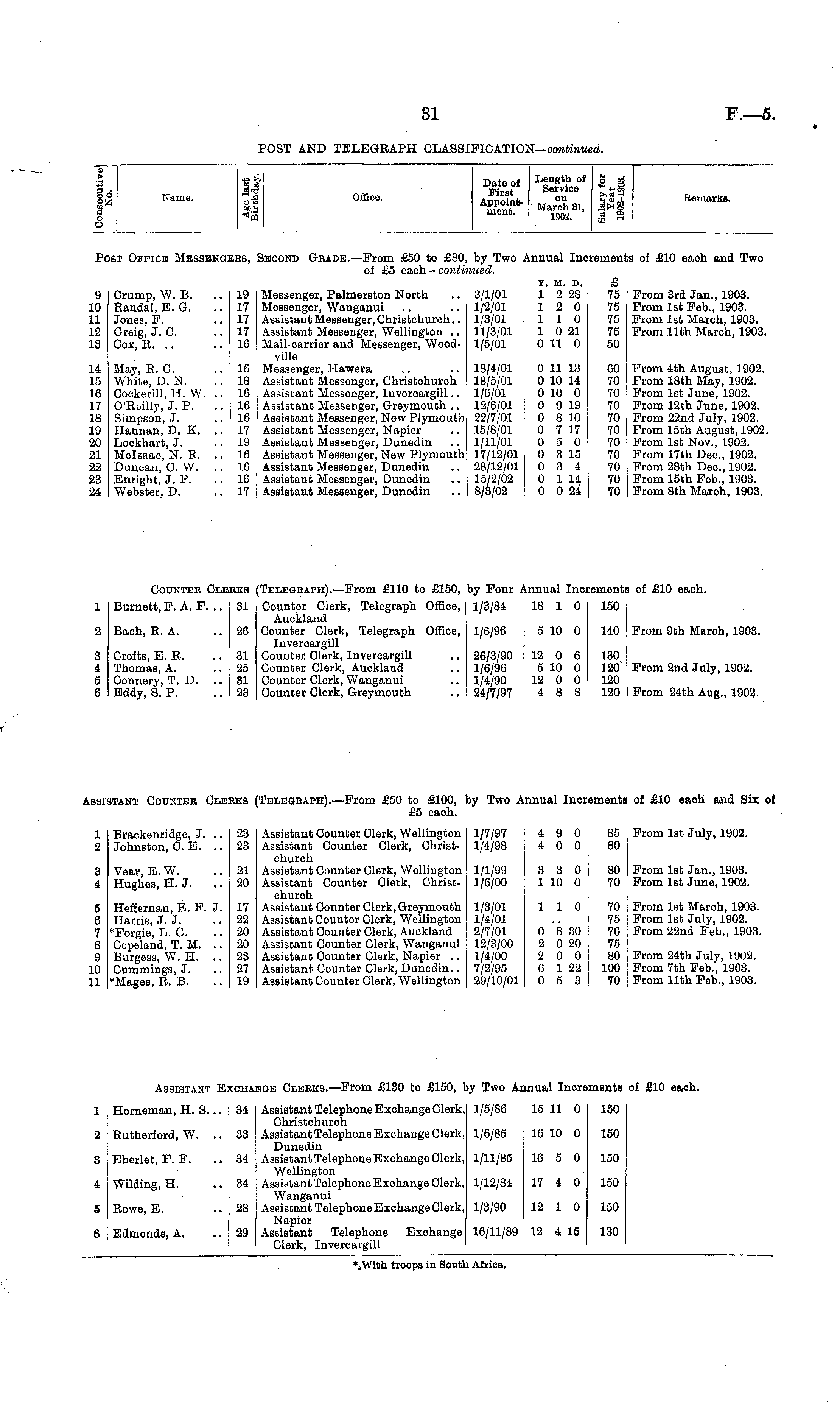 aiz Cfirt fl Q o Name. 4=£ CO tf 3i3 Office. Date of Length of g d First Se " lce ~g§ Mar°ch81, £|Sg meni - 1902. « 3 Remarks. Post Office Messengers, Second Grade. —From £50 to £80, by Two Annual Increments of £10 eaoh and Two of £5 each— continued. Y. M. D. £ 9 Crump, W. B. .. 19 Messenger, Palmerston North .. 3/1/01 1 2 28 75 From 3rd Jan., 1903. 10 Randal, E. G. .. 17 Messenger, Wanganui .. .. 1/2/01 12 0 75 From 1st Feb., 1903. 11 Jones, F. .. 17 Assistant Messenger, Christchuroh.. 1/3/01 110 75 From 1st March, 1903. 12 Greig, J. 0. .. 17 Assistant Messenger, Wellington .. 11/3/01 1 0 21 75 From 11th March, 1903. 13 Oox, R. .. .. 16 Mail-carrier and Messenger, Wood- 1/5/01 0 11 0 50 ville 14 May, R. G. .. 16 Messenger, Hawera .. .. 18/4/01 0 11 13 60 From 4th August, 1902. 15 White, D. N. .. 18 Assistant Messenger, Christohurch 18/5/01 0 10 14 70 From 18th May, 1902. 16 Oockerill, H. W. .. 16 Assistant Messenger, Invercargill.. 1/6/01 0 10 0 70 From 1st June, 1902. 17 O'Reilly, J. P. .. 16 Assistant Messenger, Greymouth .. 12/6/01 0 9 19 70 From 12th June, 1902. 18 Simpson, J. .. 16 Assistant Messenger, New Plymouth 22/7/01 0 8 10 70 From 22nd July, 1902. 19 Hannan, D. K. .. 17 Assistant Messenger, Napier .. 15/8/01 0 7 17 70 From 15th August, 1902. 20 Lockhart, J. .. 19 Assistant Messenger, Dunedin .. 1/11/01 0 5 0 70 From 1st Nov., 1902. 21 Mclsaac, N. R. .. 16 Assistant Messenger, New Plymouth 17/12/01 0 3 15 70 From 17th Dec, 1902. 22 Duncan, O. W. .. 16 Assistant Messenger, Dunedin .. 28/12/01 0 3 4 70 From 28th Dec, 1902. 23 Enright, J. P. .. 16 Assistant Messenger, Dunedin .. 15/2/02 0 1 14 70 From 15th Feb., 1903. 24 Webster, D. .. 17 Assistant Messenger, Dunedin .. 8/3/02 0 0 24 70 From 8th March, 1903. Counter Clerks (Telegraph).—From £110 to £150, by Four Annual Increments of £10 eaoh. 1 Burnett, F. A. F. .. 31 Counter Clerk, Telegraph Office, 1/3/84 18 1 0 150 A n c* k I fiiTi (i 2 Bach, R. A. .. 26 Counter Clerk, Telegraph Office, 1/6/96 5 10 0 140 From 9th Maroh, 1903. Invercargill 3 Crofts, E. R. .. 31 Counter Clerk, Invercargill .. 26/3/90 12 0 6 130 4 Thomas, A. .. 25 Counter Clerk, Auokland .. 1/6/96 5 10 0 120' From 2nd July, 1902. 5 Oonnery, T. D. .. 31 Counter Clerk, Wanganui .. 1/4/90 12 0 0 120 6 Eddy, S. P. .. 23 Counter Clerk, Greymouth .. 24/7/97 4 8 8 120 From 24th Aug., 1902. lssistant Counter Clerks (Telegraph). —From £50 to £100, by Two Annual Inorements of £10 each and Six of £5 each. .SSII 1 2 3 4 5 6 7 8 9 10 11 1 Brackenridge, J. .. 23 Assistant Counter Clerk, Wellington 1/7/97 4 9 0 85 From 1st July, 1902. 2 Johnston, 0. E. .. 23 Assistant Counter Glerk, Christ- 1/4/98 4 0 0 80 church 3 Vear, E. W. .. 21 Assistant Counter Glerk, Wellington 1/1/99 3 3 0 80 From 1st Jan., 1903. 4 Hughes, H. J. .. 20 Assistant Counter Clerk, Christ- 1/6/00 1 10 0 70 From 1st June, 1902. church 5 Heffernan, E. F. J. 17 Assistant Counter Clerk, Greymouth 1/3/01 110 70 From 1st March, 1903. 6 Harris, J. J. .. 22 Assistant Counter Clerk, Wellington 1/4/01 .. 75 From 1st July, 1902. 7 *Forgie, L. C. .. 20 Assistant Counter Clerk, Auckland 2/7/01 0 8 30 70 From 22nd Feb., 1903. 8 Copeland, T. M. .. 20 Assistant Counter Clerk, Wanganui 12/3/00 2 0 20 75 9 Burgess, W. H. .. 23 Assistant Counter Clerk, Napier .. 1/4/00 2 0 0 80 From 24th July, 1902. 10 Gummings, J. .. 27 Assistant Counter Clerk, Dunedin.. 7/2/95 6 1 22 100 From 7th Feb., 1903. 11 *Magee, R. B. .. 19 Assistant Counter Glerk, Wellington 29/10/01 0 5 3 70 From 11th Feb., 1903. Assistant Exchange Glebes. —From £130 to £150, by Two Annual Increments of £10 eaoh. 1 Homeman, H. S... 34 Assistant Telephone Exchange Clerk, 1/5/86 15 11 0 150 Christchurch 2 Rutherford, W. .. 33 Assistant Telephone Exchange Clerk, 1/6/85 16 10 0 150 Dunedin 3 Eberlet, F. F. .. 34 Assistant Telephone Exchange Clerk, 1/11/85 16 5 0 150 Wellington 4 Wilding, H. .. 34 Assistant Telephone Exchange Clerk, 1/12/84 17 4 0 150 Wanganui 5 Rowe, E. .. 28 Assistant Telephone Exchange Clerk, 1/3/90 12 1 0 150 Napier 6 Edmonds, A. .. 29 Assistant Telephone Exchange 16/11/89 12 4 15 130 Clerk, Invercargill 1 2 3 4 5 6 * s With troo] is in South Africa.