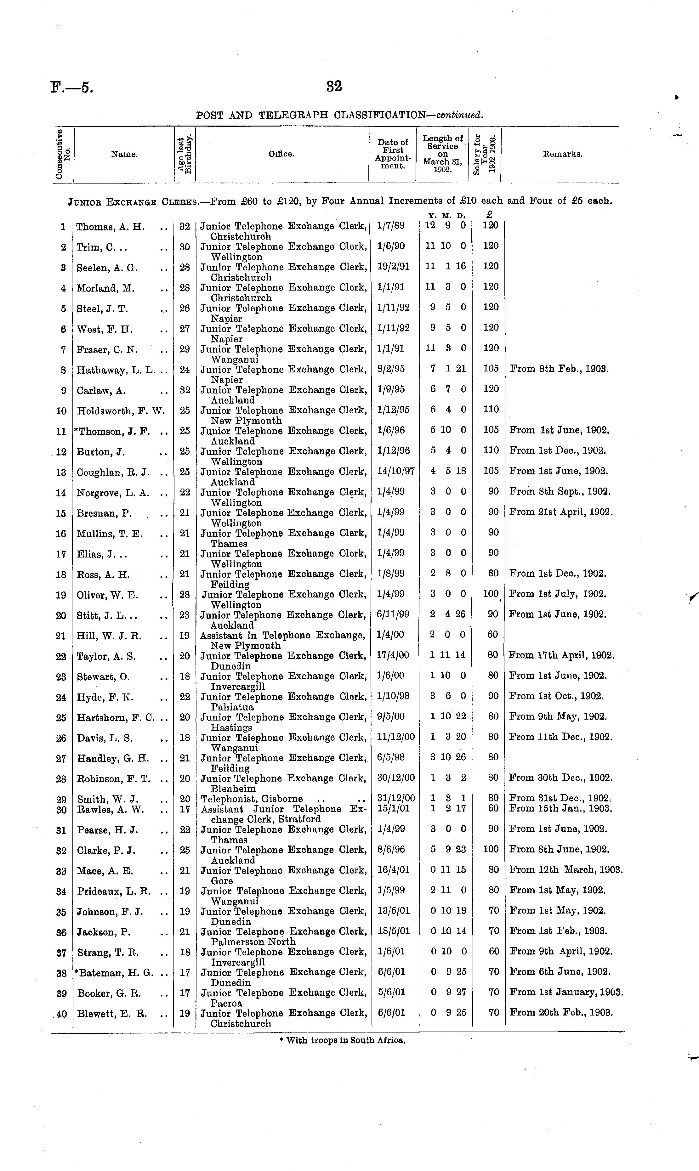 I a o D Name. 4= >. CD tf tf is CDll Office. Date of Length of First Se " Ice A rSt nt " March 31, mont - 1902. g g £gs tf 2 in r " 1 Remarks. 1 2 uniob Exchange C: Thomas, A. H. .ERK! 32 30 I.—From £60 to £120, by Four Anni Junior Telephone Exchange Clerk, Christchurch Junior Telephone Exchange Clerk, Wellington Junior Telephone Exchange Clerk, Christchurch Junior Telephone Exohange Clerk, Christchurch Junior Telephone Exchange Clerk, Napier Junior Telephone Exchange Clerk, Napier Junior Telephone Exchange Clerk, Wanganui Junior Telephone Exchange Clerk, Napier Junior Telephone Exchange Clerk, Auckland Junior Telephone Exohange Clerk, New Plymouth Junior Telephone Exohange Clerk, Auckland Junior Telephone Exohange Clerk, Wellington Junior Telephone Exchange Clerk, Auckland Junior Telephone Exchange Clerk, Wellington Junior Telephone Exohange Clerk, Wellington Junior Telephone Exohange Clerk, Thames Junior Telephone Exchange Clerk, Wellington Junior Telephone Exohange Clerk, Feilding Junior Telephone Exohange Clerk, Wellington Junior Telephone Exohange Clerk, Auckland Assistant in Telephone Exchange, New Plymouth Junior Telephone Exohange Clerk, Dunedin Junior Telephone Exchange Clerk, Invercargill Junior Telephone Exchange Clerk, Pahiatua Junior Telephone Exohange Clerk, Hastings Junior Telephone Exchange Clerk, Wanganui Junior Telephone Exohange Clerk, Feilding Junior Telephone Exohange Clerk, Blenheim Telephonist, Gisborne Assistant Junior Telephone Exchange Clerk, Stratford Junior Telephone Exohange Clerk, Thames Junior Telephone Exohange Clerk, Auckland Junior Telephone Exohange Olerk, Gore Junior Telephone Exchange Clerk, Wanganui Junior Telephone Exohange Olerk, Dunedin Junior Telephone Exchange Clerk, Palmerston North Junior Telephone Exohange Clerk, Invercargill Junior Telephone Exchange Clerk, Dunedin Junior Telephone Exohange Clerk, Paeroa Junior Telephone Exohange Clerk, Christohurch tai Inorer 1/7/89 1/6/90 lents of £li Y. M. D. 12 9 0 11 10 0 0 each £ 120 120 120 each £ 120 120 and Four of £5 eaoh. Trim, 0. .. 3 Seelen, A. G. 28 19/2/91 11 1 16 120 4 Morland, M. 28 1/1/91 11 3 0 120 120 120 120 105 120 120 From 8th Feb., 1903. 5 Steel, J. T. 26 1/11/92 9 5 0 120 6 West, F. H. 27 1/11/92 9 5 0 120 7 Fraser, CN. 29 1/1/91 11 3 0 120 8 Hathaway, L. L. 24 8/2/95 7 1 21 105 9 Garlaw, A. 32 1/9/95 6 7 0 120 10 Holdsworth, F. W. 25 1/12/95 6 4 0 5 10 0 110 105 110 105 From 1st June, 1902. 11 •Thomson, J. F. 25 1/6/96 12 Burton, J. 25 1/12/96 5 4 0 110 110 From 1st Dec, 1902. 13 Coughlan, R. J. 25 14/10/97 4 5 18 105 105 From 1st June, 1902. 14 Norgrove, L. A. 22 1/4/99 3 0 0 90 90 From 8th Sept., 1902. 15 Bresnan, P. 21 1/4/99 3 0 0 90 no 90 From 21st April, 1902. 16 Mullins, T. E. 21 1/4/99 3 0 0 90 90 90 17 Elias, J. .. 21 1/4/99 3 0 0 90 18 Ross, A. H. 21 1/8/99 2 8 0 80 80 From 1st Dec, 1902. 19 Oliver, W. E. 28 1/4/99 3 0 0 100 100 From 1st July, 1902. 20 Stitt, J. L 23 6/11/99 2 4 26 90 60 90 From 1st June, 1902. 21 Hill, W. J. R. 19 1/4/00 2 0 0 DU 80 60 From 17th April, 1902. 22 Taylor, A. S. 20 17/4/00 1 11 14 80 23 Stewart, 0. 18 1/6/00 1 10 0 80 80 From 1st June, 1902. 24 Hyde, F. K. 22 1/10/98 3 6 0 90 90 From 1st Oct., 1902. 25 Hartshorn, F. 0. 20 9/5/00 1 10 22 80 80 From 9th May, 1902. 26 Davis, L. S. 18 11/12/00 1 3 20 80 80 80 From 11th Dec, 1902. 27 Handley, G. H. 21 6/5/98 3 10 26 BU 80 80 From 30th Dec, 1902. 28 Robinson, F. T. 20 30/12/00 13 2 80 29 30 Smith, W. J. Rawles, A. W. 20 17 31/12/00 15/1/01 13 1 1 2 17 80 60 80 60 From 31st Dec, 1902. From 15th Jan., 1903. 31 Pearse, H. J. 22 1/4/99 3 0 0 90 90 From 1st June, 1902. 32 Clarke, P. J. 25 8/6/96 5 9 23 100 100 From 8th June, 1902. 33 Maoe, A. E. 21 16/4/01 0 11 15 80 80 From 12th Maroh, 1903. 34 Prideaux, L. R. 19 1/5/99 2 11 0 80 80 From 1st May, 1902. 35 Johnson, F. J. 19 13/5/01 0 10 19 70 70 From 1st May, 1902. 36 Jackson, P. 21 18/5/01 0 10 14 70 70 From 1st Feb., 1903. 37 Strang, T. R. 18 1/6/01 0 10 0 60 60 From 9th April, 1902. 38 *Bateman, H. G. 17 6/6/01 0 9 25 70 70 From 6th June, 1902. 39 Booker, G. R. 17 5/6/01 0 9 27 70 70 From 1st January, 1903. 40 Blewett, E. R. 19 6/6/01 0 9 25 70 70 From 20th Feb., 1903. * With troops in South Africa,