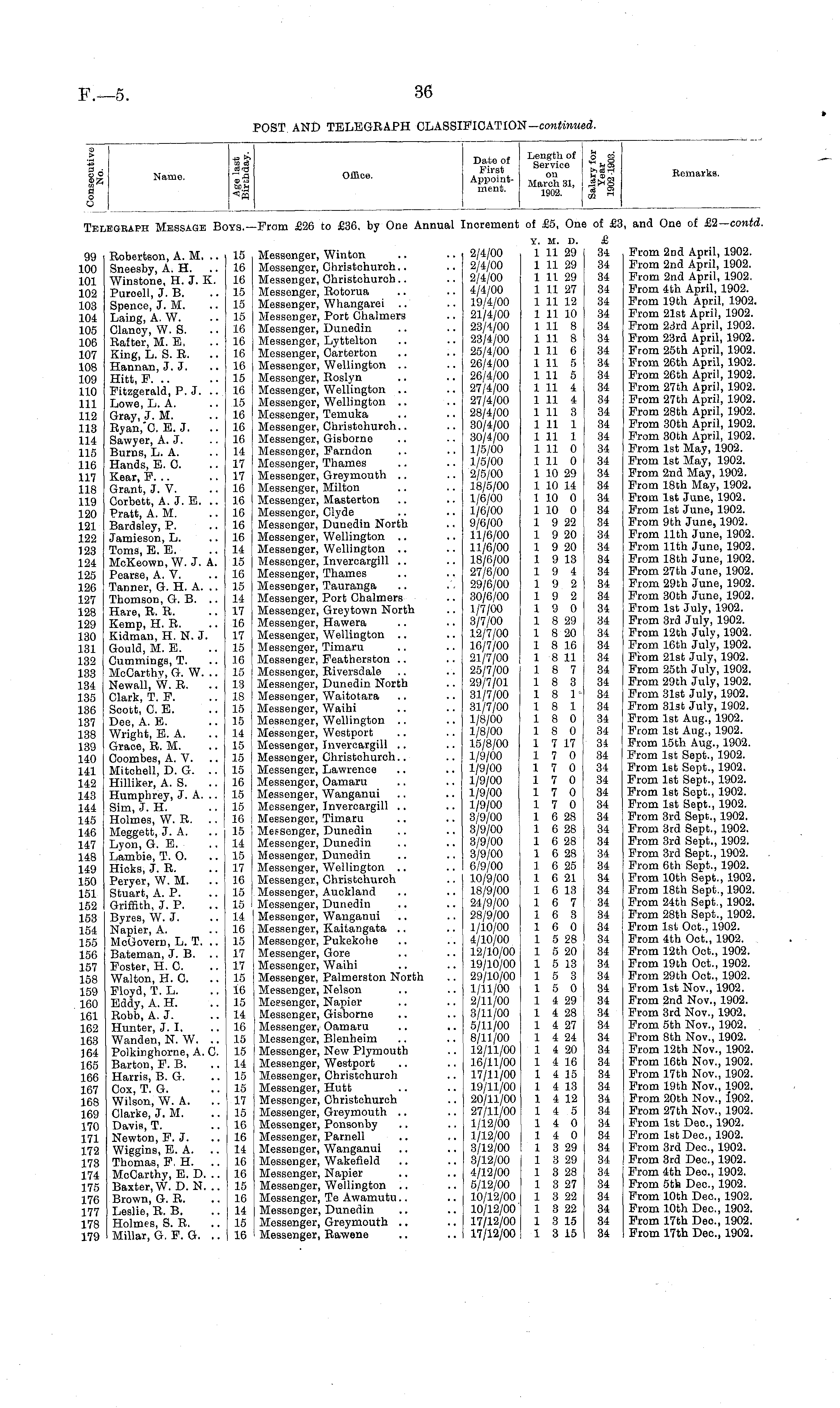 > fl o O Name. 43 >> CD tf tf is za Office. t.„4„ ,.# Length of g 22 *w Service "S3 nst on >> tf rf A ££nt nt " March 31, S&% ment ' 1902. g 3 Remarks. Tei egeaph Message B IYS.■From £26 to £36. by One Annual increment of £5, Om of £3 , and One of £2— contd. 99 100 101 102 103 104 105 106 107 108 109 110 111 112 113 114 115 116 117 118 119 120 121 122 123 124 125 126 127 128 129 130 131 132 133 134 135 136 137 138 139 140 141 142 143 144 145 146 147 148 149 150 151 152 153 154 155 156 157 158 159 160 161 162 163 164 165 166 167 168 169 170 171 172 173 174 175 176 177 178 179 Robertson, A. M. Sneesby, A. H. Winstone, H. J. K. Puroell, J. B. Spence, J. M. Laing, A. W. Clanoy, W. S. Rafter, M. E, King, L. S. R. Hannan, J. J. Hitt, F. .. Fitzgerald, P. J. Lowe, L. A. Gray, J. M. Ryan,'C E. J. Sawyer, A. J. Burns, L. A. Hands, E. 0. Kear, F. .. Grant, J. V. Gorbett, A. J. E. .. Pratt, A. M. Bardsley, P. Jamieson, L. Toms, E. E. McKeown, W. J. A. Pearse, A. V. Tanner, G. H. A. .. Thomson, G. B. .. Hare, R. R. Kemp, H. R. Kidman, H. N. J. Gould, M. E. Cummings, T. McCarthy, G. W. .. Newall, W. R. Clark, T. F. Scott, CE. Dee, A. E. Wright, E. A. Grace, R. M. Ooombes, A. V. Mitchell, D. G. Hilliker, A. S. Humphrey, J. A. .. Sim, J. H. Holmes, W. R. Meggett, J. A. Lyon, G. E. Lambie, T. 0. Hicks, J. R. Peryer, W. M. Stuart, A. P. Griffith, J. P. Byres, W. J. Napier, A. McGovern, L. T. Bateman, J. B. Foster, H. 0. Walton, H. 0. Floyd, T. L. Eddy, A. H. Robb, A. J. Hunter, J. I. Wanden, N. W. .. Polkinghorne, A. 0. Barton, F. B. Harris, B. G. Cox, T. G. Wilson, W. A. Clarke, J. M. Davis, T. Newton, F. J. Wiggins, E. A. Thomas, F, H. McCarthy, E. D. .. Baxter, W. D. N. .. Brown, G. R. Leslie, R. B. Holmes, S. R. Millar, G. F. G. .. 15 16 16 15 15 15 16 16 16 16 15 16 15 16 16 16 14 17 17 16 16 16 16 16 14 15 16 15 14 17 16 17 15 16 15 13 18 15 15 14 15 15 15 16 15 15 16 15 14 15 17 16 15 15 14 16 15 17 17 15 16 15 14 16 15 15 14 15 15 17 15 16 16 14 16 16 15 16 14 15 16 Messenger, Winton Messenger, Christchurch.. Messenger, Christchurch Messenger, Rotorua Messenger, Whangarei Messenger, Port Chalmers Messenger, Dunedin Messenger, Lyttelton Messenger, Carterton Messenger, Wellington Messenger, Roslyn Messenger, Wellington Messenger, Wellington Messenger, Temuka Messenger, Christohurch.. Messenger, Gisborne Messenger, Farndon Messenger, Thames Messenger, Greymouth Messenger, Milton Messenger, Masterton Messenger, Clyde Messenger, Dunedin North Messenger, Wellington Messenger, Wellington Messenger, Invercargill Messenger, Thames Messenger, Tauranga Messenger, Port Chalmers Messenger, Greytown North Messenger, Hawera Messenger, Wellington Messenger, Timaru Messenger, Featherston Messenger, Riyersdale Messenger, Dunedin North Messenger, Waitotara Messenger, Waihi Messenger, Wellington Messenger, Westport Messenger, Invercargill Messenger, Christchurch.. Messenger, Lawrence Messenger, Oamaru Messenger, Wanganui Messenger, Invercargill Messenger, Timaru Messenger, Dunedin Messenger, Dunedin Messenger, Dunedin Messenger, Wellington Messenger, Christchurch Messenger, Auokland Messenger, Dunedin Messenger, Wanganui Messenger, Kaitangata Messenger, Pukekohe Messenger, Gore Messenger, Waihi Messenger, Palmerston North Messenger, Nelson Messenger, Napier Messenger, Gisborne Messenger, Oamaru Messenger, Blenheim Messenger, New Plymouth Messenger, Westport Messenger, Christchuroh Messenger, Hutt Messenger, Christchurch Messenger, Greymouth Messenger, Ponsonby Messenger, Parnell Messenger, Wanganui Messenger, Wakefield Messenger, Napier Messenger, Wellington Messenger, Te Awamutu Messenger, Dunedin Messenger, Greymouth Messenger, Rawene 2/4/00 2/4/00 2/4/00 4/4/00 19/4/00 21/4/00 23/4/00 23/4/00 25/4/00 26/4/00 26/4/00 27/4/00 27/4/00 28/4/00 30/4/00 30/4/00 1/5/00 1/5/00 2/5/00 18/5/00 1/6/00 1/6/00 9/6/00 11/6/00 11/6/00 18/6/00 27/6/00 29/6/00 30/6/00 1/7/00 3/7/00 12/7/00 16/7/00 21/7/00 25/7/00 29/7/01 31/7/00 31/7/00 1/8/00 1/8/00 15/8/00 1/9/00 1/9/00 1/9/00 1/9/00 1/9/00 3/9/00 3/9/00 3/9/00 3/9/00 6/9/00 10/9/00 18/9/00 24/9/00 28/9/00 1/10/00 4/10/00 12/10/00 19/10/00 29/10/00 1/11/00 2/11/00 3/11/00 5/11/00 8/11/00 12/11/00 16/11/00 17/11/00 19/11/00 20/11/00 27/11/00 1/12/00 1/12/00 3/12/00 3/12/00 4/12/00 5/12/00 10/12/00 10/12/00 17/12/00 17/12/00 Y. M. D. 1 11 29 1 11 29 1 11 29 1 11 27 1 11 12 1 11 10 1 11 8 1 11 8 1 11 6 1 11 5 1 11 5 1 11 4 1 11 4 1 11 3 1 11 1 1 11 1 1 11 0 1 11 0 1 10 29 1 10 14 1 10 0 1 10 0 1 9 22 1 9 20 1 9 20 1 9 13 19 4 19 2 19 2 19 0 1 8 29 1 8 20 1 8 16 1 8 11 18 7 18 3 1 8 1 18 1 18 0 18 0 1 7 17 1 7 0 17 0 17 0 17 0 17 0 1 6 28 1 6 28 1 6 28 1 6 28 1 6 25 1 6 21 1 6 13 16 7 16 3 16 0 1 5 28 1 5 20 1 5 13 15 3 15 0 1 4 29 1 4 28 1 4 27 1 4 24 1 4 20 1 4 16 1 4 15 1 4 13 1 4 12 14 5 14 0 14 0 1 3 29 1 3 29 1 3 28 1 3 27 1 3 22 1 3 22 1 3 15 1 3 15 £ 34 34 34 34 34 34 34 34 34 34 34 34 34 34 34 34 34 34 34 34 34 34 34 34 34 34 34 34 34 34 34 34 34 34 34 34 34 34 34 34 34 34 34 34 34 34 34 34 34 34 34 34 34 34 34 34 34 34 34 34 34 34 34 34 34 34 34 34 34 34 34 34 34 34 34 34 34 34 34 34 34 From 2nd April, 1902. From 2nd April, 1902. From 2nd April, 1902. From 4th April, 1902. From 19th April, 1902. From 21st April, 1902. From 23rd April, 1902. From 23rd April, 1902. From 25th April, 1902. From 26th April, 1902. From 26th April, 1902. From 27th April, 1902. From 27th April, 1902. From 28th April, 1902. From 30th April, 1902. From 30th April, 1902. From 1st May, 1902. From 1st May, 1902. From 2nd May, 1902. From 18th May, 1902. From 1st June, 1902. From 1st June, 1902. From 9th June, 1902. From 11th June, 1902. From 11th June, 1902. From 18th June, 1902. From 27th June, 1902. From 29th June, 1902. From 30th June, 1902. From 1st July, 1902. From 3rd July, 1902. From 12th July, 1902. From 16th July, 1902. From 21st July, 1902. From 25th July, 1902. From 29th July, 1902. From 31st July, 1902. From 31st July, 1902. From 1st Aug., 1902. From 1st Aug., 1902. From 15t