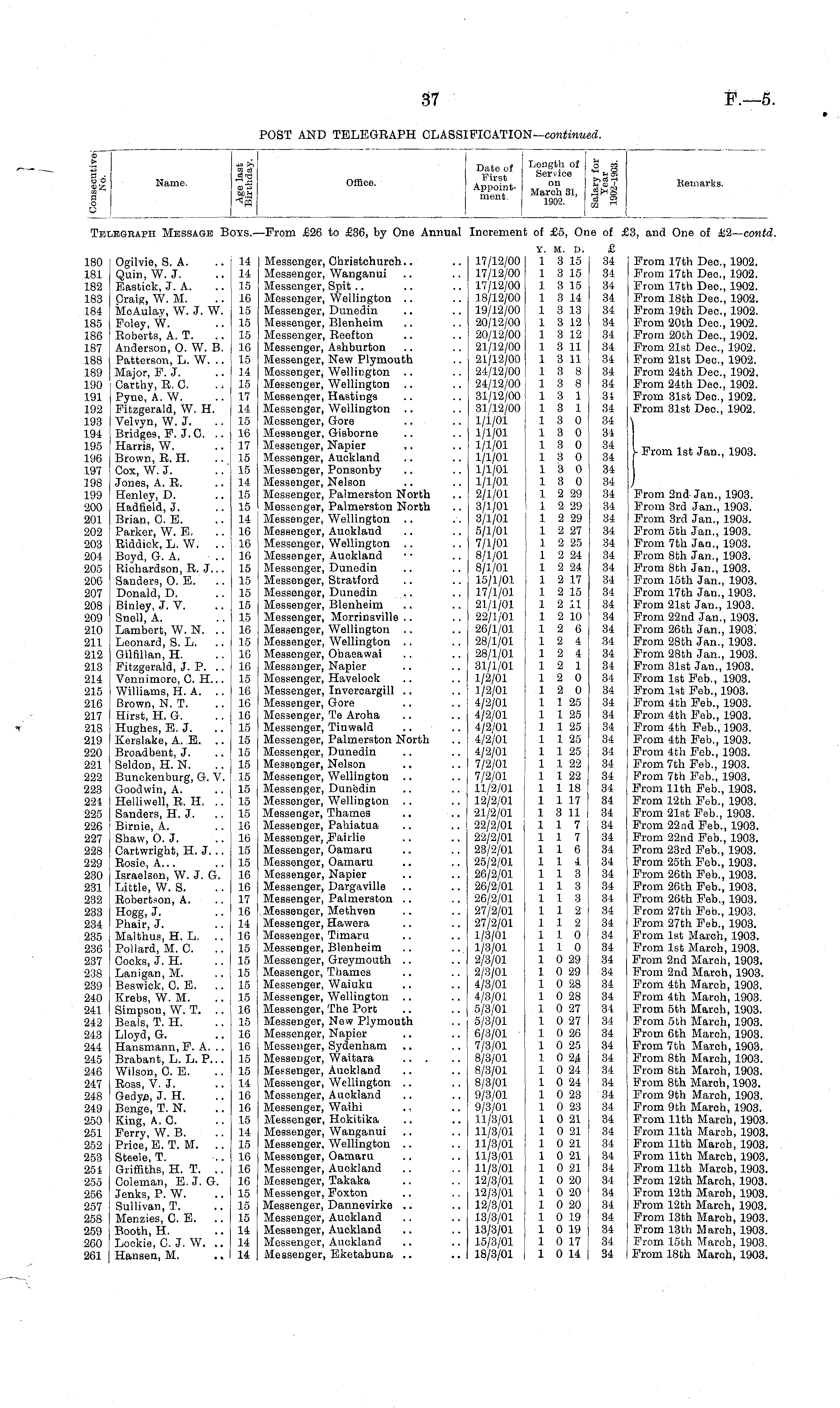 > Id as* a o o Name. 43 >, CD tf tf rcS Office. Date of L™^? 1 of | S T*j va t Service ** f^en * 11 St >, tf r-C Appoint- Tur°S, m §.£=!> ££,*,!, March 31, rt^o ment - 1902. g 3 Remarks. TBI :,egbaph Message Bi IYS., -From £26 to £36, by One Annual Increment of £5, Oi le of !3, and One of £2 — contd. 180 181 182 183 184 185 186 187 188 189 190 191 192 193 194 195 196 197 198 199 200 201 202 203 204 205 206 207 208 209 210 211 212 213 214 215 216 217 218 219 220 221 222 223 224 225 226 227 228 229 230 231 232 233 234 235 236 237 238 239 240 241 242 243 244 245 246 247 248 249 250 251 252 253 254 255 256 257 258 259 260 261 Ogilvie, S. A. Quin, W. J. Eastiek, J. A. Craig, W. M. McAulav, W. J. W. Foley, W. Roberts, A. T. Anderson, 0. W. B. Patterson, L. W. Major, F. J. Oarthy, R. G. Pyne, A. W. Fitzgerald, W. H. Velvyn, W. J. Bridges, F. J. 0. .. Harris, W. Brown, R. H. Cox, W. J. Jones, A. R. Henley, D. Hadfield, J. Brian, CJ. Parker, W. E. Riddick, L. W. Boyd, G. A. Richardson, R, J... Sanders, 0. E. Donald, D. Binley, J. V. Snell, A. Lambert, W. N. Leonard, S. L. Gilfillan, H. Fitzgerald, J. P. Vennimore, G. H... Williams, H. A. Brown, N. T. Hirst, H. G. Hughes, E. J. Kerslake, A. E. Broadbent, J. Seldon, H. N. Bunckenburg, G. V. Goodwin, A. Helliwell, R. H. Sanders, H. J. Birnie, A. Shaw, 0. J. Cartwright, H. J. .. Rosie, A... Israelsen, W. J. G. Little, W. S. Robertson, A. Hogg, J. Phair, J. Malthus, H. L. Pollard, M. O. Cocks, J. H. Lanigan, M. Beswick, OJ, Krebs, W. M. Simpson, W. T. Beals, T. H. Lloyd, G. Hansmann, F. A. .. Brabant, L. L. P... Wilson, 0. E. Ross, V. J. Gedye, J. H. Benge, T. N. King, A. 0. Ferry, W. B. Price, E. T. M. Steele, T. Griffiths, H. T. Goleman, E. J. G. Jenks, P. W. Sullivan, T. Menzies, CJ. Booth, H. Lockie, G. J. W. .. Hansen, M. 14 11 15 16 15 15 15 16 15 14 15 17 14 15 16 17 15 15 14 15 15 14 16 16 16 15 15 15 15 15 16 15 16 16 15 16 16 16 15 15 15 15 15 15 15 15 16 16 15 15 16 16 17 16 14 16 15 15 15 15 15 16 15 16 16 15 15 14 1G 16 15 14 15 16 16 16 15 15 15 14 14 14 Messenger, Christchurch.. Messenger, Wanganui Messenger, Spit Messenger, Wellington Messenger, Dunedin Messenger, Blenheim Messenger, Reefton Messenger, Ashburton Messenger, New Plymouth Messenger, Wellington Messenger, Wellington Messenger, Hastings Messenger, Wellington Messenger, Gore Messenger, Gisborne Messenger, Napier Messenger, Auckland Messenger, Ponsonby Messenger, Nelson Messenger, Palmerston North Messenger, Palmerston North Messenger, Wellington Messenger, Auckland Messenger, Wellington Messenger, Auckland Messenger, Dunedin Messenger, Stratford Messenger, Dunedin Messenger, Blenheim Messenger, Morrinsville Messenger, Wellington Messenger, Wellington Messenger, Ohaeawai Messenger, Napier Messenger, Havelock Messenger, Invercargill Messenger, Gore Messenger, Te Aroha Messenger, Tiuwald Messenger, Palmerston North Messenger, Dunedin Messenger, Nelson Messenger, Wellington Messenger, Dunedin Messenger, Wellington Messenger, Thames Messenger, Pahiatua Messenger, Fairlie Messenger, Oamaru Messenger, Oamaru Messenger, Napier Messenger, Dargaville Messenger, Palmerston Messenger, Methven Messenger, Hawera Messenger, Timaru Messenger, Blenheim Messenger, Greymouth Messenger, Thames Messenger, Waiuku Messenger, Wellington Messenger, The Port Messenger, New Plymouth Messenger, Napier Messenger, Sydenham Messenger, Waitara Messenger, Auckland Messenger, Wellington Messenger, Auckland Messenger, Waihi Messenger, Hokitika Messenger, Wanganui Messenger, Wellington Messenger, Oamaru Messenger, Auckland Messenger, Takaka Messenger, Foxton Messenger, Dannevirke Messenger, Auokland Messenger, Auckland Messenger, Auckland Messenger, Eketahuna .. 17/12/00 17/12/00 17/12/00 18/12/00 19/12/00 20/12/00 20/12/00 21/12/00 21/12/00 24/12/00 24/12/00 31/12/00 31/12/00 1/1/01 1/1/01 1/1/01 1/1/01 1/1/01 1/1/01 2/1/01 3/1/01 3/1/01 5/1/01 7/1/01 8/1/01 8/1/01 15/1/01 17/1/01 21/1/01 22/1/01 26/1/01 28/1/01 28/1/01 31/1/01 1/2/01 1/2/01 4/2/01 4/2/01 4/2/01 4/2/01 4/2/01 7/2/01 7/2/01 11/2/01 12/2/01 21/2/01 I 22/2/01 22/2/01 23/2/01 25/2/01 26/2/01 26/2/01 26/2/01 27/2/01 27/2/01 1/3/01 1/3/01 2/3/01 2/3/01 4/3/01 4/3/01 5/3/01 5/3/01 6/3/01 7/3/01 8/3/01 8/3/01 8/3/01 9/3/01 9/3/01 11/3/01 11/3/01 11/3/01 11/3/01 11/3/01 12/3/01 12/3/01 12/3/01 13/3/01 13/3/01 15/3/01 18/3/01 Y. M. D. 1 3 15 1 3 15 1 3 15 1 3 14 1 3 13 1 3 12 1 3 12 1 3 11 1 3 11 13 8 13 8 13 1 13 1 13 0 13 0 13 0 13 0 13 0 13 0 1 2 29 1 2 29 1 2 29 1 2 27 1 2 25 1 2 24 1 2 24 1 2 17 1 2 15 1 2 11 1 2 10 12 6 12 4 12 4 12 1 12 0 12 0 1 1 25 1 1 25 1 1 25 1 1 25 1 1 25 1 1 22 1 1 22 1 1 18 1 1 17 1 3 11 1 1 7 117 116 114 113 113 113 112 112 110 110 1 0 29 1 0 29 1 0 28 1 0 28 1 0 27 1 0 27 1 0 26 1 0 25 1 0 24 1 0 24 1 0 24 1 0 23 1 0 23 1 0 21 1 0 21 1 0 21 1 0 21 1 0 21 1 0 20 1 0 20 1 0 20 1 0 19 1 0 19 1 0 17 1 0 14 £ 34 34 34 34 34 34 34 34 34 34 34 34 34 34 34 34 34 34 34 34 34 34 34 34 34 34 34 34 34 34 34 34 34 34 34 34 34 34 34 34 34 34 34 34 34 34 34 34 34 34 34 34 34 34 34 34 34 34 34 34 34 34 34 34 34 34 34 34 34 34 34 34 34 34 34 34 34 34 34 34 34 34 From 17th Dec, 1902. From 17th Dec, 1902. From 17th Dec, 1902. From 18th Dec, 1902. From 19th Dec, 1902. From 20th Dec, 1902. From 20th Dec, 1902. From 21st Dec, 1902. From 21st Dec, 1902. From 24th Dec, 1902. From 24th Dec, 1902. From 31st Dec, 1902. From 31st Dec, 1902. I From 1st Jan., 1903. / From 2nd Jan., 1903. From 3rd Jan., 1903. From 3rd Jan., 1903. From 5th Jan., 1903. From 7th Jan., 1903. From 8th Jan., 1903. From 8th Jan., 1903. From 15th Jan., 1903. From 17th Jan., 1903. From 21st Jan., 1903. From 22nd Jan., 1903. From 26th Jan., 1903i From 28th Jan., 1903. From 28th Jan., 1903. From 31st Jan., 1903. From 1st Feb., 1903. From 1st Feb., 1903. From 4th Feb., 1903. From 4th Feb., 1903. From 4th Feb., 1903. From 4th Feb., 1903. From 4th Feb., 1903. From 7th Feb., 1903. From 7th Feb., 1903. From 11th Feb., 1903. From 12th Feb., 1903. From 21st Feb., 1903. 