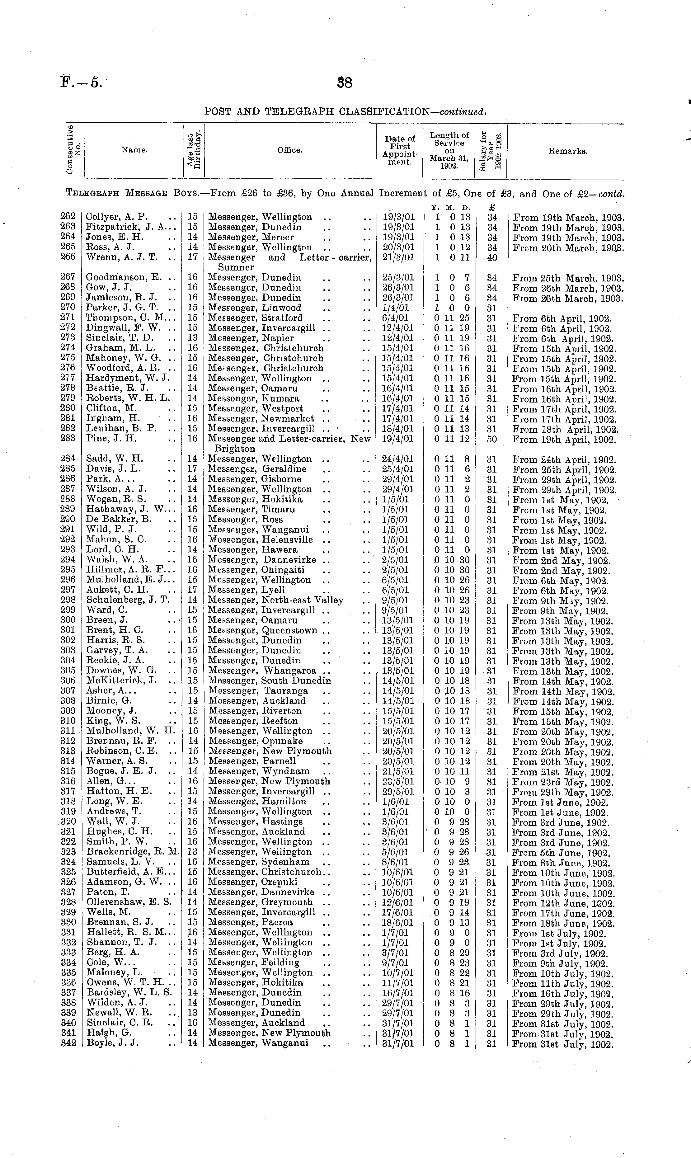 CD > a o o Name. +3 >, CD tf tf ccS Zf ten ""fl Office. Date of 1^? 1 of First Servlce A PP 0 j'- March 31, ment ' 1902. g » fug >>CZr-i tf en EG H Remarks. Telegbaph Message B> iYS.' -From £26 to £36, by One Annual Incremen t of £5, 0: ie of £l I, and One of £2— contd. 262 | Oollyer, A. P. 263 ] Fitzpatrick, J. A... 264 Jones, E. H. 265 Ross, A.J. 266 Wrenn, A. J. T. .. 15 15 14 14 17 Messenger, Wellington Messenger, Dunedin Messenger, Mercer Messenger, Wellington Messenger and Letter - carrier, Sumner Messenger, Dunedin Messenger, Dunedin Messenger, Dunedin Messenger, Linwood Messenger, Stratford Messenger, Invercargill Messenger, Napier Messenger, Christchurch Messenger, Christchurch Messenger, Christohurch Messenger, Wellington Messenger, Oamaru Messenger, Kumara Messenger, Westport Messenger, Newmarket Messenger, Invercargill Messenger arid Letter-carrier, New Brighton Messenger, Wellington Messenger, Geraldine Messenger, Gisborne Messenger, Wellington Messenger, Hokitika Messenger, Timaru Messenger, Ross Messenger, Wanganui Messenger, Helensville Messenger, Hawera Messenger, Dannevirke Messenger, Ohingaiti Messenger, Wellington Messenger, Lyell Messenger, North-east Valley Messenger, Invercargill Messenger, Oamaru Messenger, Queenstown Messenger, Dunedin Messenger, Dunedin Messenger, Dunedin Messenger, Whangaroa Messenger, South Dunedin Messenger, Tauranga Messenger, Auckland Messenger, Riverton Messenger, Reefton Messenger, Wellington Messenger, Opunake Messenger, New Plymouth Messenger, Parnell Messenger, Wyndbam Messenger, New Plymouth Messenger, Invercargill Messenger, Hamilton Messenger, Wellington Messenger, Hastings Messenger, Auokland Messenger, Wellington Messenger, Wellington Messenger, Sydenham Messenger, Christchurch.. Messenger, Orepuki Messenger, Dannevirke Messenger, Greymouth Messenger, Invercargill Messenger, Paeroa Messenger, Wellington Messenger, Wellington Messenger, Wellington Messenger, Feilding Messenger, Wellington Messenger, Hokitika Messenger, Dunedin Messenger, Dunedin Messenger, Dunedin Messenger, Auckland Messenger, New Plymouth Messenger, Wanganui 19/3/01 19/3/01 19/3/01 20/3/01 21/3/01 Y. M. D. 1 0 13 1 0 13 1 0 13 1 0 12 1 0 11 £ 34 34 34 34 40 From 19th Maroh, 1903. From 19th March, 1903. From 19th March, 1903. From 20th March, 19Q3. 267 Goodmanson, E. .. 268 Gow, J. J. 269 [ Jamieson, R. J. 270 Parker, J. G. T. 271 Thompson, C M... 272 Dingwall, F. W. 273 Sinclair, T. D. 274 Graham, M. L. 275 ! Mahoney, W. G. 276 Woodford, A. R. 277 Hardyment, W. J. 278 Beattie, R. J. 279 Roberts, W. H. L. 280 Clifton, M. 281 Ingbam, H. 282 Lenihan, B. P. .. 283 Pine, J. H. 16 16 16 15 15 15 13 16 15 16 14 14 14 15 16 15 16 25/3/01 26/3/01 26/3/01 1/4/01 6/4/01 12/4/01 12/4/01 15/4/01 15/4/01 15/4/01 15/4/01 16/4/01 16/4/01 17/4/01 17/4/01 18/4/01 19/4/01 10 7 10 6 10 6 10 0 0 11 25 0 11 19 0 11 19 0 11 16 0 11 16 0 11 16 0 11 16 0 11 15 0 11 15 0 11 14 0 11 14 0 11 13 0 11 12 34 34 34 31 31 31 31 31 31 31 31 31 31 31 31 31 50 From 25th March, 1903. From 26th March, 1903. From 26th Match, 1903. From 6th April, 1902. From 6th April, 1902. From 6th April, 1902. From 15th April, 1902. From 15th April, 1902. From 15th April, 1902. From 15th April, 1902. From 16th April, 1902. From 16th April, 1902. From 17th April, 1902. From 17th April, 1902. From 18th April, 1902. From 19th April, 1902. 284 Sadd, W. H. 285 Davis, J. L. 286 Park, A... 287 Wilson, A. J. 288 Wogan.R. S. 289 Hathaway, J. W... 290 De Bakker, B. 291 Wild, P. J. 292 Mahon, S. 0. 293 Lord, 0. H. 294 Walsh, W. A. 295 Hillmer, A. R. F... 296 Mulholland,E. J... 297 Aukett, 0. H. 298 Schulenberg, J. T. 299 Ward, 0. 300 Breen, J. 301 Brent, H. 0. 302 Harris, R. S. 303 Garvey, T. A. 304 Reekie, J. A. 305 Downes, W. G. 306 McKitteriok, J. .. 307 Asher, A... 308 Birnie, G. 309 Mooney, J. 810 King, W. S. 311 Mulholland, W. H. 312 Brennan, R. F. .. 313 Robinson, CJ, 314 Warner, A. S. 315 Bogue, J. E. J. .. 316 Allen, G... 317 Hatton, H. E. 318 Long, W. E. 319 Andrews, T. 320 Wall, W.J. 321 Hughes, 0. H. 322 Smith, P. W. 323 Brackenridge, R. M. 324 Samuels, L. V. 325 Butterfield, A. E... 326 Adamson, G. W. .. 327 Paton, T. 328 Ollerenshaw, E. S. 329 Wells, M. 330 Brennan, S. J. 331 Hallett, R. S. M... 332 Shannon, T. J. 333 Berg, H. A. 334 Cole, W... 335 Maloney, L. 336 Owens, W. T. H. .. 337 Bardsley, W. L. S. 338 Wilden, A. J. 339 Newall, W. R. 340 Sinclair, 0. R. 341 Haigh, G. 342 Boyle, J. J. 14 17 14 14 14 16 15 15 16 14 16 16 15 17 14 15 15 16 15 15 15 15 15 15 14 15 15 16 14 15 15 14 16 15 14 15 16 15 16 13 16 15 16 14 14 15 15 16 14 15 15 15 15 14 14 13 16 14 14 24/4/01 25/4/01 29/4/01 29/4/01 1/5/01 1/5/01 1/5/01 1/5/01 1/5/01 1/5/01 2/5/01 2/5/01 6/5/01 6/5/01 9/5/01 9/5/01 13/5/01 13/5/01 13/5/01 13/5/01 13/5/01 13/5/01 14/5/01 14/5/01 14/5/01 15/5/01 15/5/01 20/5/01 20/5/01 20/5/01 20/5/01 21/5/01 23/5/01 29/5/01 1/6/01 1/6/01 3/6/01 3/6/01 3/6/01 5/6/01 8/6/01 10/6/01 10/6/01 10/6/01 12/6/01 17/6/01 18/6/01 1/7/01 1/7/01 3/7/01 9/7/01 10/7/01 11/7/01 16/7/01 29/7/01 29/7/01 31/7/01 31/7/01 31/7/01 0 11 8 0 11 6 0 11 2 0 11 2 0 11 0 0 11 0 0 11 0 0 11 0 0 11 0 0 11 0 0 10 30 0 10 30 0 10 26 0 10 26 0 10 23 0 10 23 0 10 19 0 10 19 0 10 19 0 10 19 0 10 19 0 10 19 0 10 18 0 10 18 0 10 18 0 10 17 0 10 17 0 10 12 0 10 12 0 10 12 0 10 12 0 10 11 0 10 9 0 10 3 0 10 0 0 10 0 0 9 28 ' 0 9 28 0 9 28 0 9 26 0 9 23 0 9 21 0 9 21 0 9 21 0 9 19 0 9 14 0 9 13 0 9 0 0 9 0 0 8 29 0 8 23 0 8 22 0 8 21 0 8 16 0 8 3 0 8 3 0 8 1 0 8 1 0 8 1 31 31 31 31 31 31 31 31 31 31 31 31 31 31 31 31 31 31 31 31 31 31 31 31 31 31 31 31 31 31 31 31 31 31 31 31 31 31 31 31 31 31 31 31 31 31 31 31 31 31 31 31 31 31 31 31 31 31 31 From 24th April, 1902. From 25th April, 1902. From 29th April, 1902. From 29th April, 1902. From 1st May, 1902. From 1st May, 1902. From 1st May, 1902. From 1st May, 1902. From 1st May, 1902. From 1st May, 1902. From 2nd May, 1902. From 2nd May, 1902. From 6th May, 1902. From 6th May, 1902. From 9th May, 1902