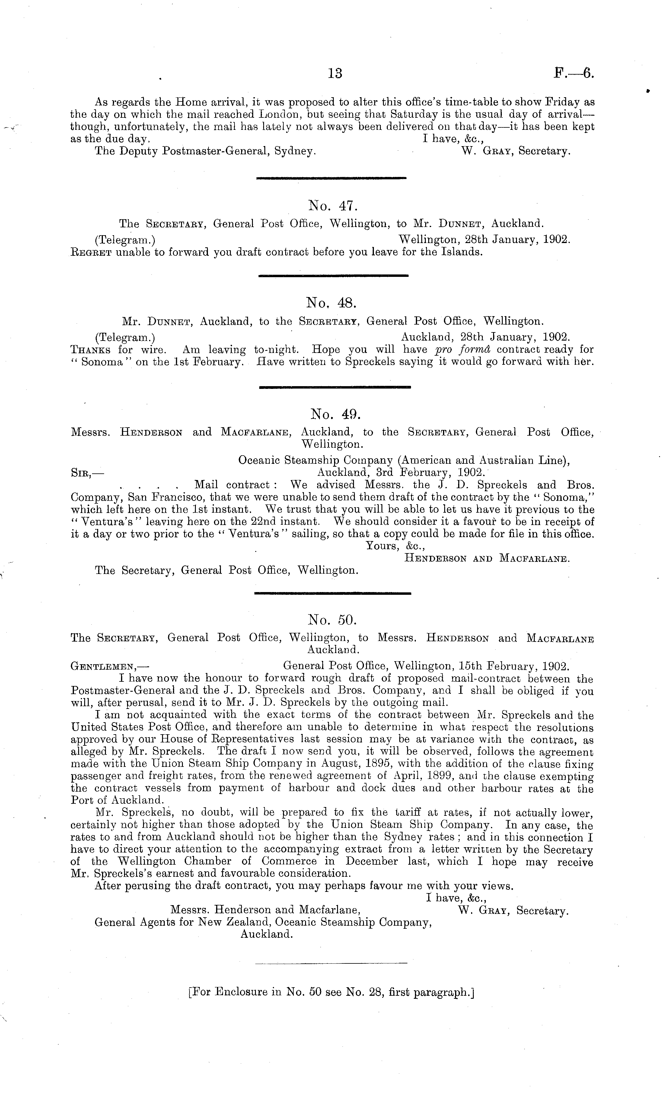 No. 50. The Secrbtaby, General Post Office, Wellington, to Messrs. Henderson and Macfablane Auckland. Gentlemen, — General Post Office, Wellington, 15th February, 1902. I have now the honour to forward rough draft of proposed mail-contract between the Postmaster-General and the J. D. Spreckels and Bros. Company, and I shall be obliged if you will, after perusal, send it to Mr. J. D. Spreckels by the outgoing mail. I am not acquainted with the exact terms of the contract between Mr. Spreckels and the United States Post Office, and therefore am unable to determine in what respect the resolutions approved by our House of Representatives last session may be at variance with the contract, as alleged by Mr. Spreckels. The draft I now send you, it will be observed, follows the agreement made with the Union Steam Ship Company in August, 1895, with the addition of the clause fixing passenger and freight rates, from the renewed agreement of April, 1899, and the clause exempting the contract vessels from payment of harbour and dock dues and other harbour rates at the Port of Auckland. Mr. Spreckels, no doubt, will be prepared to fix the tariff at rates, if not actually lower, certainly not higher than those adopted by the Union Steam Ship Company. In any case, the rates to and from Auckland should not be higher than the Sydney rates ; and in this connection I have to direct your attention to the accompanying extract from a letter written by the Secretary of the Wellington Chamber of Commerce in December last, which I hope may receive Mr. Spreckels's earnest and favourable consideration. After perusing the draft contract, you may perhaps favour me with your views. I have, &c, Messrs. Henderson and Macfarlane, W. Gray, Secretary. General Agents for New Zealand, Oceanic Steamship Company, Auckland.