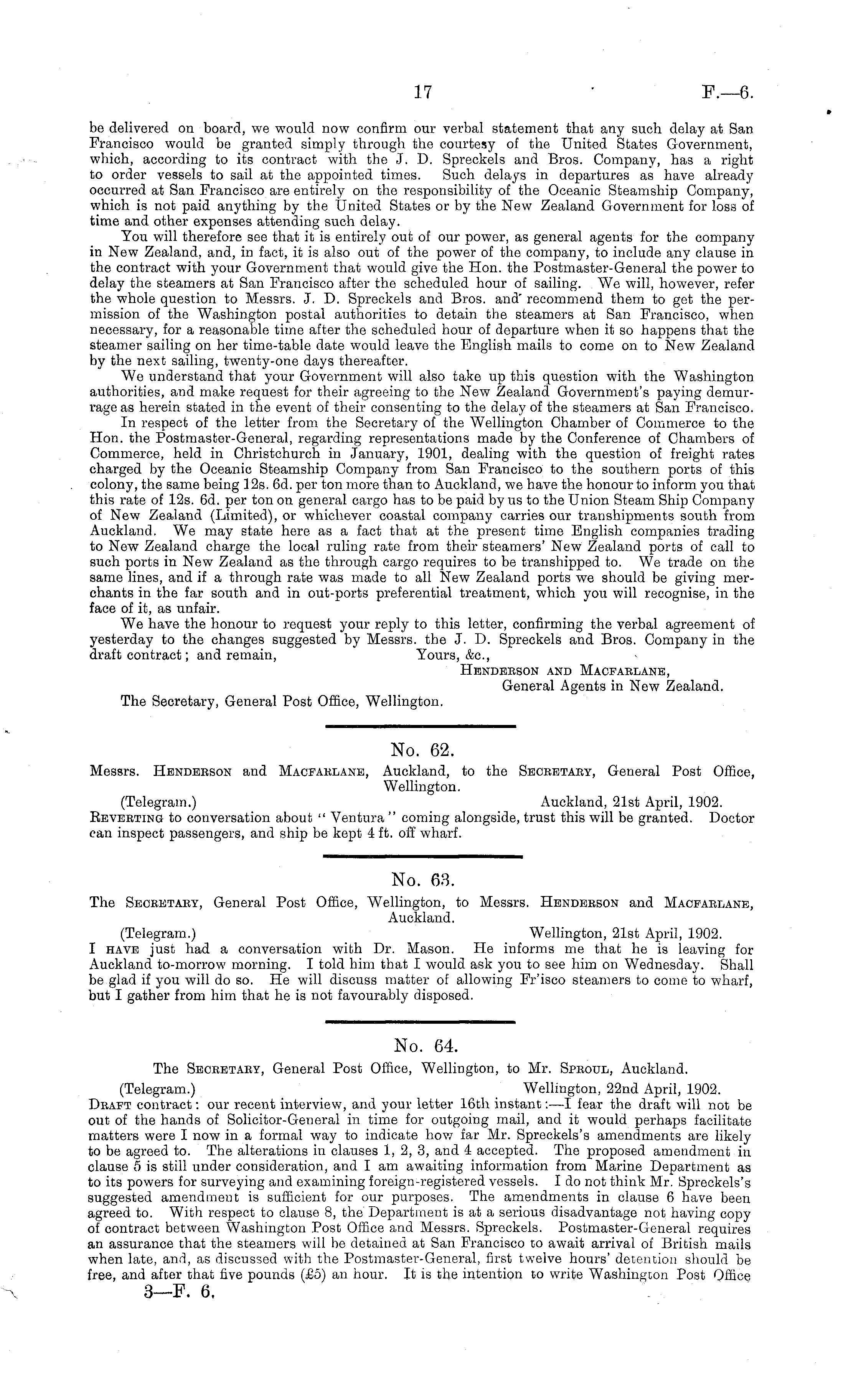 No. 64. The Secbetaey, General Post Office, Wellington, to Mr. Spboul, Auckland. (Telegram.) Wellington, 22nd April, 1902. Deaft contract: our recent interview, and your letter 16th instant: —l fear the draft will not be out of the hands of Solicitor-General in time for outgoing mail, and it would perhaps facilitate matters were I now in a formal way to indicate how far Mr. Spreckels's amendments are likely to be agreed to. The alterations in clauses 1, 2, 3, and £ accepted. The proposed amendment in clause 5 is still under consideration, and I am awaiting information from Marine Department as to its powers for surveying and examining foreign-registered vessels. Ido not think Mr. Spreckels's suggested amendment is sufficient for our purposes. The amendments in clause 6 have been agreed to. With respect to clause 8, the Department is at a serious disadvantage not having copy of contract between Washington Post Office and Messrs. Spreckels. Postmaster-General requires an assurance that the steamers will be detained at San Francisco to await arrival of British mails when late, and, as discussed with the Postmaster-General, first twelve hours' detention should be free, and after that five pounds (£5) an hour. It is the intention to write Washington Post Office 3—F. 6,