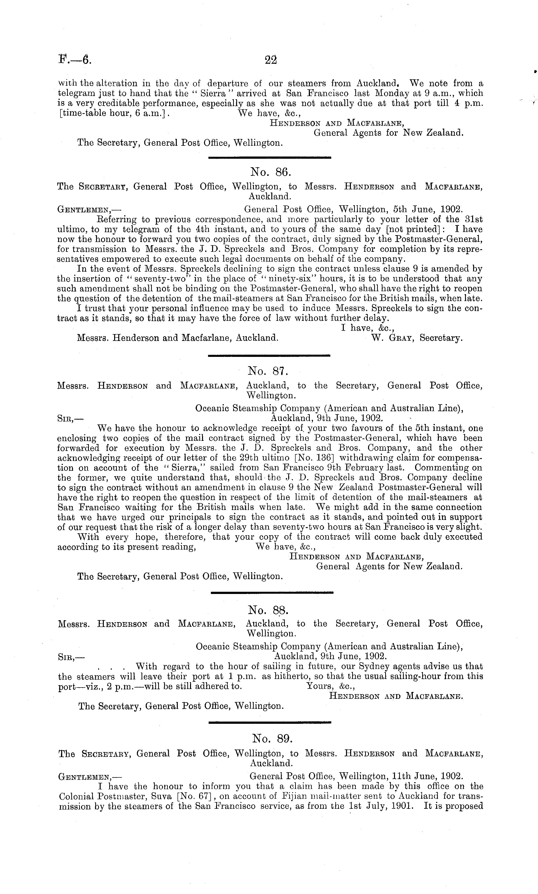 No. 89. The Secretary, General Post Office, Wellington, to Messrs. Henderson and Macfarlane, Auckland. Gentlemen, — General Post Office, Wellington, 11th June, 1902. I have the honour to inform you that a claim has been made by this office on the Colonial Postmaster, Suva [No. 67], on account of Fijian mail-matter sent to Auckland for transmission by the steamers of the San Francisco service, as from the Ist July, 1901. It is proposed
