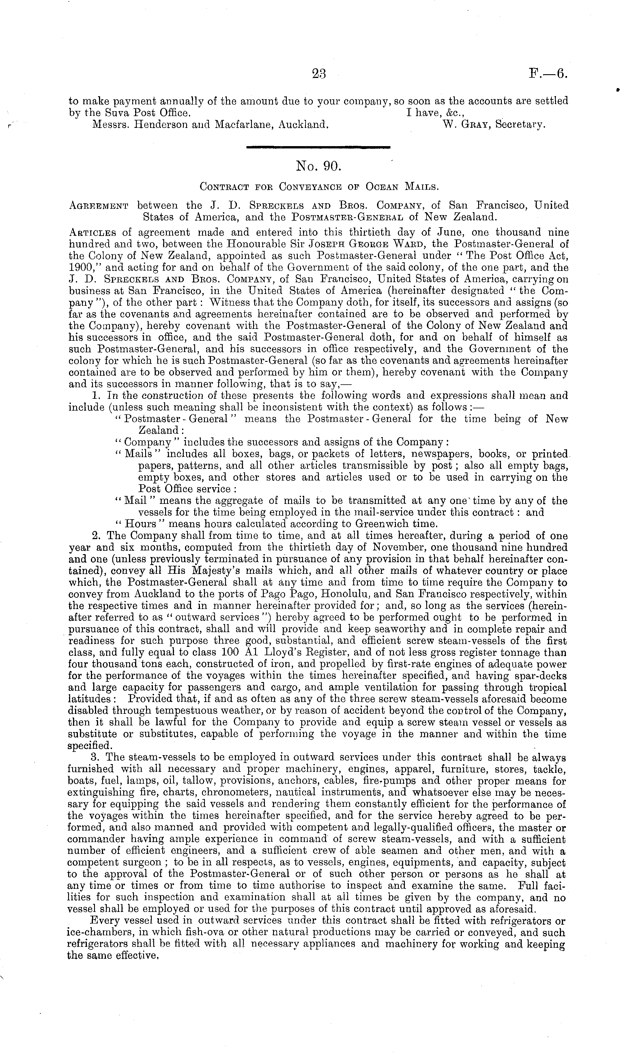 No. 90. Contract foe Conveyance op Ocean Mails. Agreement between the J. D. Spreckels and Bros. Company, of San Francisco, United States of America, and the Postmaster-Geneeal of New Zealand. Articles of agreement made and entered into this thirtieth day of June, one thousand nine hundred and two, between the Honourable Sir Joseph Geoege Ward, the Postmaster-General of the Colony of New Zealand, appointed as such Postmaster-General under " The Post Office Act, 1900," and acting for and on behalf of the Government of the said colony, of the one part, and the J. D. Spreckels and Bros. Company, of San Francisco, United States of America, carrying on business at San Francisco, in the United States of America (hereinafter designated " the Company "), of the other part : Witness that the Company doth, for itself, its successors and assigns (so far as the covenants and agreements hereinafter contained are to be observed and performed by the Company), hereby covenant with the Postmaster-General of the Colony of New Zealand and his successors in office, and the said Postmaster-General doth, for and on behalf of himself as such Postmaster-General, and his successors in office respectively, and the Government of the colony for which he is such Postmaster-General (so far as the covenants and agreements hereinafter contained are to be observed and performed by him or them), hereby covenant with the Company and its successors in manner following, that is to say,— 1. In the construction of these presents the following words and expressions shall mean and include (unless such meaning shall be inconsistent with the context) as follows : — " Postmaster - General " means the Postmaster - General for the time being of New Zealand: " Company " includes the successors and assigns of the Company : " Mails " includes all boxes, bags, or packets of letters, newspapers, books, or printed papers, patterns, and all other articles transmissible by post; also all empty bags, empty boxes, and other stores and articles used or to be used in carrying on the Post Office service : " Mail " means the aggregate of mails to be transmitted at any one" time by any of the vessels for the time being employed in the mail-service under this contract : and " Hours " means hours calculated according to Greenwich time. 2. The Company shall from time to time, and at all times hereafter, during a period of one year and six months, computed from the thirtieth day of November, one thousand nine hundred and one (unless previously terminated in pursuance of any provision in that behalf hereinafter contained), convey all His Majesty's mails which, and all other mails of whatever country or place which, the Postmaster-General shall at any time and from time to time require the Company to convey from Auckland to the ports of Pago Pago, Honolulu, and San Francisco respectively, within the respective times and in manner hereinafter provided for; and, so long as the services (hereinafter referred to as " outward services ") hereby agreed to be performed ought to be performed in pursuance of this contract, shall and will provide and keep seaworthy and in complete repair and readiness for such purpose three good, substantial, and efficient screw steam-vessels of the first class, and fully equal to class 100 Al Lloyd's Eegister, and of not less gross register tonnage than four thousand tons each, constructed of iron, and propelled by first-rate engines of adequate power for the performance of the voyages within the times hereinafter specified, and having spar-decks and large capacity for passengers and cargo, and ample ventilation for passing through tropical latitudes: Provided that, if and as often as any of the three screw steam-vessels aforesaid become disabled through tempestuous weather, or by reason of accident beyond the control of the Company, then it shall be lawful for the Company to provide and equip a screw steam vessel or vessels as substitute or substitutes, capable of performing the voyage in the manner and within the time specified. 3. The steam-vessels to be employed in outward services under this contract shall be always furnished with all necessary and proper machinery, engines, apparel, furniture, stores, tackle, boats, fuel, lamps, oil, tallow, provisions, anchors, cables, and other proper means for extinguishing fire, charts, chronometers, nautical instruments, and whatsoever else may be necessary for equipping the said vessels and rendering them constantly efficient for the performance of the voyages within the times hereinafter specified, and for the service hereby agreed to be performed, and also manned and provided with competent and legally-qualified officers, the master or commander having ample experience in command of screw steam-vessels, and with a sufficient number of efficient engineers, and a sufficient crew of able seamen and other men, and with a competent surgeon ; to be in all respects, as to vessels, engines, equipments, and capacity, subject to the approval of the Postmaster-General or of such other person or persons as he shall at any time or times or from time to time authorise to inspect and examine the same. Full facilities for such inspection and examination shall at all times be given by the company, and no vessel shall be employed or used for the purposes of this contract until approved as aforesaid. Every vessel used in outward services under this contract shall be fitted with refrigerators or ice-chambers, in which fish-ova or other natural productions may be carried or conveyed, and such refrigerators shall be fitted with all necessary appliances and machinery for working and keeping the same effective,