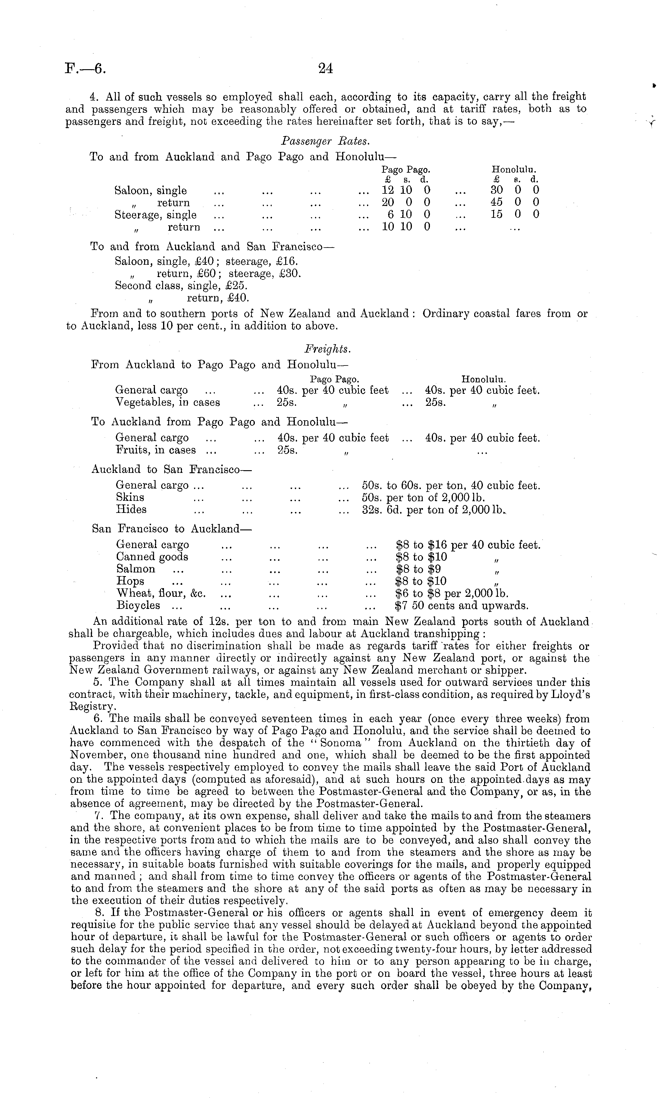 4. All of such vessels so employed shall each, according to its capacity, carry all the freight and passengers which may be reasonably offered or obtained, and at tariff rates, both as to passengers and freight, not exceeding the rates hereinafter set forth, that is to say,— Passenger Bates. To and from Auckland and Pago Pago and Honolulu— Pago Pago. Honolulu. £ s. d. £ a. d. Saloon, single ... ... ... ... 12 10 0 ... 30 0 0 return ... ... ... ... 20 0 0 ... 45 0 0 Steerage, single ... ... ... ... 610 0 ... 15 0 0 return ... ... ... ... 10 10 0 To and from Auckland and San Francisco— Saloon, single, £40; steerage, £16. „ return, £60; steerage, £30. Second class, single, £25. „ return, £40. Prom and to southern ports of New Zealand and Auckland : Ordinary coastal fares from or to Auckland, less 10 per cent., in addition to above. Freights. Prom Auckland to Pago Pago and Honolulu— Pago Pago. Honolulu. General cargo ... ... 40s. per 40 cubic feet ... 40s. per 40 cubic feet. Vegetables, in cases ... 255. „ ... 255. „ To Auckland from Pago Pago and Honolulu— General cargo ... ... 40s. per 40 cubic feet ... 40s. per 40 cubic feet. Fruits, in cases ... ... 255. „ Auckland to San Francisco— General cargo ... ... ... ... 50s. to 60s. per ton, 40 cubic feet. Skins ... ... ... ... 50s. per ton of 2,0001b. Hides ... ... ... ... 325. 6d. per ton of 2,0001b. San Francisco to Auckland— General cargo ... ... ... ... $8 to $16 per 40 cubic feet. Canned goods ... ... ... ... $8 to $10 „ Salmon ... ... ... ... ... $8 to $9 Hops ... ... ... ... ... $8 to $10 Wheat, flour, &c. ... ... ... ... $6 to $8 per 2,0001b. Bicycles ... ... ... ... ... $7 50 cents and upwards. An additional rate of 12s. per ton to and from main New Zealand ports south of Auckland shall be chargeable, which includes dues and labour at Auckland transhipping : Provided that no discrimination shall be made as regards tariff rates for either freights or passengers in any manner directly or indirectly against any New Zealand port, or against the New Zealand Government railways, or against any New Zealand merchant or shipper. 5. The Company shall at all times maintain all vessels used for outward services under this contract, with their machinery, tackle, and equipment, in first-class condition, as required by Lloyd's Eegistry. 6. The mails shall be conveyed seventeen times in each year (once every three weeks) from Auckland to San Francisco by way of Pago Pago and Honolulu, and the service shall be deemed to have commenced with the despatch of the " Sonoma " from Auckland on the thirtieth day of November, one thousand nine hundred and one, which shall be deemed to be the first appointed day. The vessels respectively employed to convey the mails shall leave the said Port of Auckland on the appointed days (computed as aforesaid), and at such hours on the appointed.days as may from time to time be agreed to between the Postmaster-General and the Company ( or as, in the absence of agreement, may be directed by the Postmaster-General. 7. The company, at its own expense, shall deliver and take the mails to and from the steamers and the shore, at convenient places to be from time to time appointed by the Postmaster-General, in the respective ports from and to which the mails are to be conveyed, and also shall convey the same and the officers having charge of them to and from the steamers and the shore as may be necessary, in suitable boats furnished with suitable coverings for the mails, and properly equipped and manned ; and shall from time to time convey the officers or agents of the Postmaster-General to and from the steamers and the shore at any of the said ports as often as may be necessary in the execution of their duties respectively. 8. If the Postmaster-General or his officers or agents shall in event of emergency deem it requisite for the public service that any vessel should be delayed at Auckland beyond the appointed hour of departure, it shall be lawful for the Postmaster-General or such officers or agents to order such delay for the period specified in the order, not exceeding twenty-four hours, by letter addressed to the commander of the vessel and delivered to him or to any person appearing to be in charge, or left for him at the office of the Company in the port or on board the vessel, three hours at least before the hour appointed for departure, and every such order shall be obeyed by the Company,