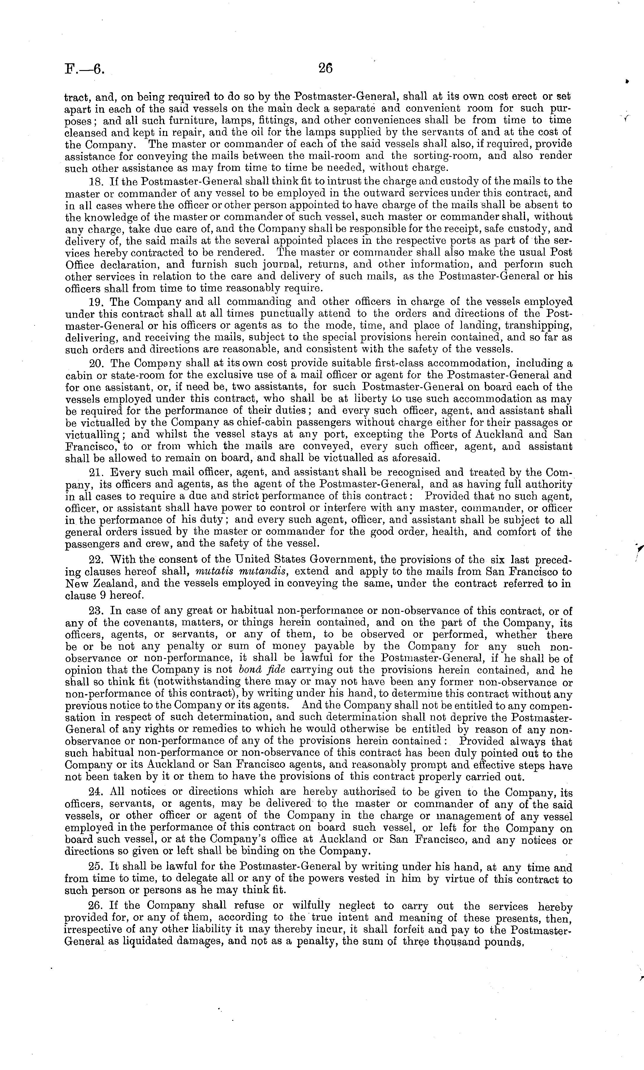 tract, and, on being required to do so by the Postmaster-General, shall at its own cost erect or set apart in each of the said vessels on the main deck a separate and convenient room for such purposes ; and all such furniture, lamps, fittings, and other conveniences shall be from time to time cleansed and kept in repair, and the oil for the lamps supplied by the servants of and at the cost of the Company. The master or commander of each of the sa.id vessels shall also, if required, provide assistance for conveying the mails between the mail-room and the sorting-room, and also render such other assistance as may from time to time be needed, without charge. 18. If the Postmaster-General shall think fit to intrust the charge and custody of the mails to the master or commander of any vessel to be employed in the outward services under this contract, and iti all cases where the officer or other person appointed to have charge of the mails shall be absent to the knowledge of the master or commander of such vessel, such master or commander shall, without any charge, take due care of, and the Company shall be responsible for the receipt, safe custody, and delivery of, the said mails at the several appointed places in the respective ports as part of the services hereby contracted to be rendered. The master or commander shall also make the usual Post Office declaration, and furnish such journal, returns, and other information, and perform such other services in relation to the care and delivery of such mails, as the Postmaster-General or his officers shall from time to time reasonably require. 19. The Company and all commanding and other officers in charge of the vessels employed under this contract shall at all times punctually attend to the orders and directions of the Post-master-General or his officers or agents as to the mode, time, and place of landing, transhipping, delivering, and receiving the mails, subject to the special provisions herein contained, and so far as such orders and directions are reasonable, and consistent with the safety of the vessels. 20. The Company shall at its own cost provide suitable first-class accommodation, including a cabin or state-room for the exclusive use of a mail officer or agent for the Postmaster-General and for one assistant, or, if need be, two assistants, for such Postmaster-General on board each of the vessels employed under this contract, who shall be at liberty to use such accommodation as may be required for the performance of their duties; and every such officer, agent, and assistant shall be victualled by the Company as chief-cabin passengers without charge either for their passages or victualling; and whilst the vessel stays at any port, excepting the Ports of Auckland and San Francisco, to or from which the mails are conveyed, every such officer, agent, and assistant shall be allowed to remain on board, and shall be victualled as aforesaid. 21. Every such mail officer, agent, and assistant shall be recognised and treated by the Company, its officers and agents, as the agent of the Postmaster-General, and as having full authority in all cases to require a due and strict performance of this contract: Provided that no such agent, officer, or assistant shall have power to control or interfere with any master, commander, or officer in the performance of his duty; and every such agent, officer, and assistant shall be subject to all general orders issued by the master or commander for the good order, health, and comfort of the passengers and crew, and the safety of the vessel. 22. With the consent of the United States Government, the provisions of the six last preceding clauses hereof shall, mutatis mutandis, extend and apply to the mails from San Francisco to New Zealand, and the vessels employed in conveying the same, under the contract referred to in clause 9 hereof. 23. In case of any great or habitual non-performance or non-observance of this contract, or of any of the covenants, matters, or things herein contained, and on the part of the Company, its officers, agents, or servants, or any of them, to be observed or performed, whether there be or be not any penalty or sum of money payable by the Company for any such nonobservance or non-performance, it shall be lawful for the Postmaster-General, if he shall be of opinion that the Company is not bond fide carrying out the provisions herein contained, and he shall so think fit (notwithstanding there may or may not have been any former non-observance or non-performance of this contract), by writing under his hand, to determine this contract without any previous notice to the Company or its agents. And the Company shall not be entitled to any compensation in respect of such determination, and such determination shall not deprive the PostmasterGeneral of any rights or remedies to which he would otherwise be entitled by reason of any nonobservance or non-performance of any of the provisions herein contained : Provided always that such habitual non-performance or non-observance of this contract has been duly pointed out to the Company or its Auckland or San Francisco agents, and reasonably prompt and effective steps have not been taken by it or them to have the provisions of this contract properly carried out. 24. All notices or directions which are hereby authorised to be given to the Company, its officers, servants, or agents, may be delivered to the master or commander of any of the said vessels, or other officer or agent of the Company in the charge or management of any vessel employed in the performance of this contract on board such vessel, or left for the Company on board such vessel, or at the Company's office at Auckland or San Francisco, and any notices or directions so given or left shall be binding on the Company. 25. It shall be lawful for the Postmaster-General by writing under his hand, at any time and from time to time, to delegate all or any of the powers vested in him by virtue of thi